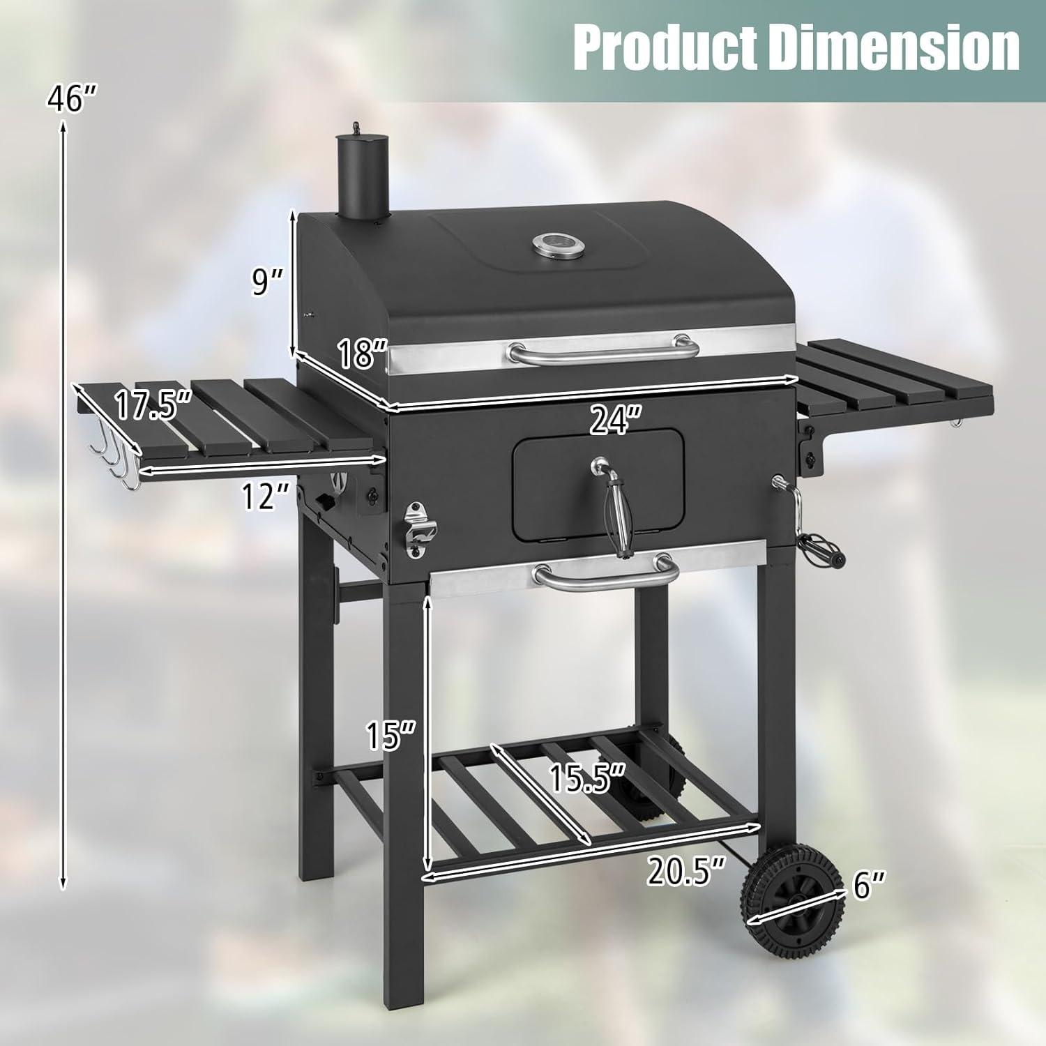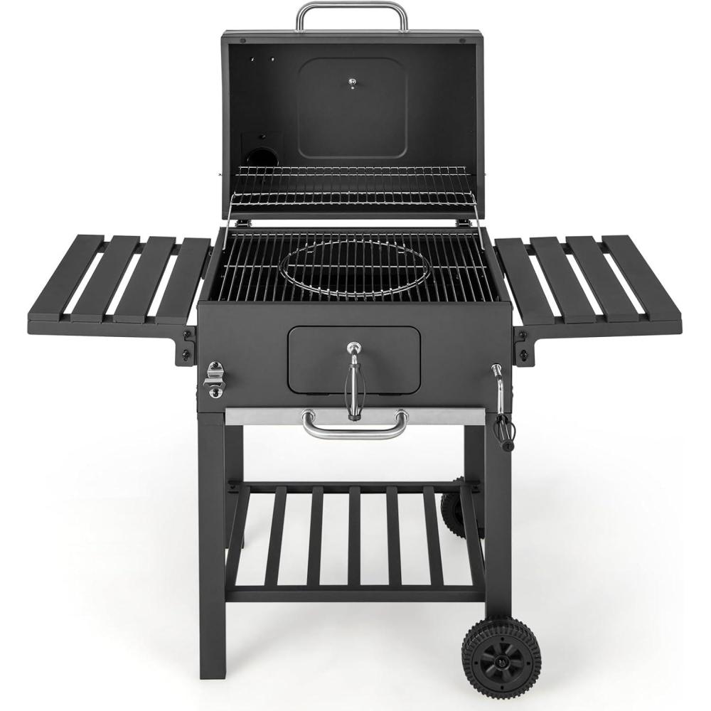 Enhance your outdoor cooking experience with this high-quality steel charcoal grill featuring 2 wheels, perfect for BBQ parties, picnics, and more. With a spacious cooking area and warming rack, this grill meets all your cooking needs. It also includes foldable side tables, hooks, and a bottom shelf for convenient storage of essentials. The adjustable chimney and air vents ensure proper ventilation and heat control, while the lid-mounted temperature gauge allows you to monitor heat levels. Easily customize your cooking experience with the adjustable height charcoal tray.
