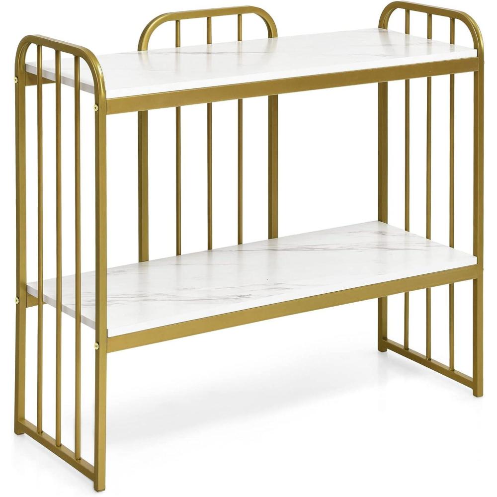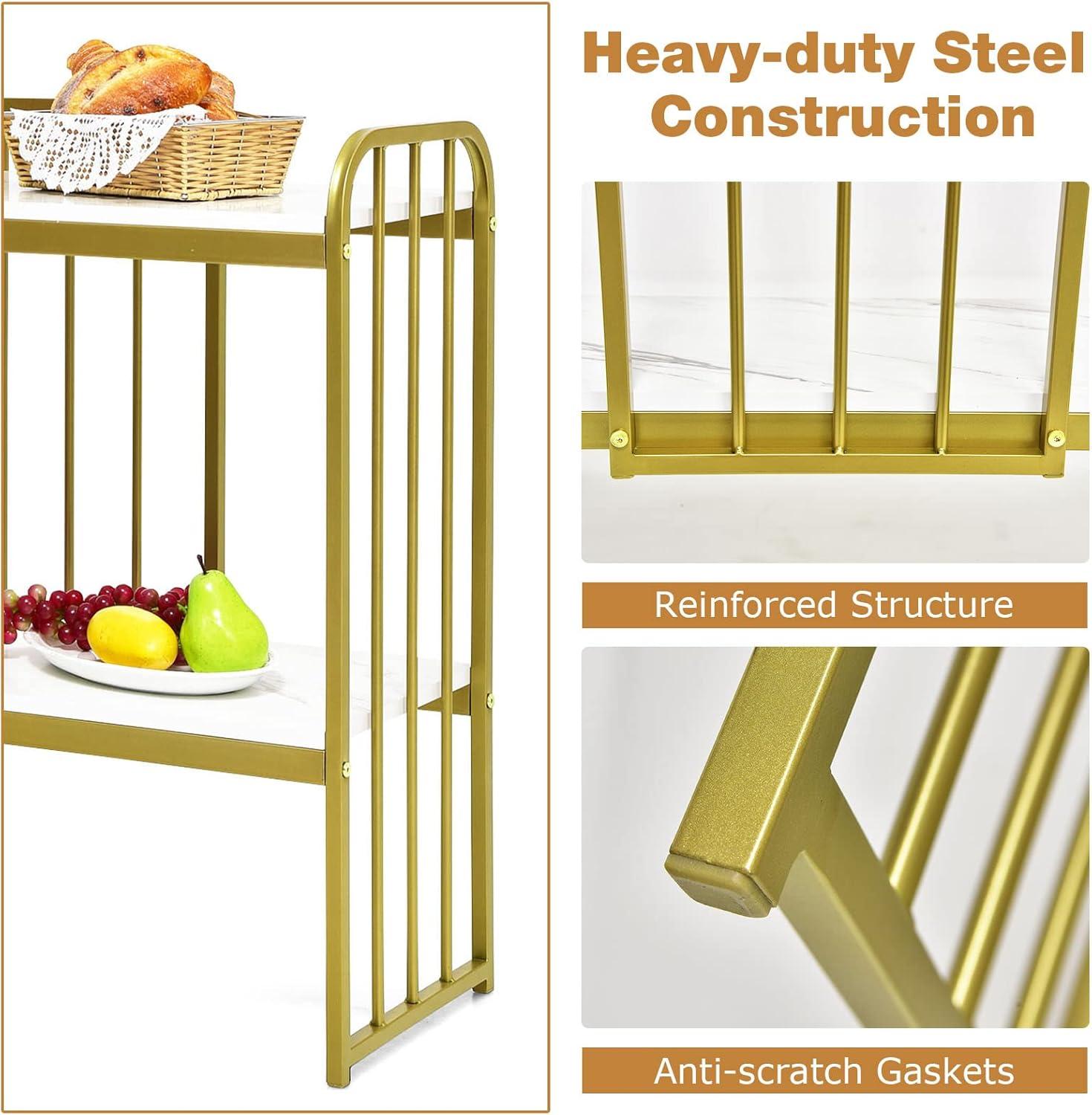 The console table with stunning minimalist design is a great complement to your living space that once again highlights your taste. The elegant marble-like surface and glossy golden frame are combined to create a luxurious and stylish appearance. Equipped with 2 open shelves, it is a good console to be placed beside the couch or along the hallway, displaying your loved ornaments, photos and flowers. What’s more, the sofa table is made of high-quality MDF and thickened steel pipes, so that is rather durable and sturdy.And with non-scratch gaskets, you don’t have to worry about that the metal feet would damage your floor. Don’t hesitate to add it to your cart!