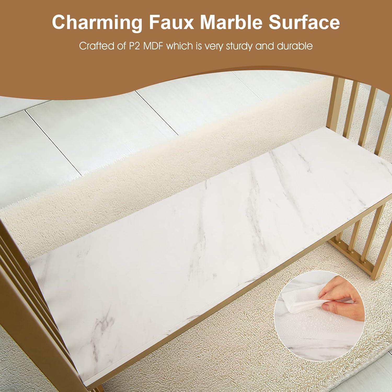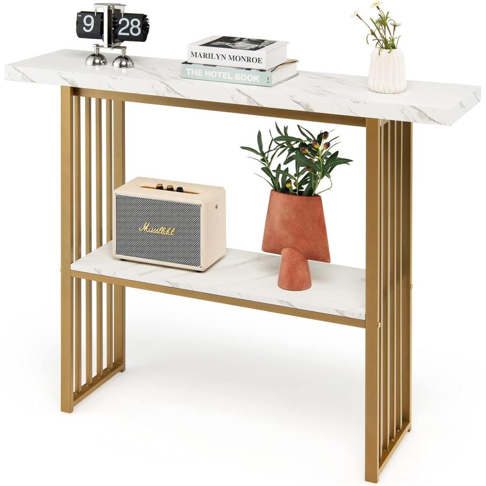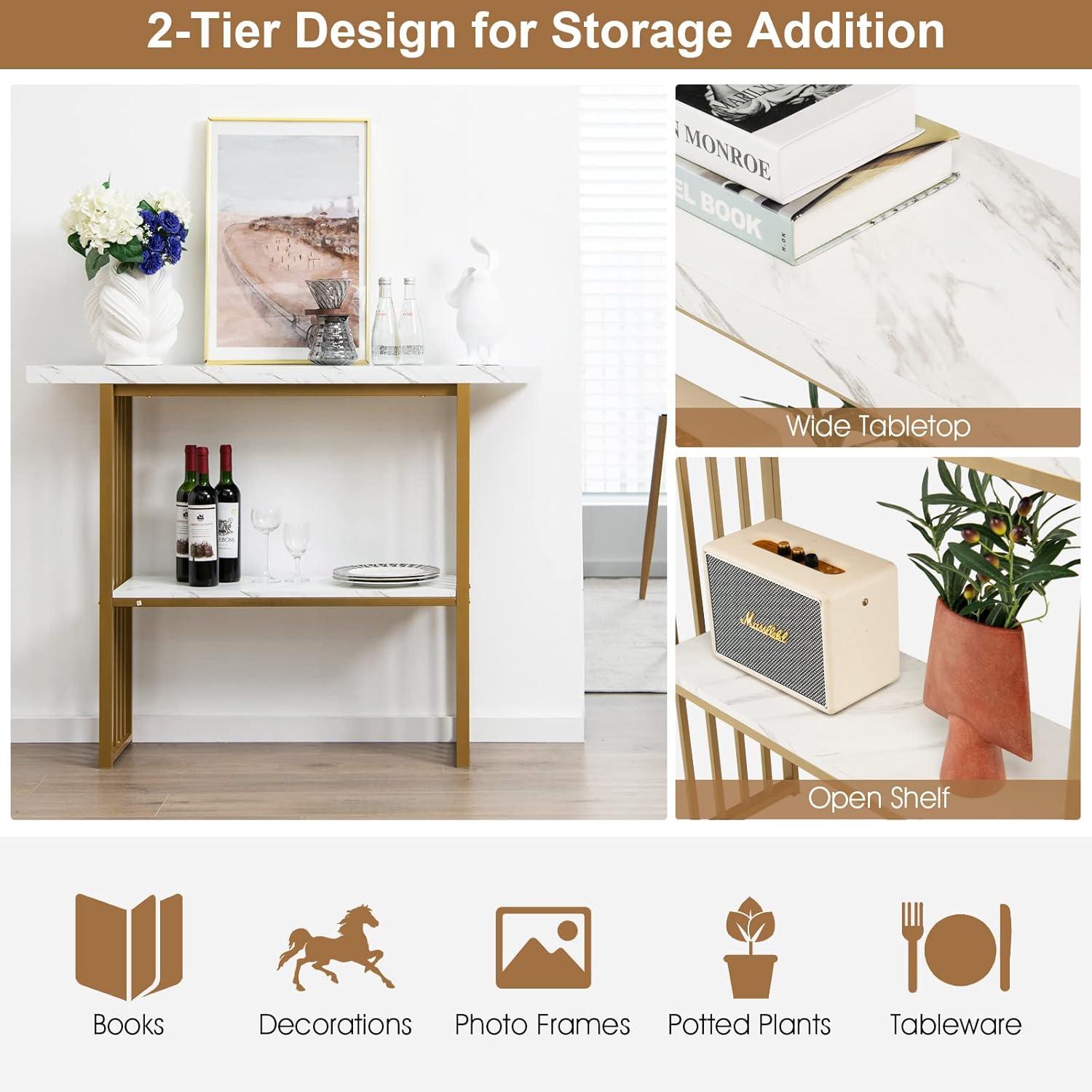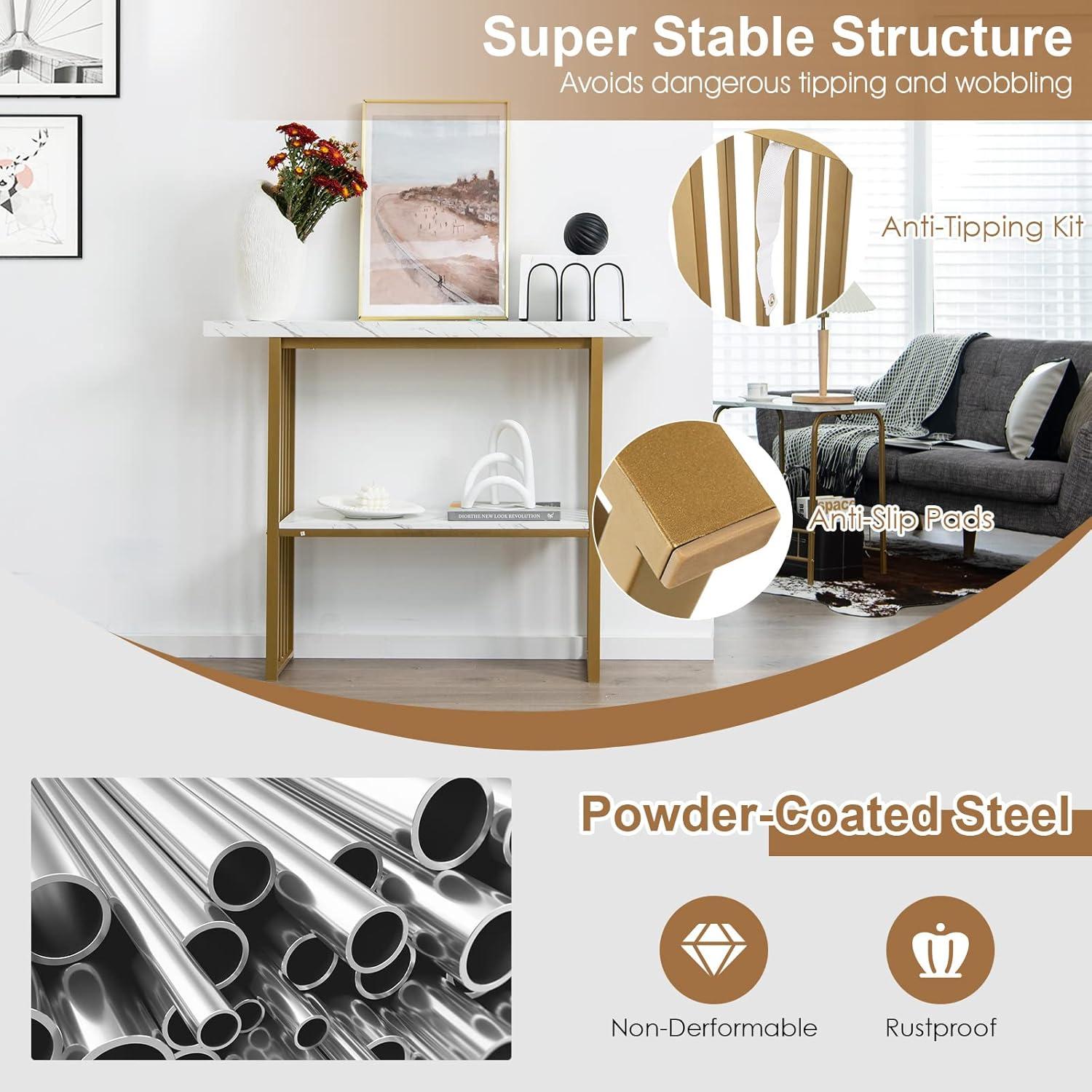 Our console table perfectly combines elegant design and sufficient storage. Its gold frame is composed of thicken steel tubes which is not only rustproof for durability but also sturdy for a strong load capacity. More, two faux marble shelves are made of P2 MDF presenting an extended service life. What’s more, the console table is fitted with an anti-toppling device to avoid sudden tipping, which is very suitable for family with kids. The anti-slip pads highly avoid scratches on the floor. Depending on your needs, the 48” x 11.5” x 36.5” console table can work well as a sofa side table, an entryway table, a dining room shelf or a kitchen shelf.