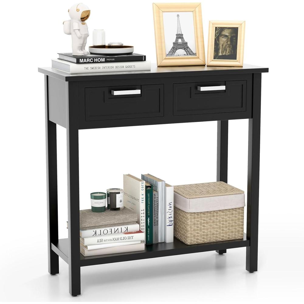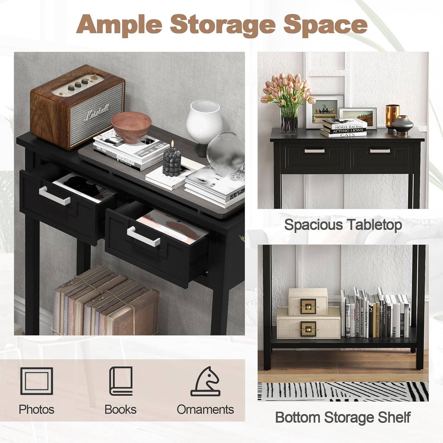 Narrow Console Table with Storage: The 31.5″L x 14″W x 32″H entryway table fits limited room yet to bring ample storage space. It features a spacious tabletop, 2 pull-out drawers and a bottom storage shelf to meet storage or display needs.