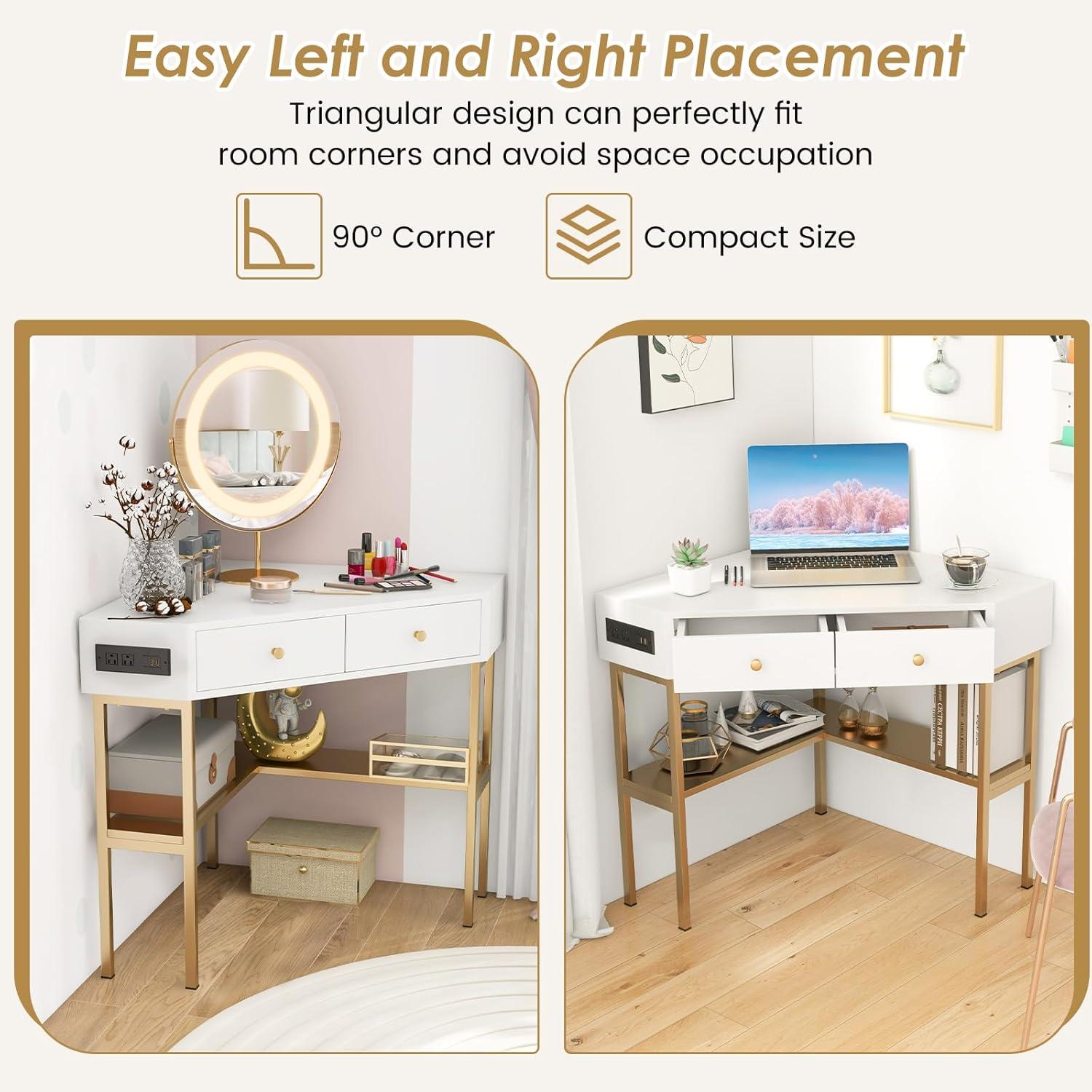 Giantex Corner Desk with Charging Station, 90 Degree Triangle Computer Desk with 2 Drawers & Storage Shelf, L-Shaped Writing Desk Makeup Vanity Table, Compact Corner Desk for Small Spaces (Gold)(White)