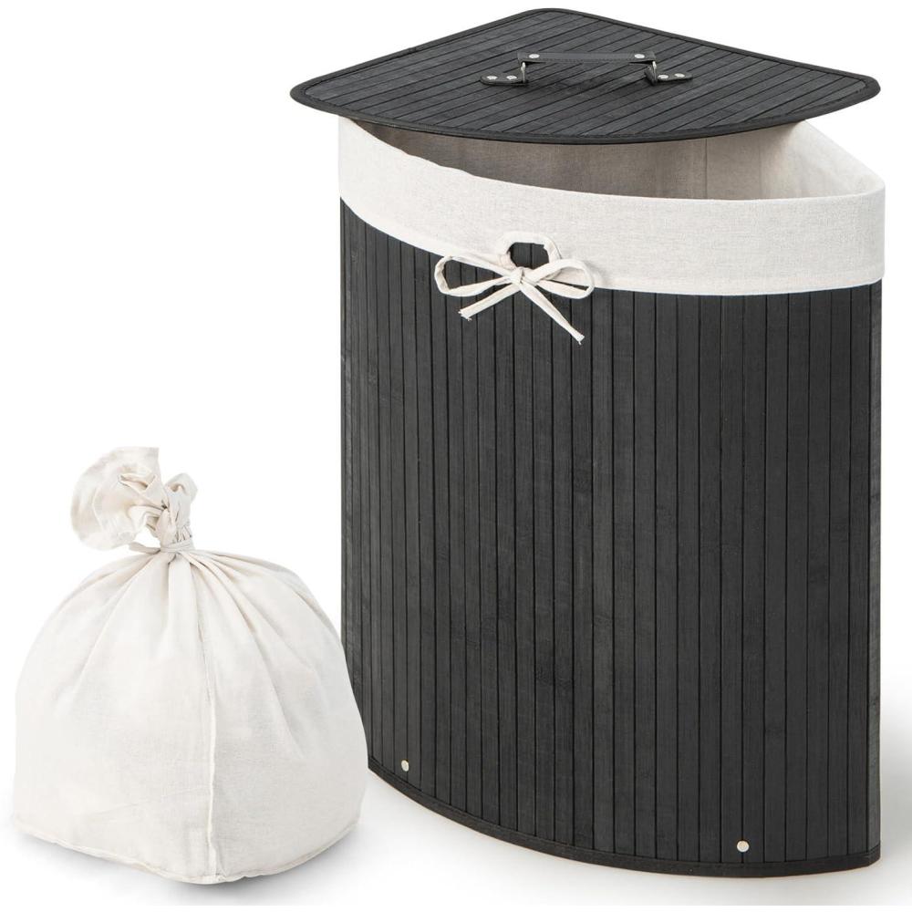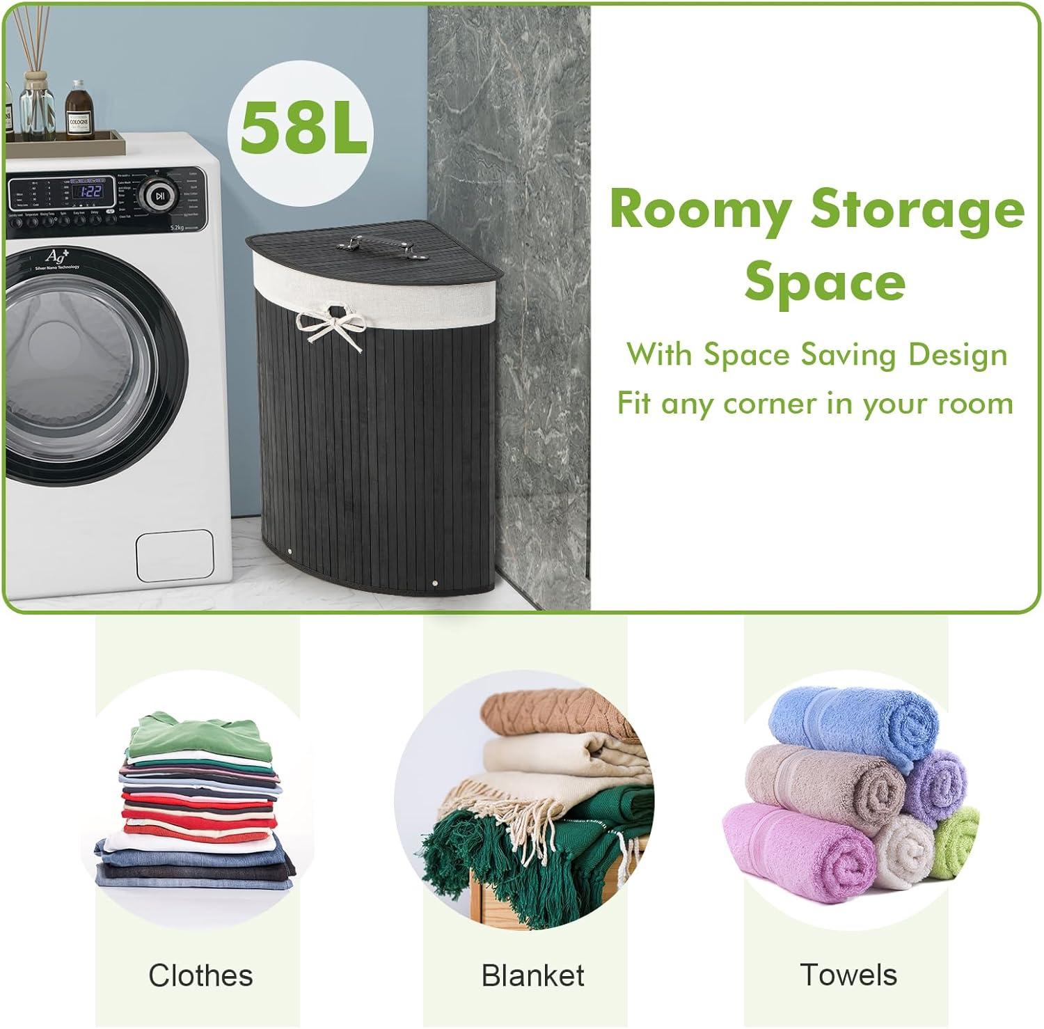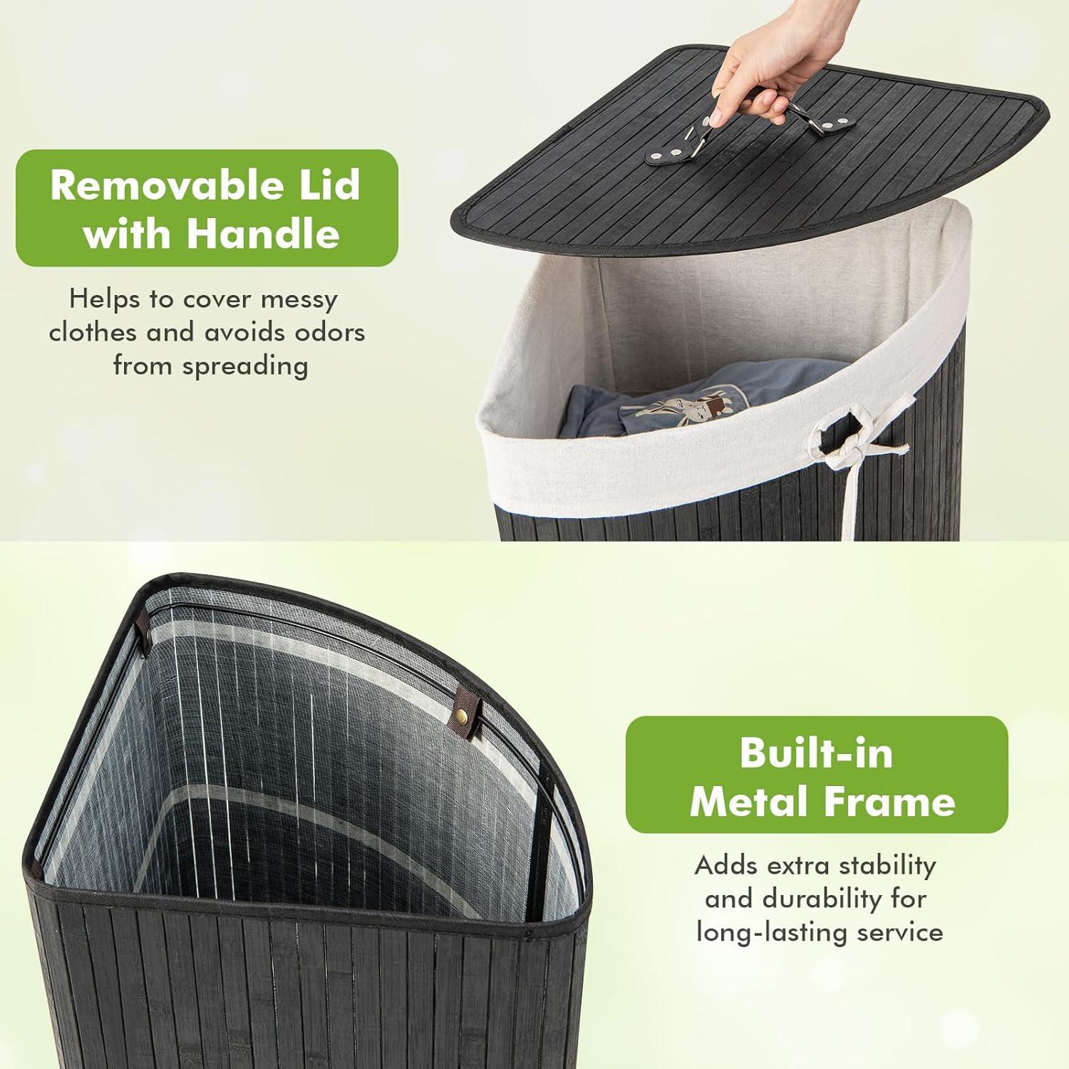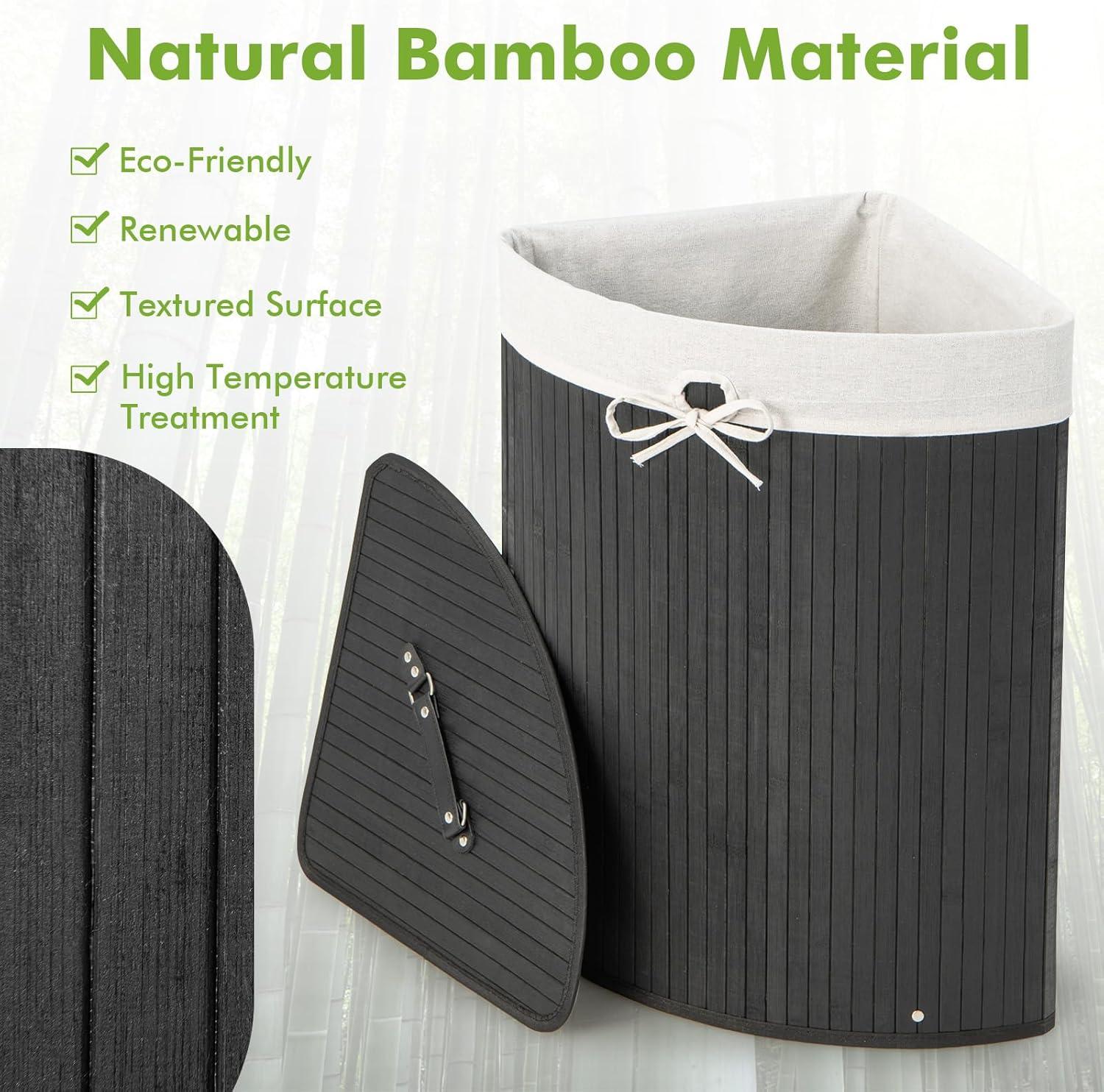 Giantex Corner Laundry Hamper with Lid, 58 L Bamboo Laundry Basket with Removable Liner & Handle, Triangle Clothes Hamper for Small Spaces, Bedroom, Bathroom, Laundry & Living Room (Brown)(Black)