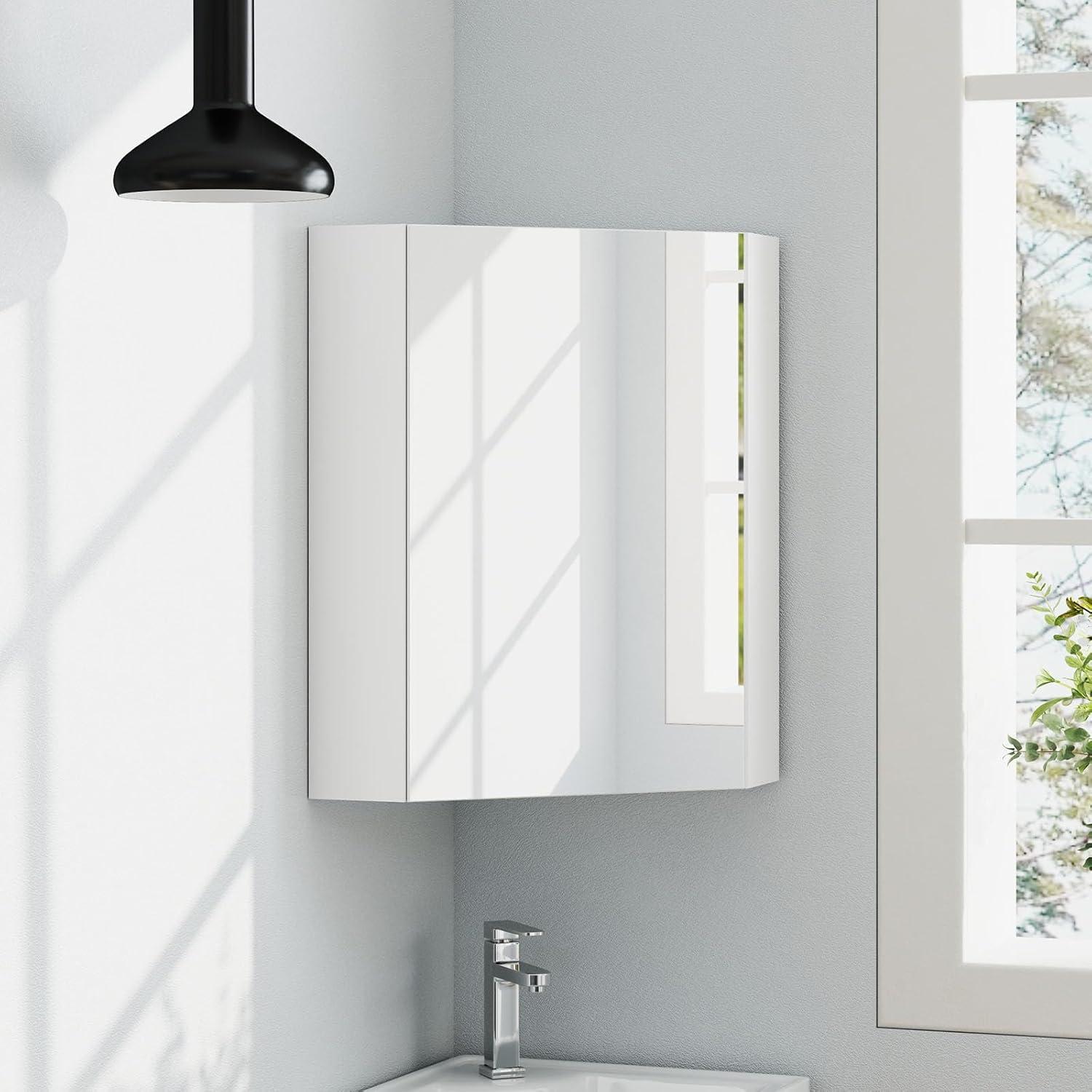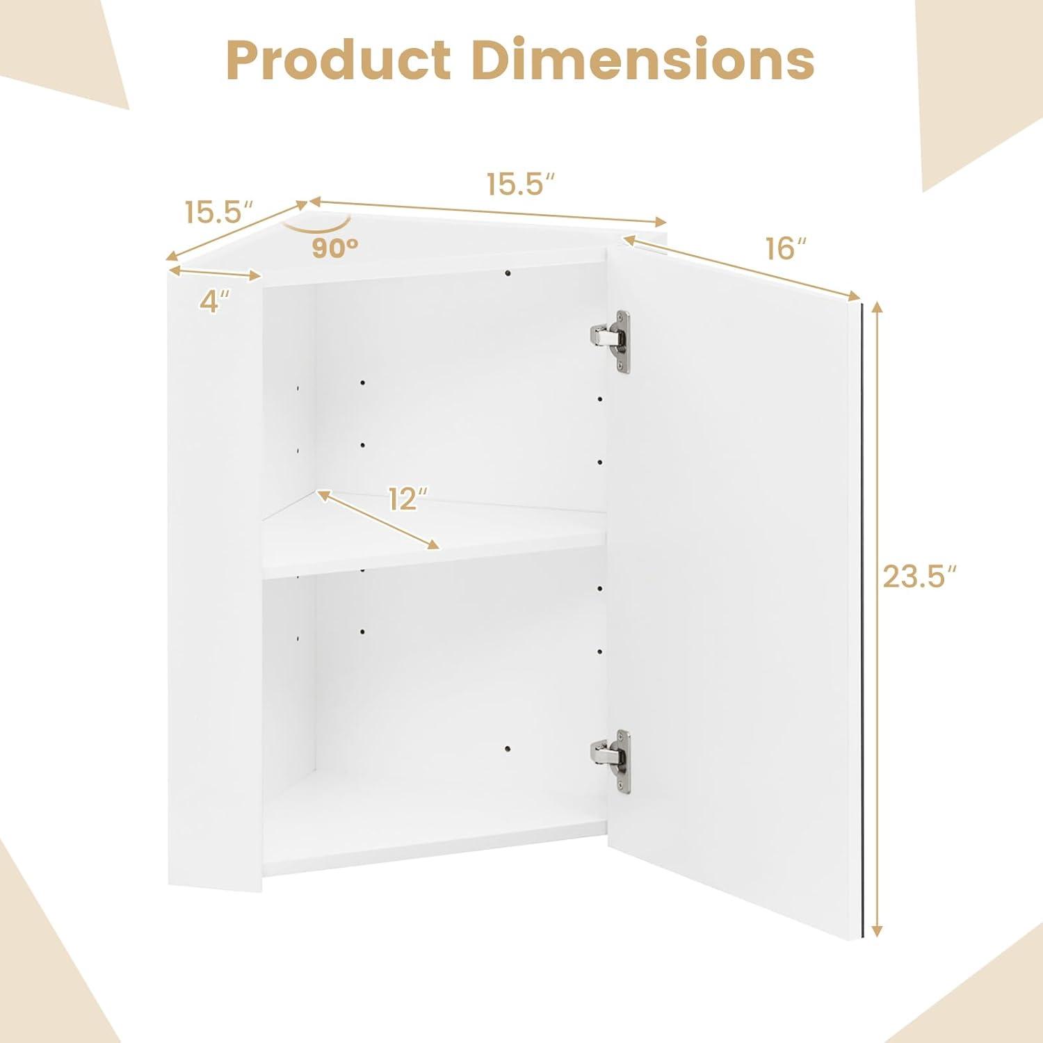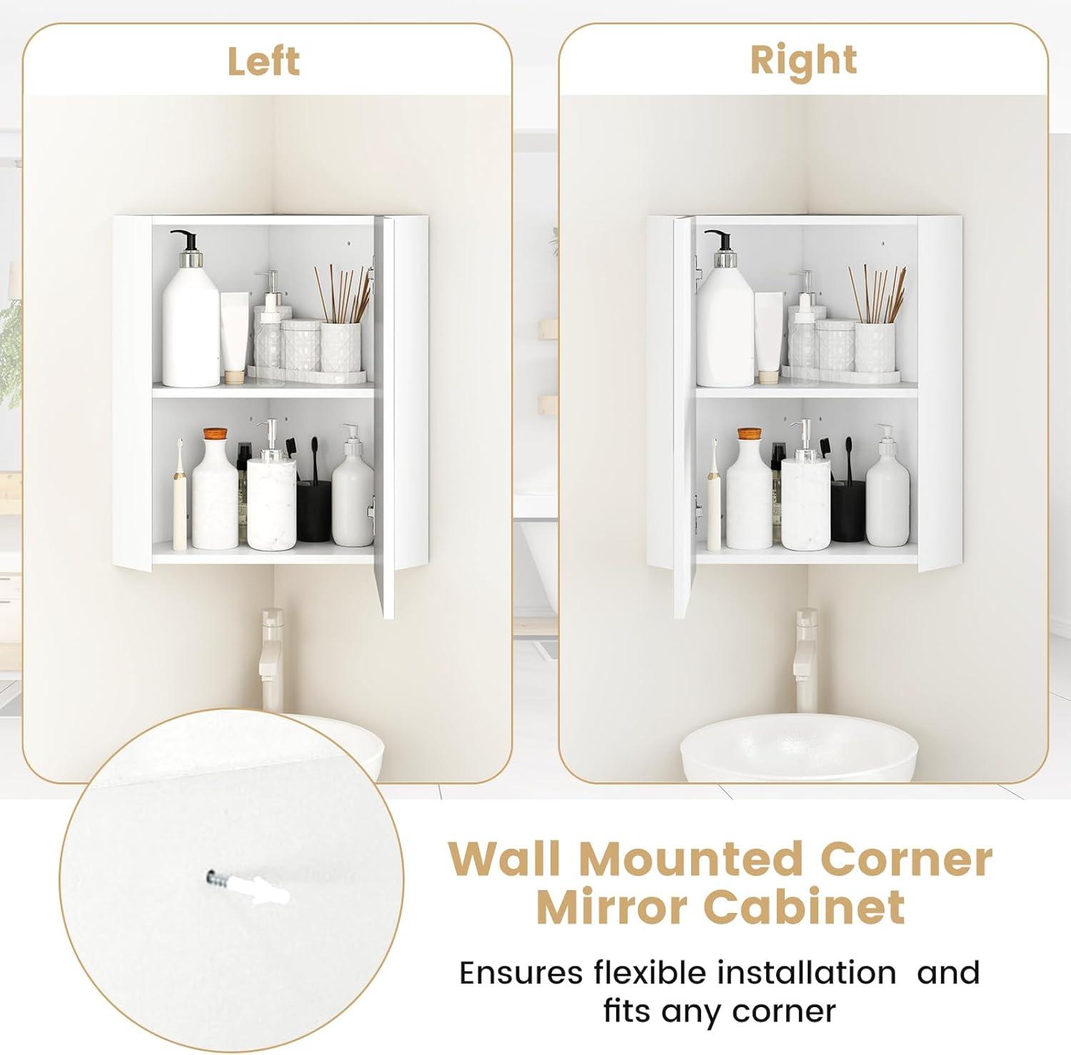 [Flexible Wall Mounting]: Includes expansion screws and a user manual for quick and effortless wall mounting. The corner cabinet measures 15.5″ x 15.5″ x 23.5″ (L x W x H) and can be installed with the mirror door opening on the left or right.