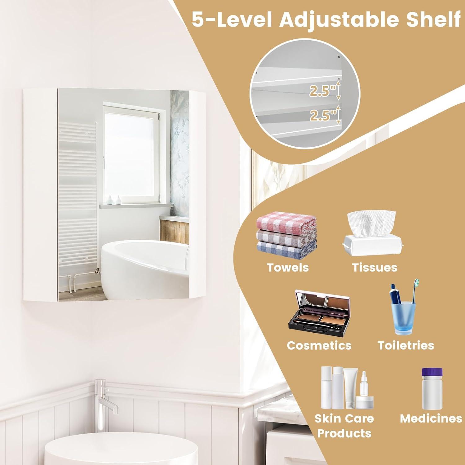 [Customize Your Storage Space]: The corner wall mounted cabinet features a 5-level adjustable shelf, providing flexibility to accommodate items of varying heights. Each shelf has a 2.5″ gap for organizing towels, tissues, cosmetics, toiletries, skincare products, and medications.
