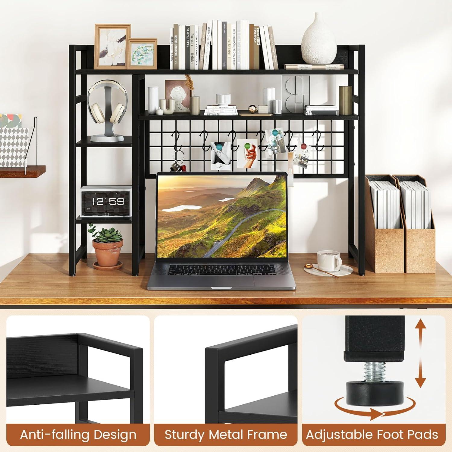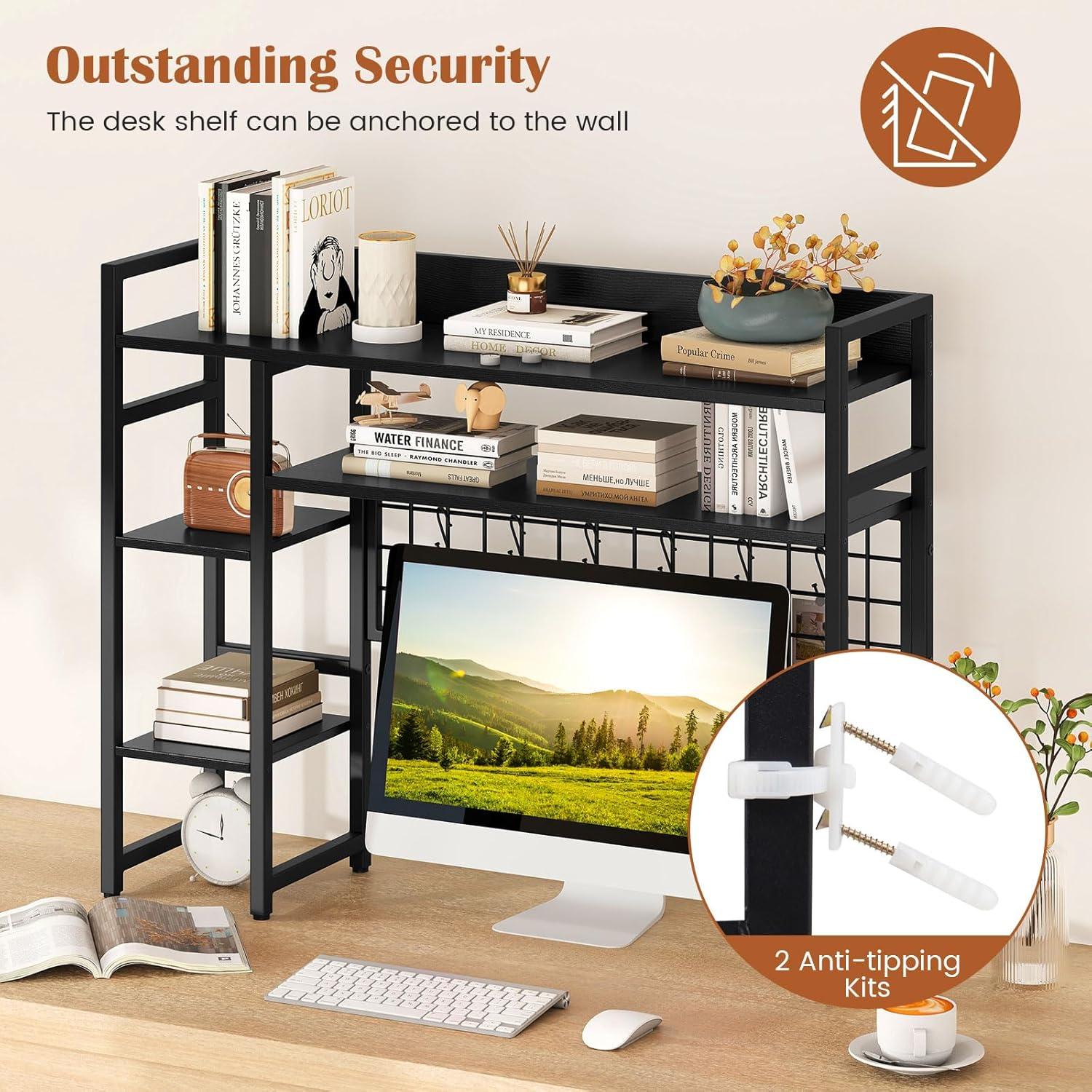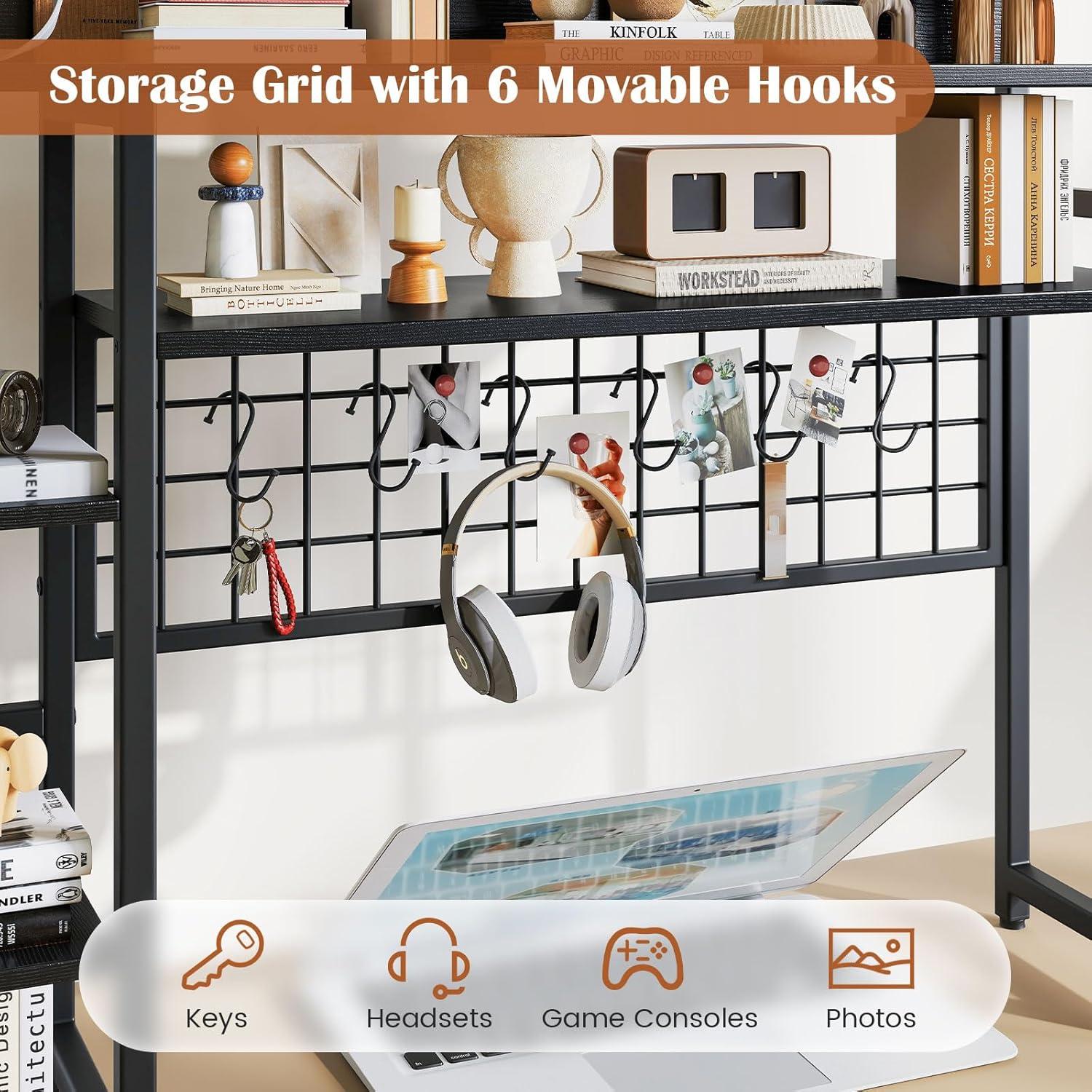 Storage Grid with 6 Hooks: Equipped with a practical storage grid, the countertop hutch is perfect for organizing game consoles, headsets, keys, photos and more, providing a neat look and easy access. Besides, the 6 movable hooks offer flexibility and convenience.