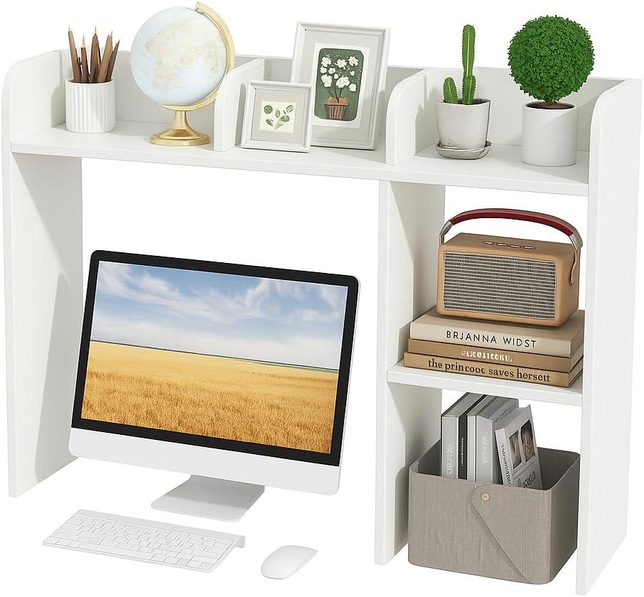 [Ideal Desktop Organizer]: This desktop bookshelf features classified and spacious storage space, including the large bottom compartment and 4 storage cubbies. Therefore, the desk hutch will make your working space tidy and clean, and improve your working efficiency.