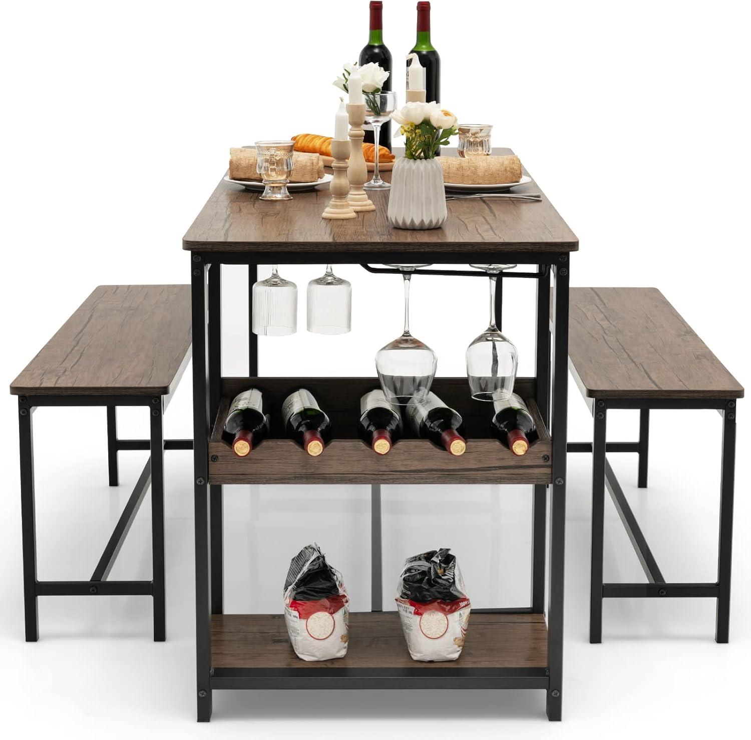 Giantex Dining Table Set for 4, 3-Piece 55" L Kitchen Table Set w/ 2 Benches, Breakfast Table w/ 5-Bottle Wine Rack & Glass Holder, Space-Saving Dinette Set for Dining Room, Kitchen, Apartment