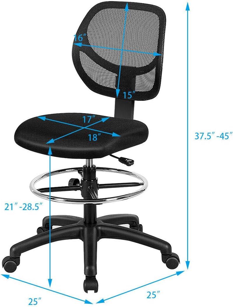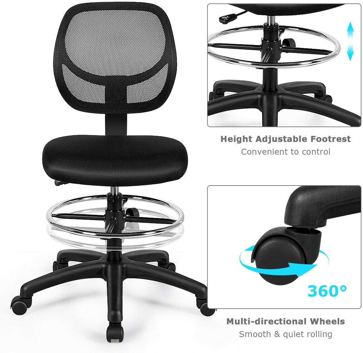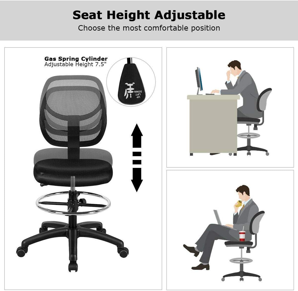 Adjustable Seat Height and Footrest: Seat height can be adjusted between 21″ to 28.5″ to meet your different needs for matching up height of desk, improving your working efficiency. The mesh drafting chair can be flexibly converted to low seats for working and high seats for leisure time. Besides, adjustable footrest allows you to sit in the most comfortable position at all times.