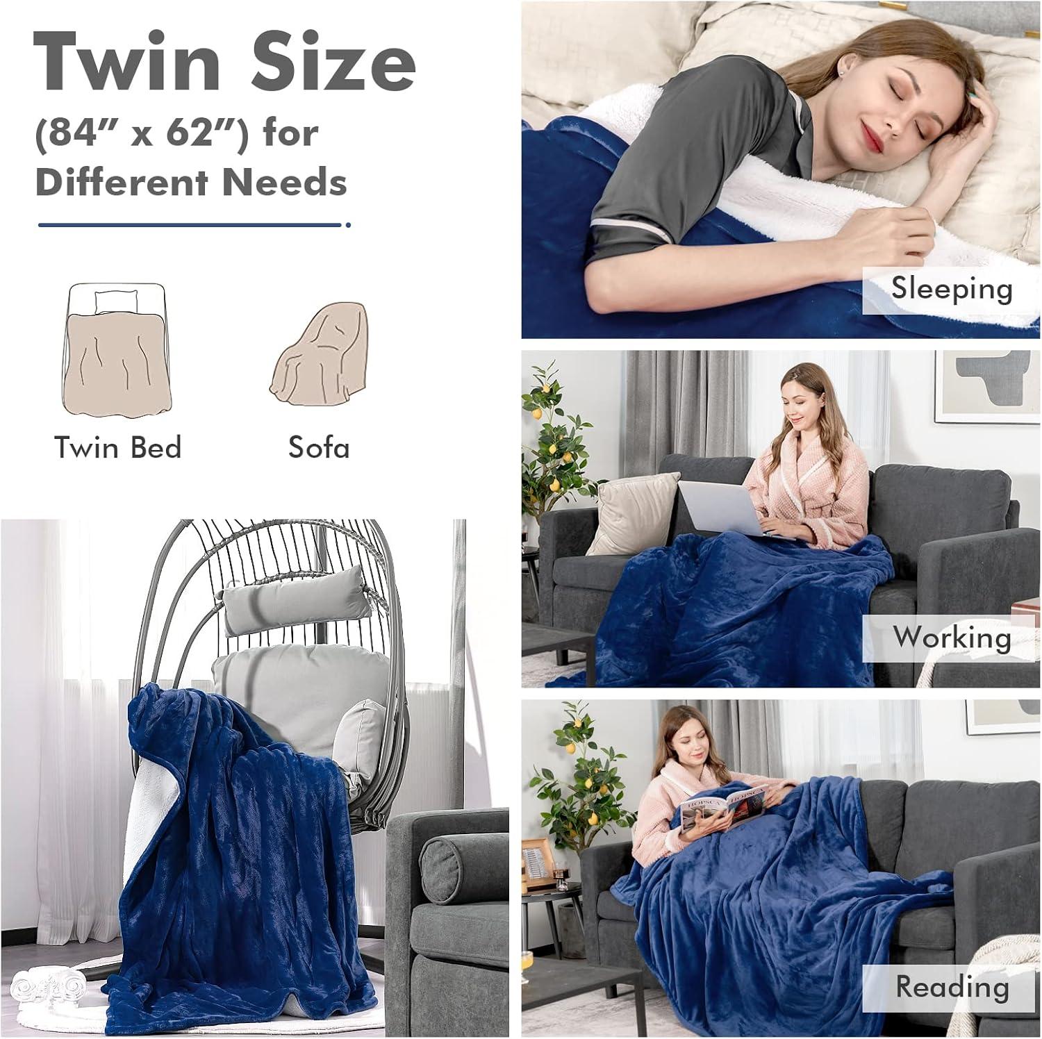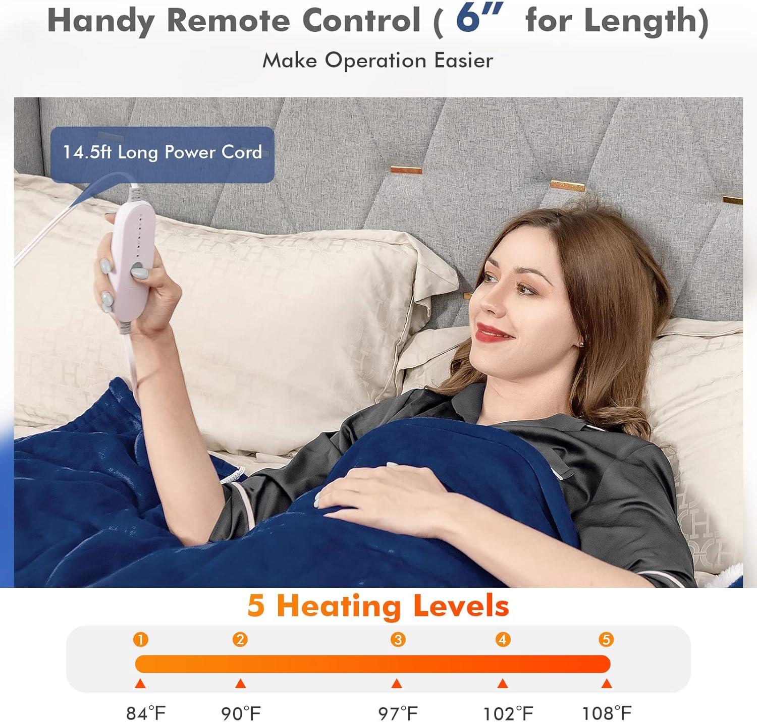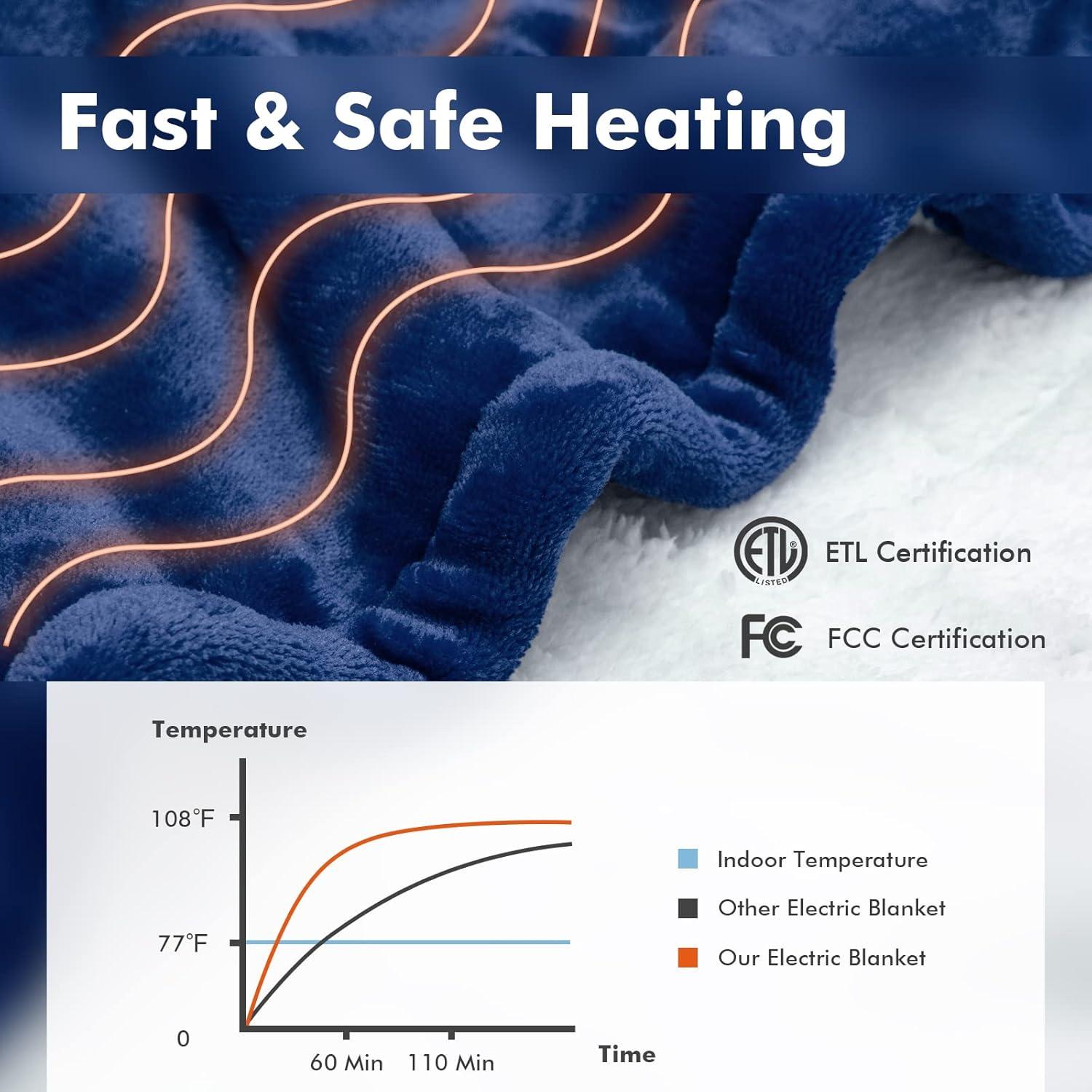 Description: Measuring 84” x 62” (L x W) in size, this heating blanket with 10H auto shut-off provides you with a large coverage area whether you are sleeping or working. And this heating blanket is constructed of a soft flannel cover, fast heating wires and skin-friendly Sherpa fabric to bring maximum comfort while distributing the heat evenly. Moreover, you can choose the suitable temperature from 5 heating levels based on your preference. And the built-in thermostat will keep the heated blanket at the temperature you set. Please don't worry about any security issues. The ETL and FCC approved heating blanket features overheat protection and electrocution prevention function for safe protection. If you want to make this heating blanket brand new, just disconnected the 14.5ft power cord and then put the blanket into the machine for easy cleaning. Features: Safe to use with overheat protection and electrocution prevention ETL certification and FCC certification for additional safety Easily adjust between 5 heat levels from 84℉ to 108℉ through the controller Will automatically shut off after 10 hours of operation Built-in thermostat for uninterrupted warmth and energy-saving Soft flannel cover and skin-friendly Sherpa fabric for ultimate comfort Flexible to use thanks to the 14.5ft power cord Disconnect the power cord for machine washing Can be used as a normal blanket by disconnecting the controller Specifications: Material: Flannel, Sherpa Fabric Size: 84” x 62” (L x W) Length of Power Cord: 14.5ft Length of Controller: 6” Net Weight: 4 lbs Voltage: 120V Frequency: 60Hz Power: 100W Package Includes: 1 x Heated Blanket 1 x Controller 1 x Instruction