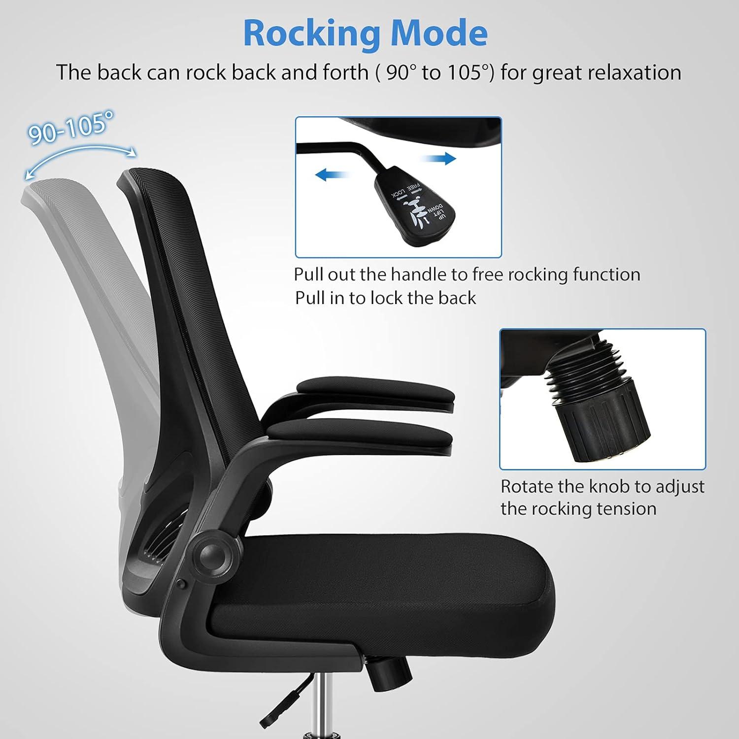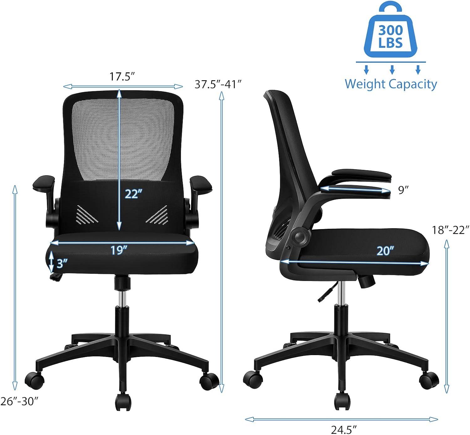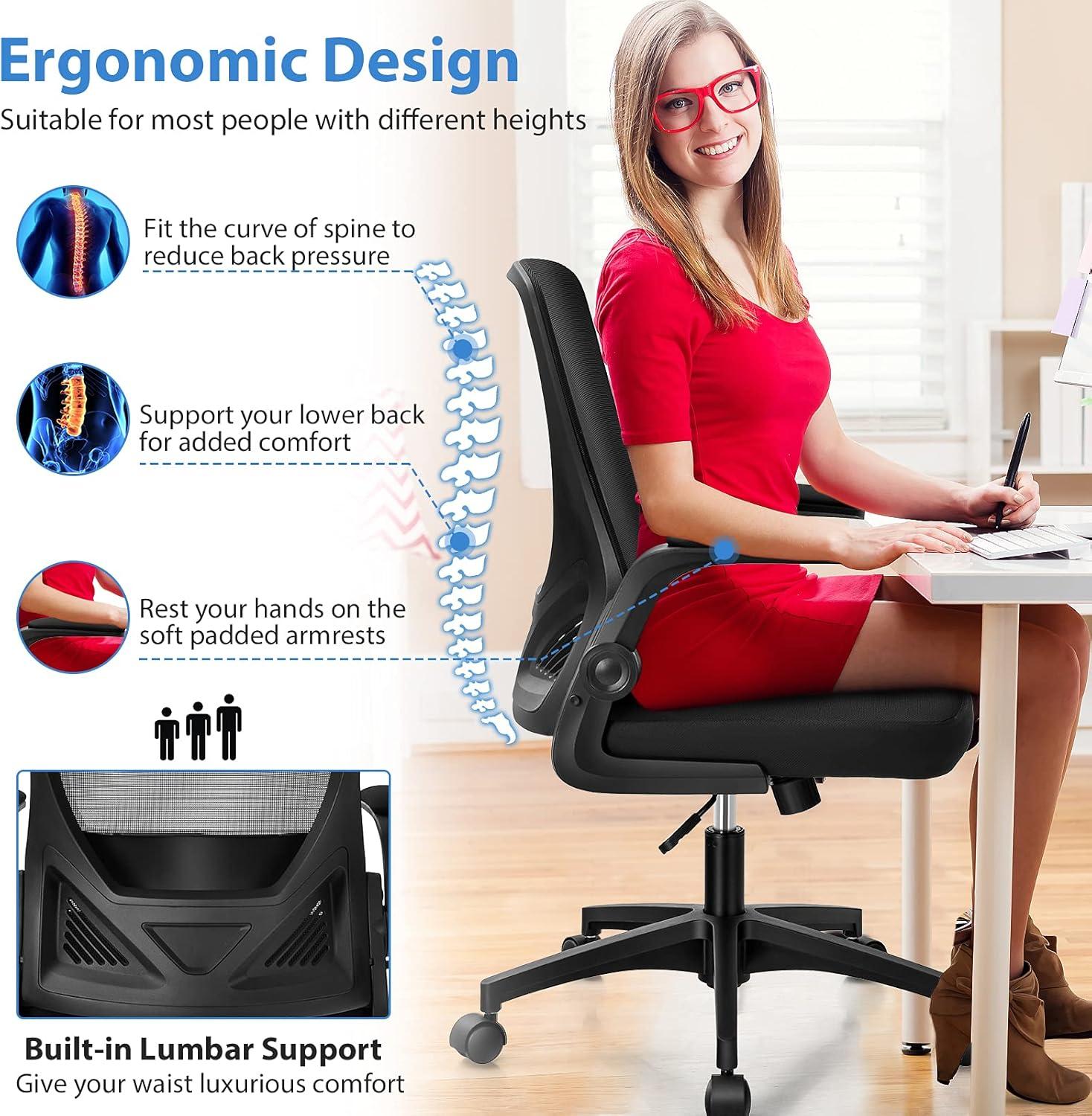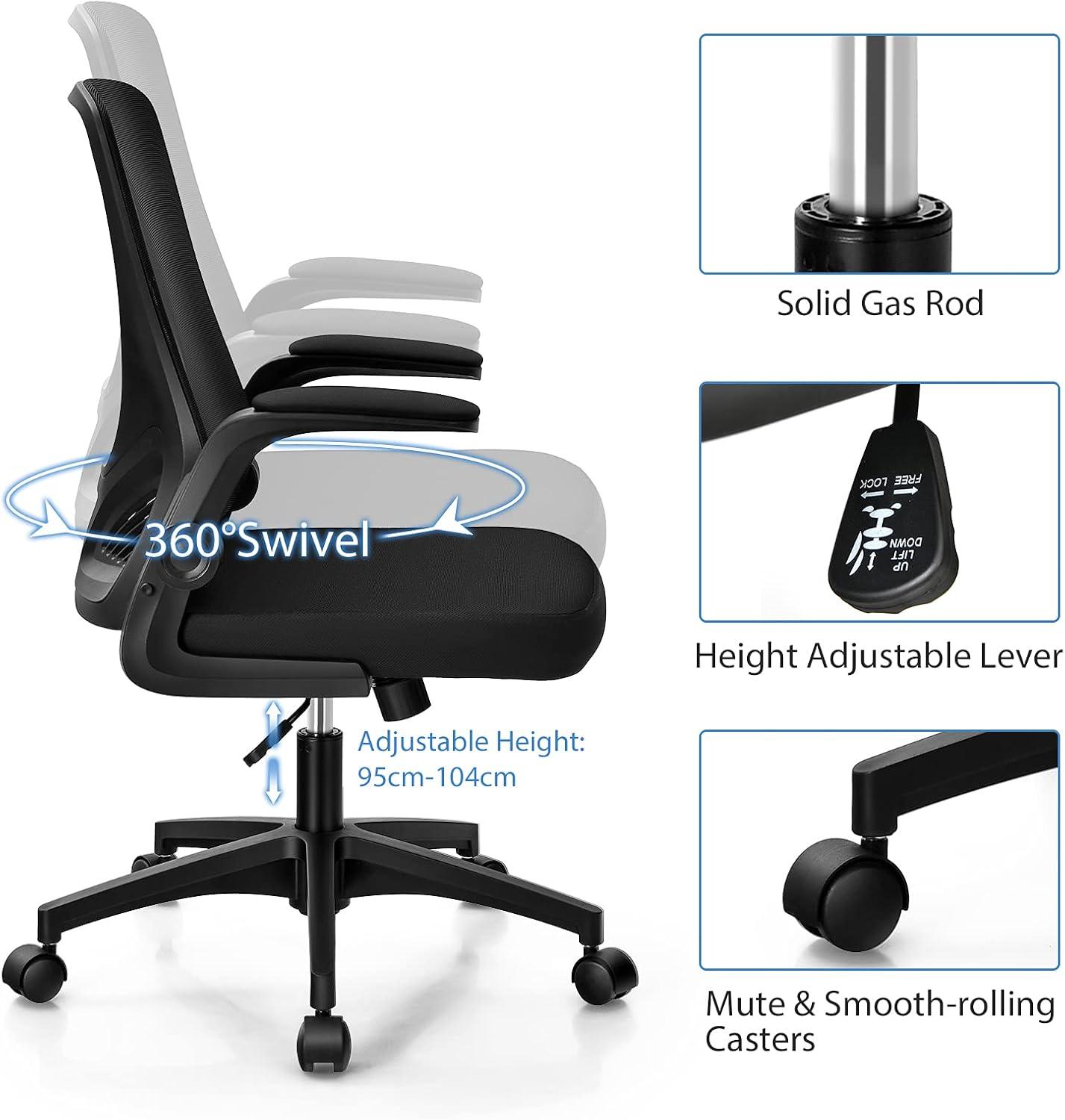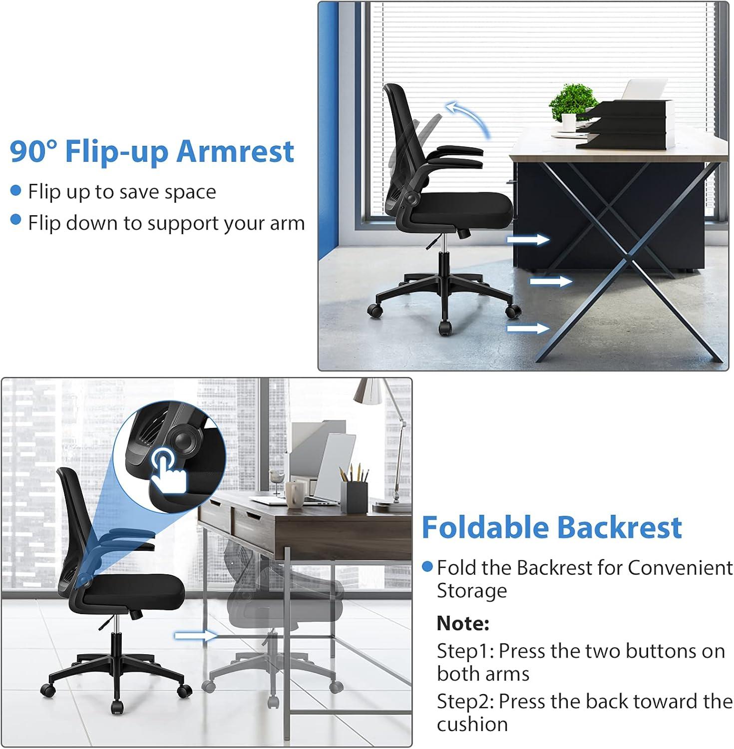 With adjustable backrest and seat, the mid back computer chair helps you find a more comfortable sitting posture to relieve stress caused by long hours of work. The ergonomically designed backrest with build-in lumbar support mitigates the tiredness of your spine and relaxes yourself. 90° flip up armrest and foldable backrest allows you to completely place the chair under the desk, without occupying too much space in your room. Highly ventilated mesh back will promote air circulation for increased breathability and super comfort. Thickened seat with high resilience cushion takes pressure off legs and improves circulation. The sturdy base with 360°mute casters ensure smooth mobility on different surfaces, thus bringing a lot of convenience in getting documents or communicating.