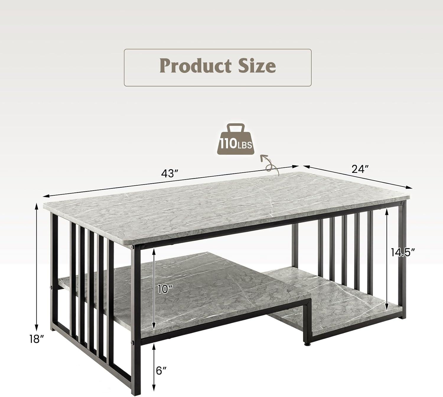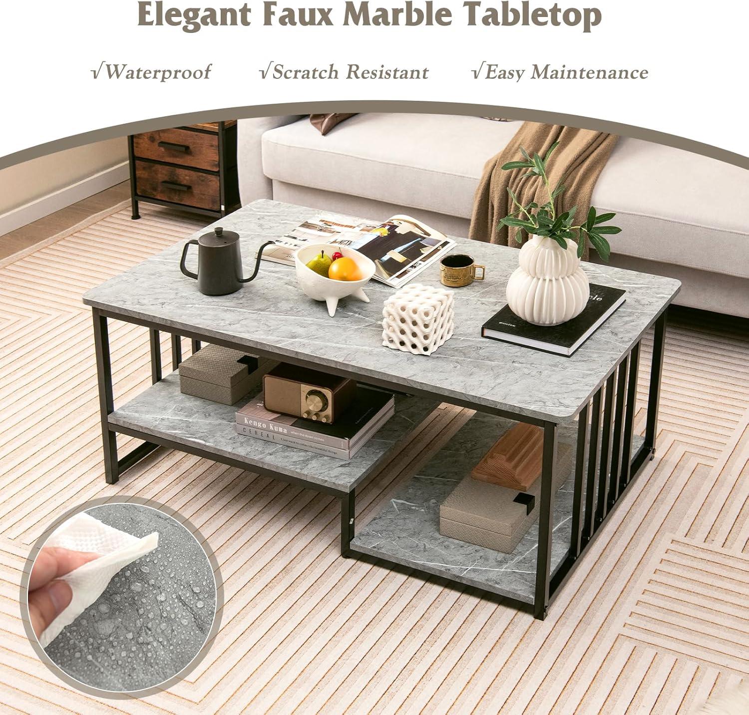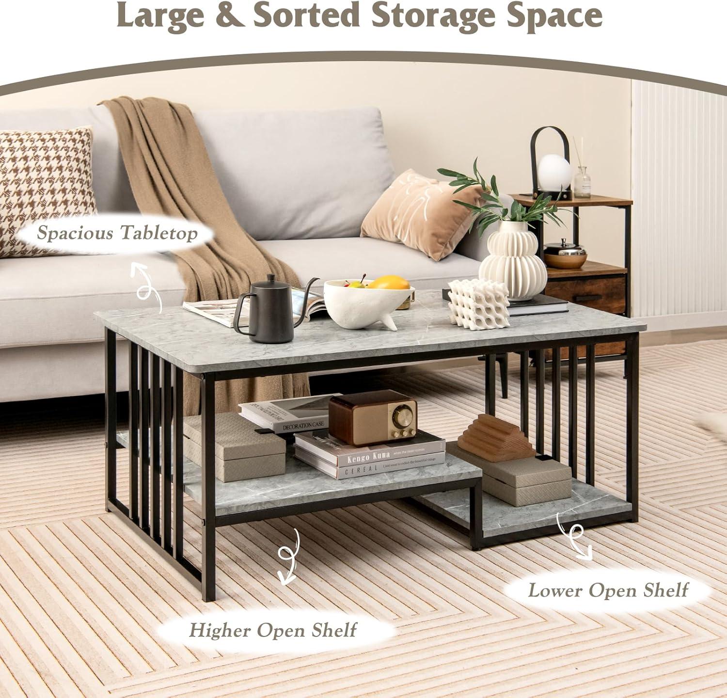 The modern coffee table is a perfect centerpiece in your home! Elegant faux marble tabletop and black finished metal frame showcase a glam and modern look. Wide top surface and open shelves can meet the needs of storage & display, keeping your room organized. For reliable structure, the center table is crafted of rigid metal tubes to ensure great stability and durability. More, the combination of style and practicality enables the coffee table an ideal addition for both home and office.
