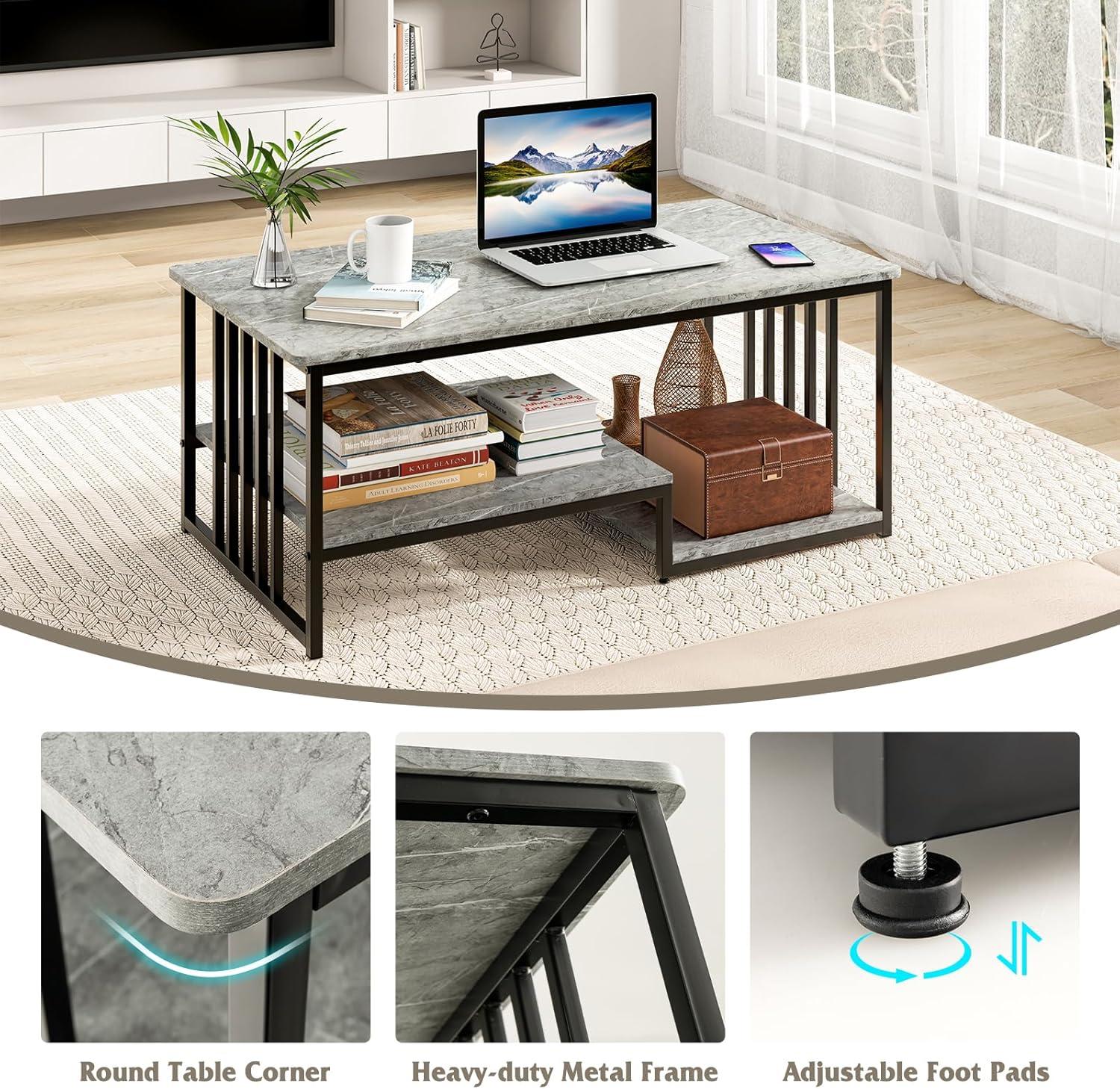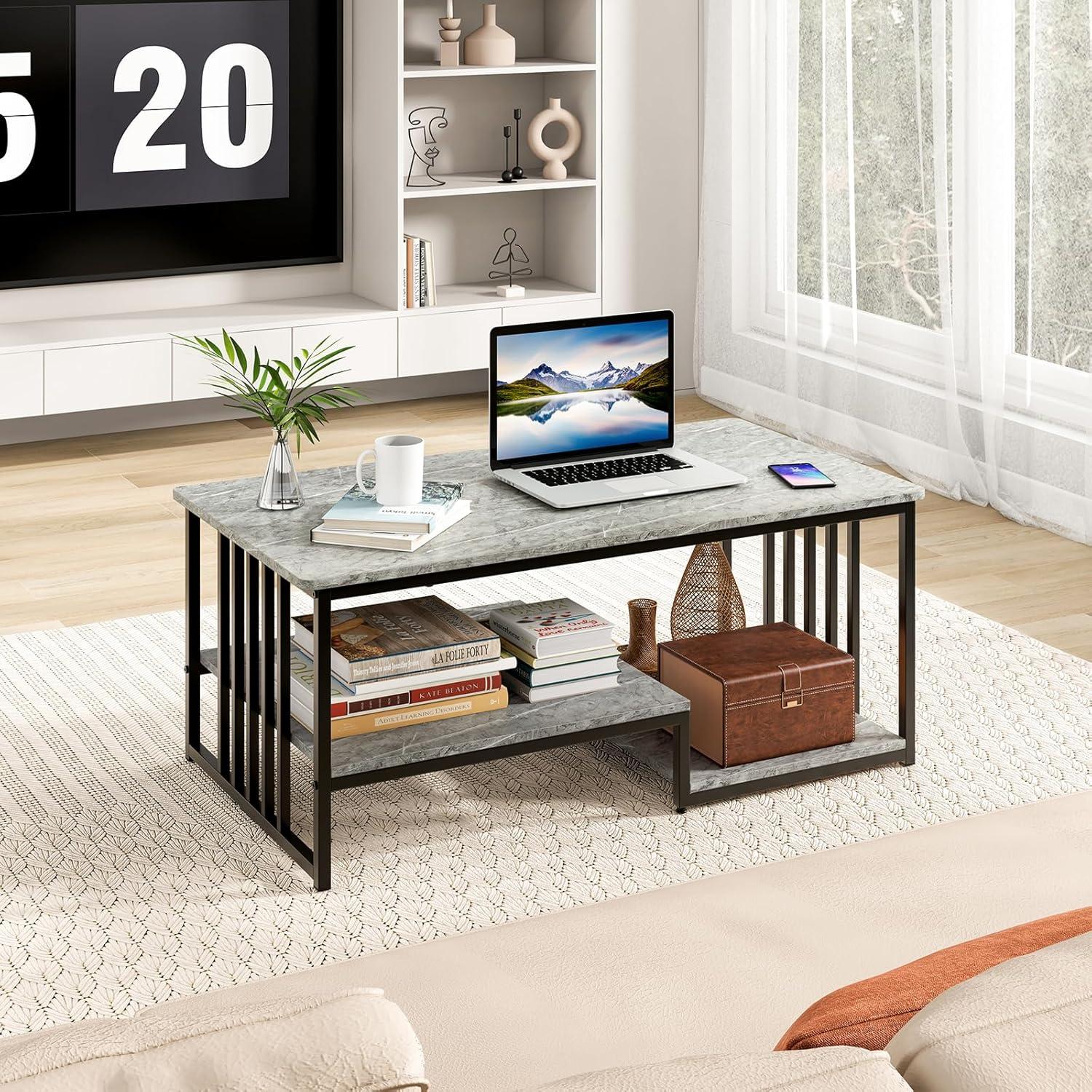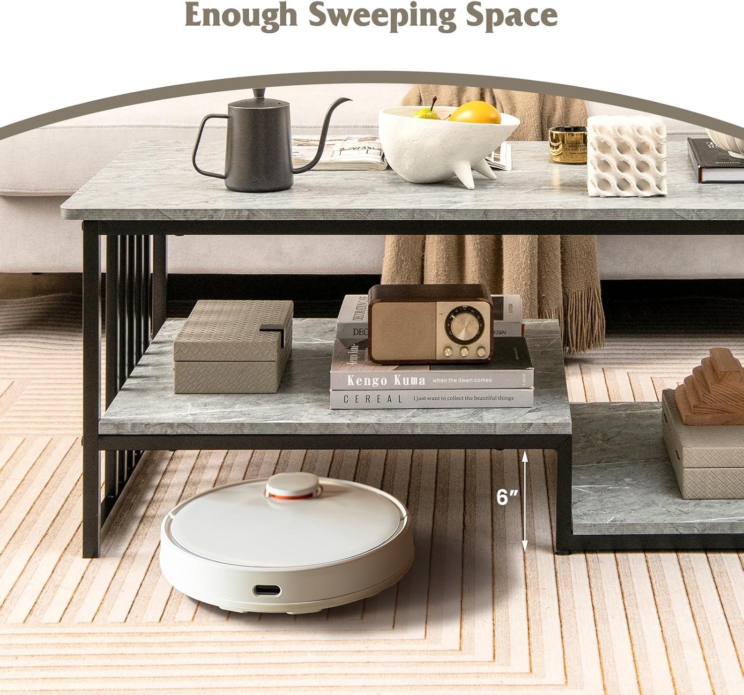 The modern coffee table is a perfect centerpiece in your home! Elegant faux marble tabletop and black finished metal frame showcase a glam and modern look. Wide top surface and open shelves can meet the needs of storage & display, keeping your room organized. For reliable structure, the center table is crafted of rigid metal tubes to ensure great stability and durability. More, the combination of style and practicality enables the coffee table an ideal addition for both home and office.