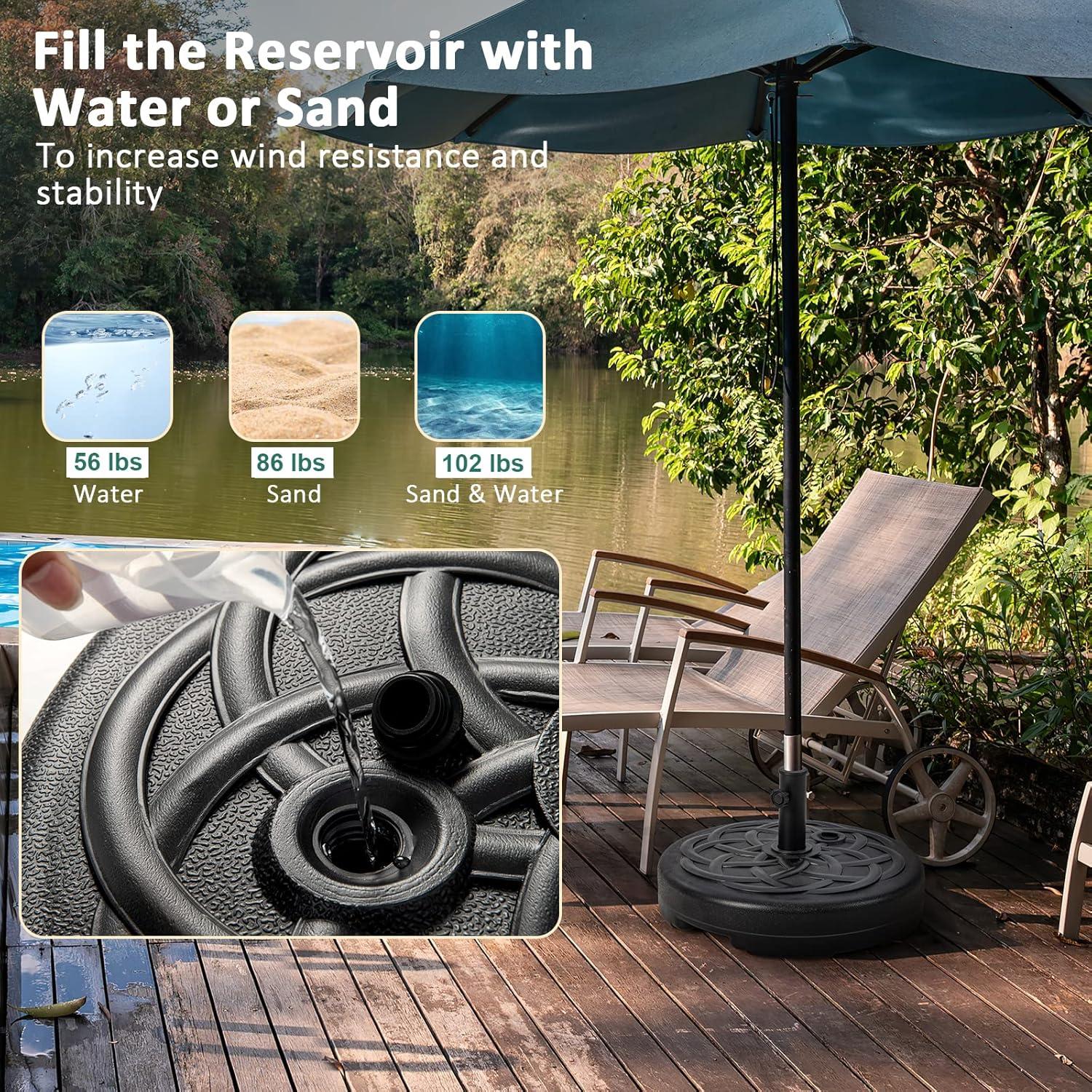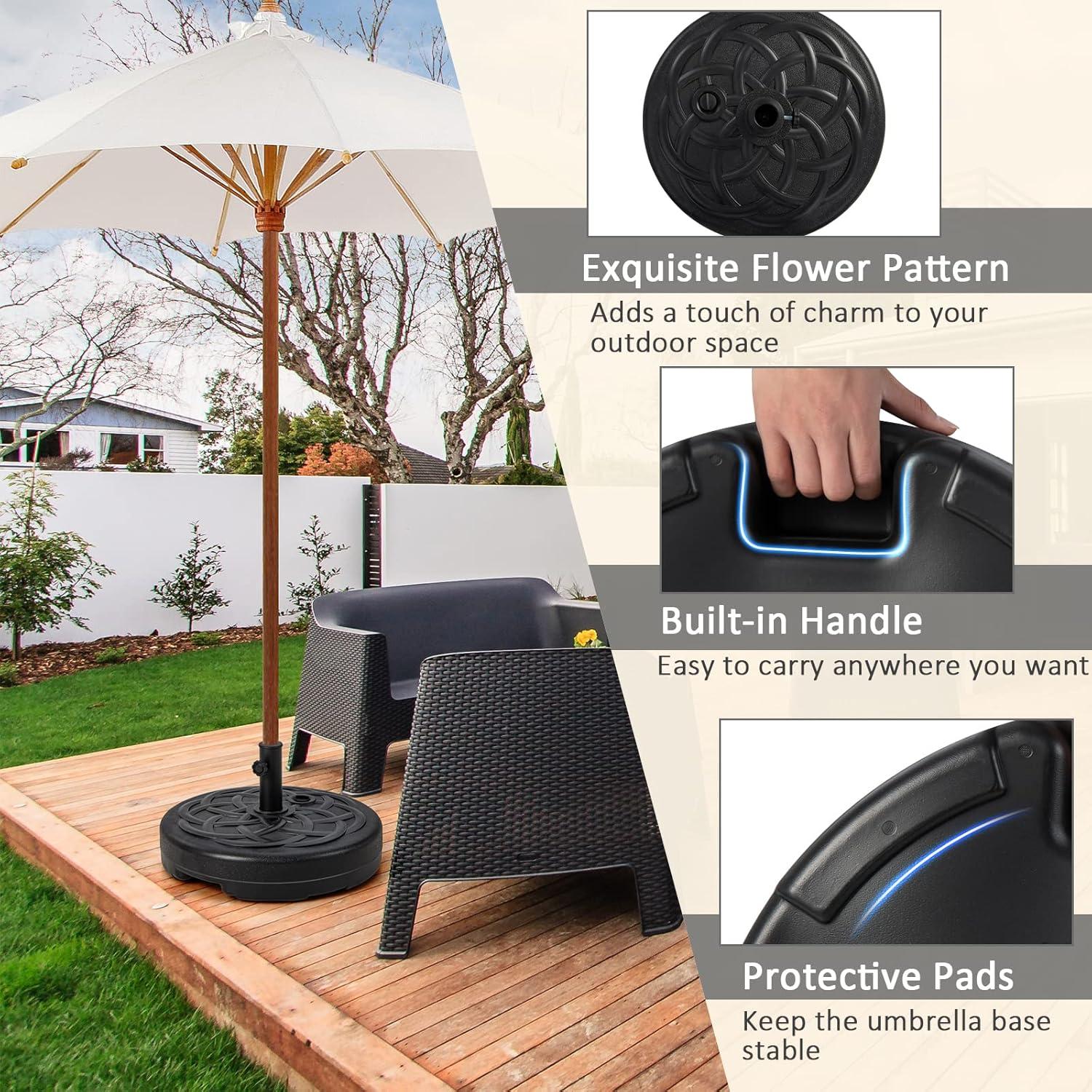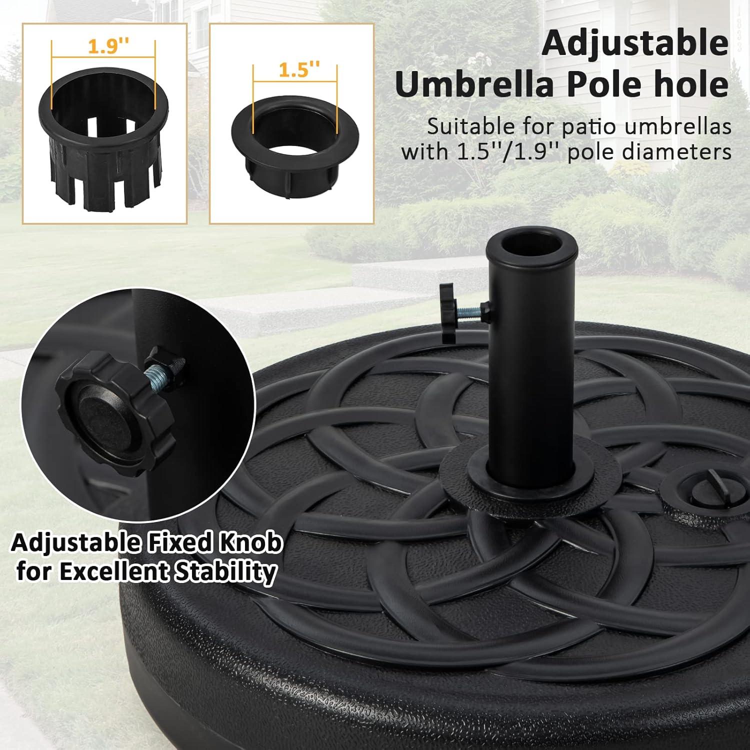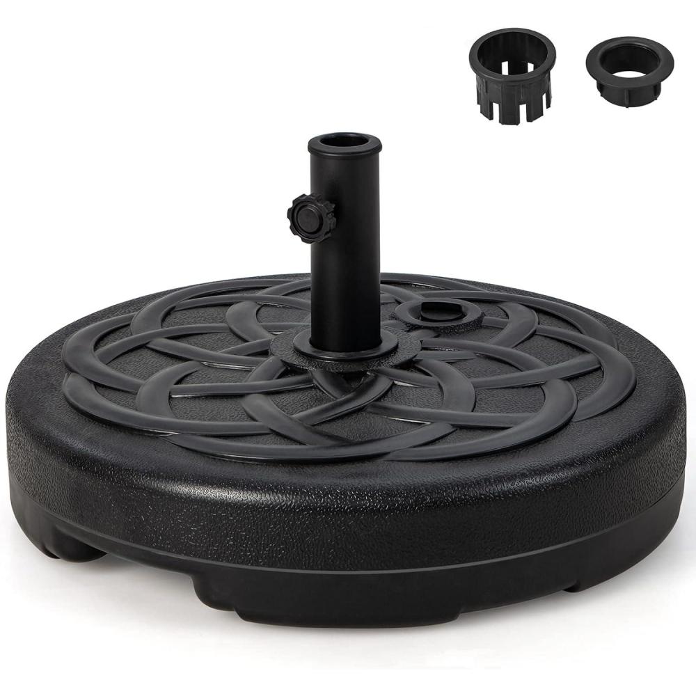 Our fillable umbrella base stand measures 22'' x 12'' (Dia. x H). It weighs up to 56 lbs with water, 86 lbs with sand, 102 lbs with sand and water. In addition, it is made of high-quality HDPE material, which can withstand all weather conditions, ensuring long-lasting durability. Thanks to the 2 plastic adapters of 1.5'' and 1.9'' diameter, the umbrella stand is suitable for most market umbrellas and patio table umbrellas within 10 ft. In addition, with its exquisite floral pattern and classic black colors, this weighted umbrella stand could add a touch of charm to your outdoor space.