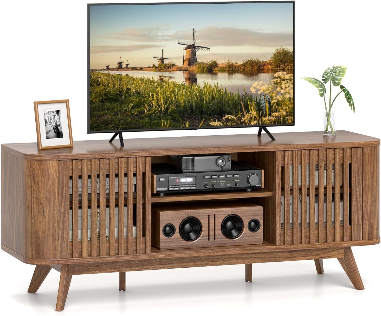 Giantex Fluted TV Stand for TVs up to 60″, Mid Century Modern Entertainment Center w/Storage, 2-Door TV Cabinet w/Adjustable Shelves, Media Console Table for Living Room, Bedroom, Walnut