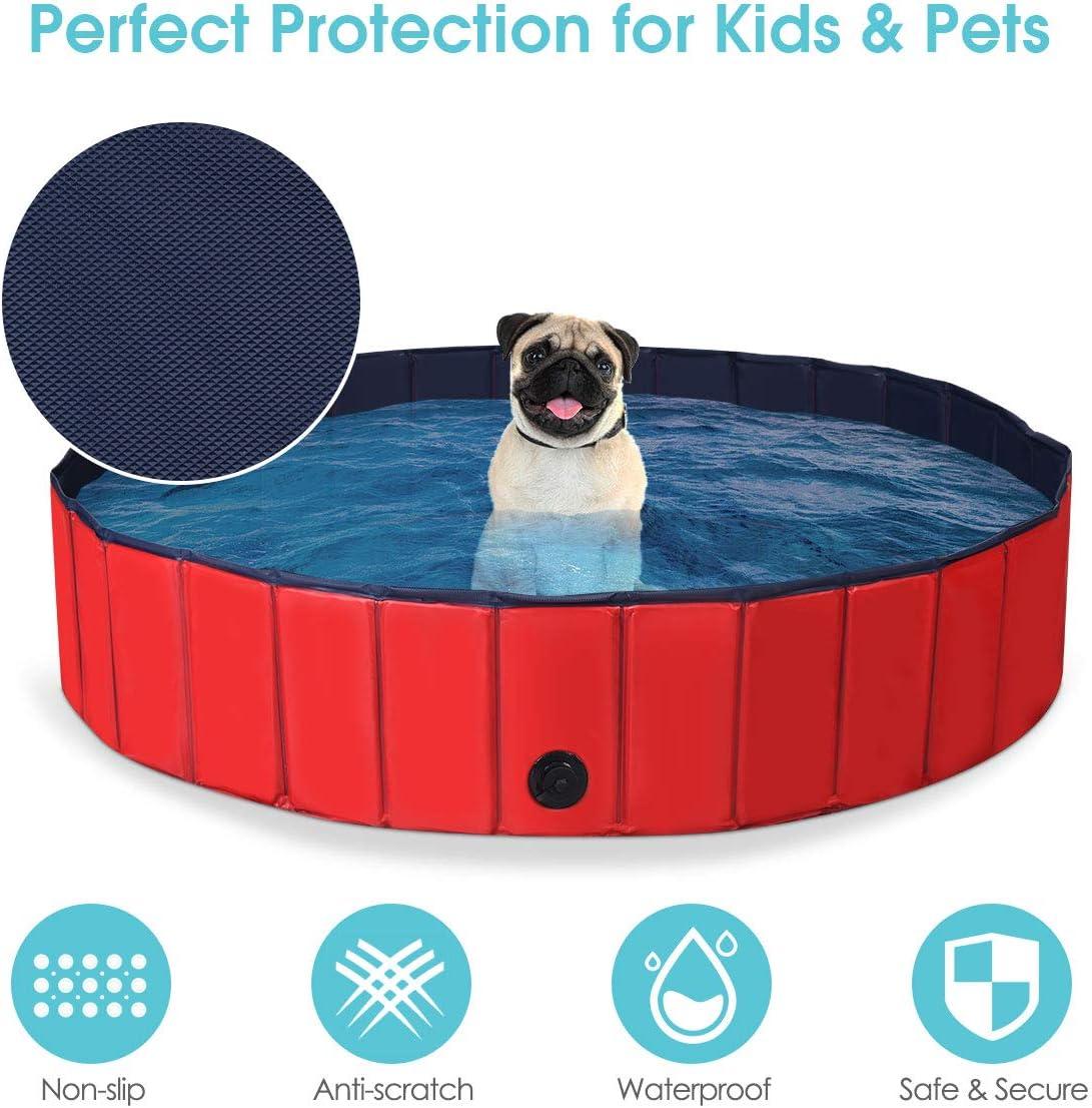 【Anti-slip Bottom】: To make it safer, the bottom and wall of the pool is uniquely designed with anti-slip lines to prevent pets and kids from slipping when taking a bath. All pieces around make the whole pet pool an expansive and capacious place to bath or have fun on water.
