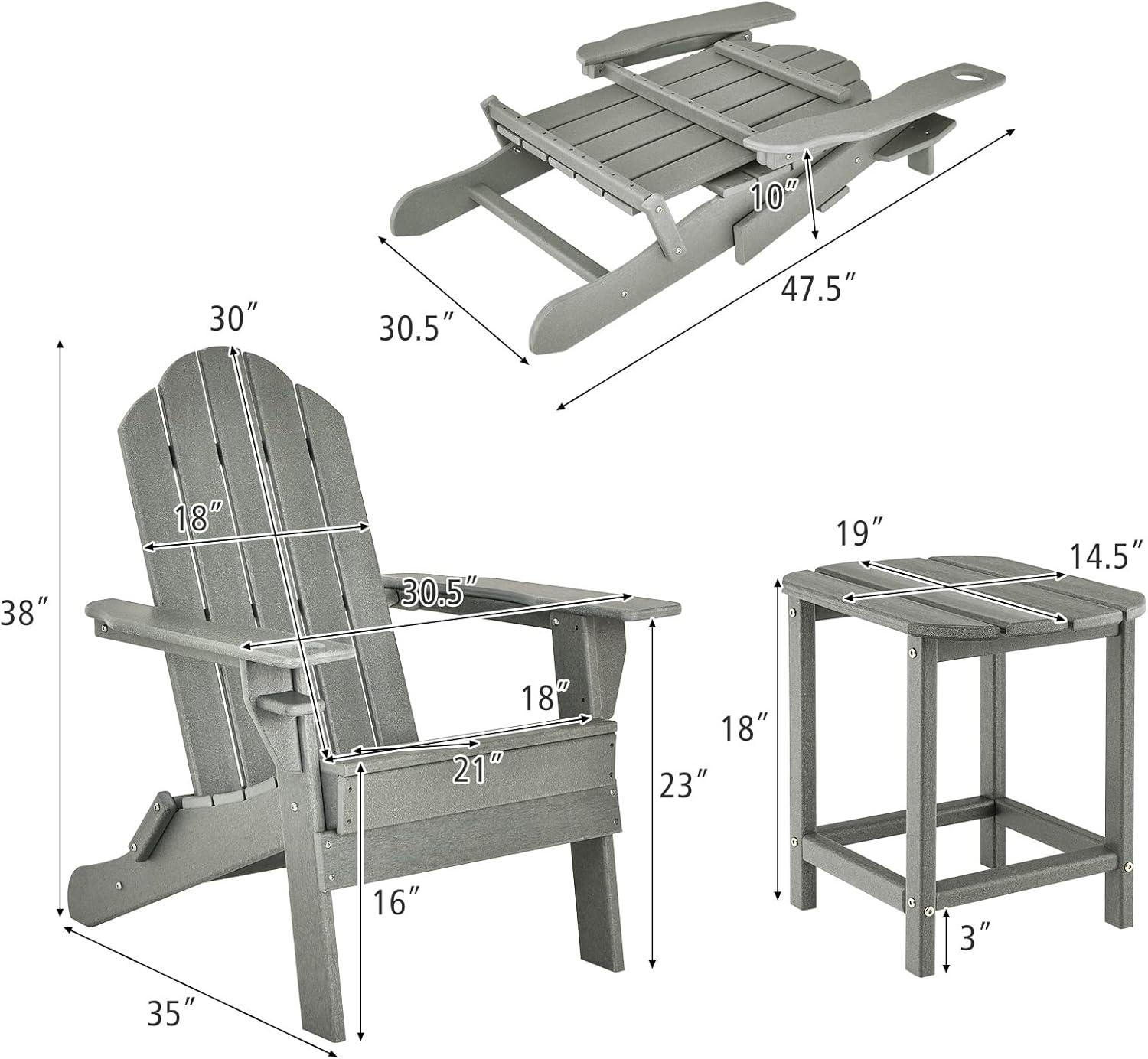Convenient Side Table: This outdoor fire pit furniture set includes a rectangular end table, which will be the perfect mate to put it beside the Adirondack chair. Overall dimension of table: 19” x 14.5” x 18”, unfolding dimension of chair: 35” x 30.5” x 39”, folding dimension of chair: 47.5” x 30.5” x 11”. Please refer to the size description before purchase. Please do not tighten all the screws until all the holes are aligned.