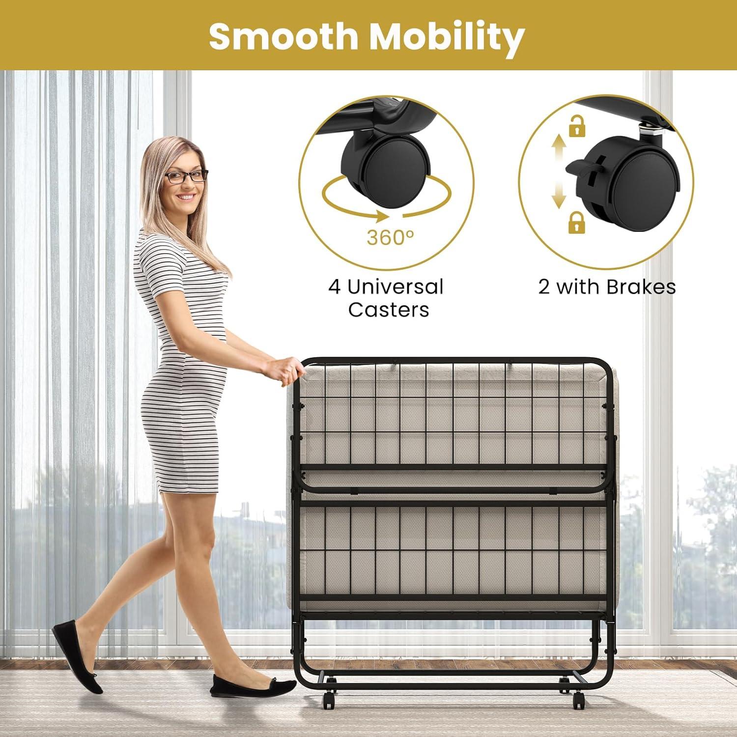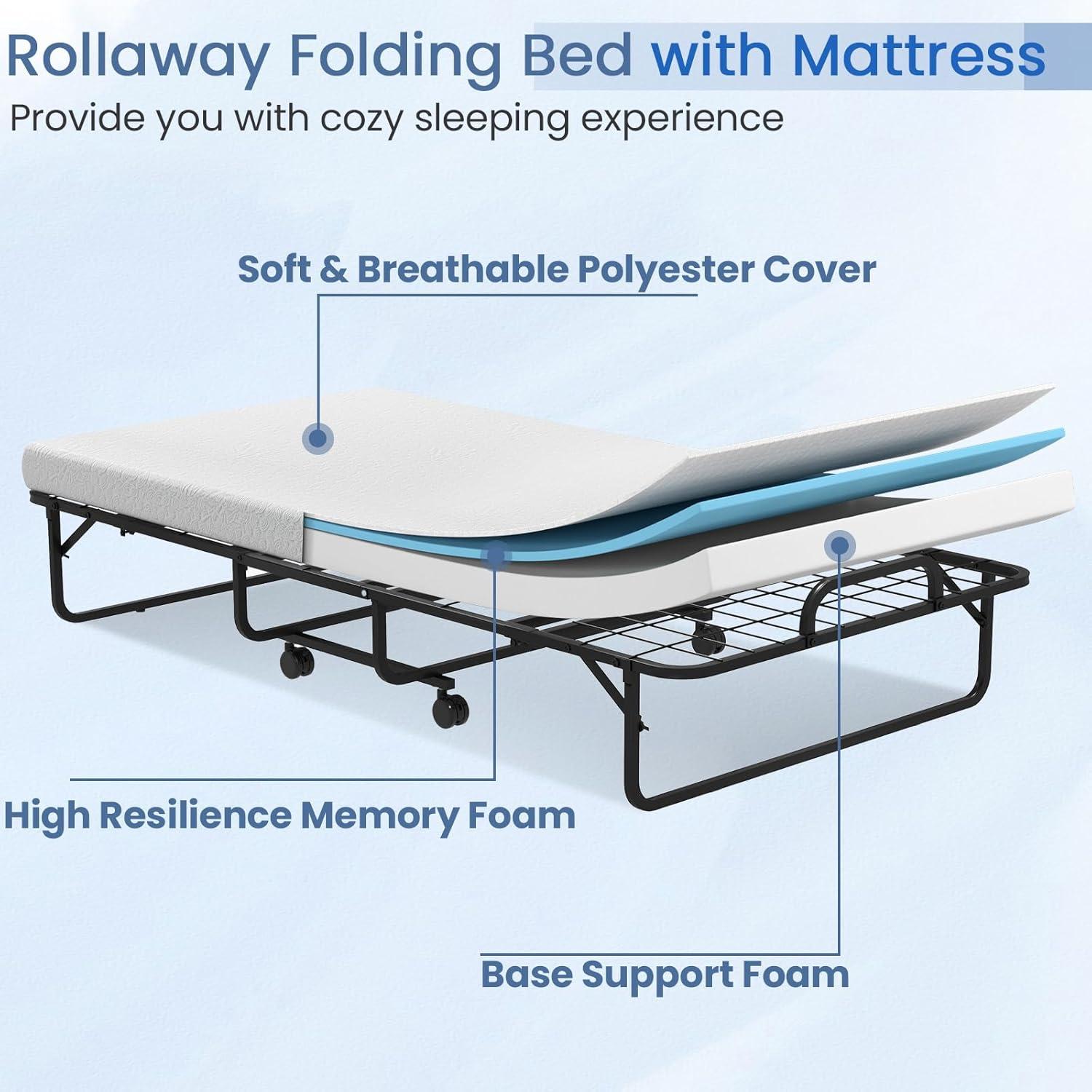 Giantex Folding Bed with Mattress for Adults, Twin Size Rollaway Beds for Guest, Space Saving Portable Foldable Bed w/Memory Foam Mattress & Metal Frame for Easy Storage, 75″x 38″(Twin)