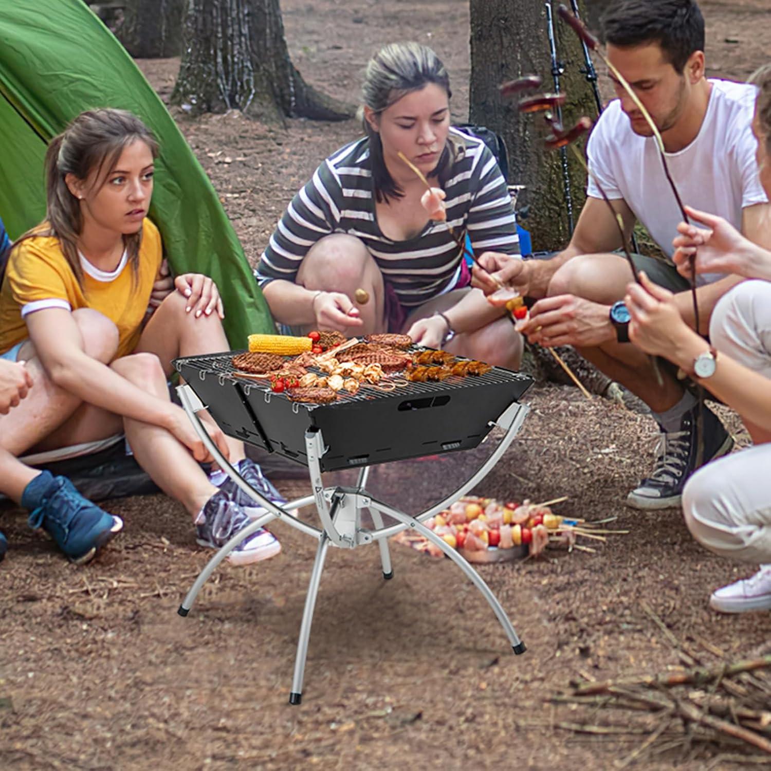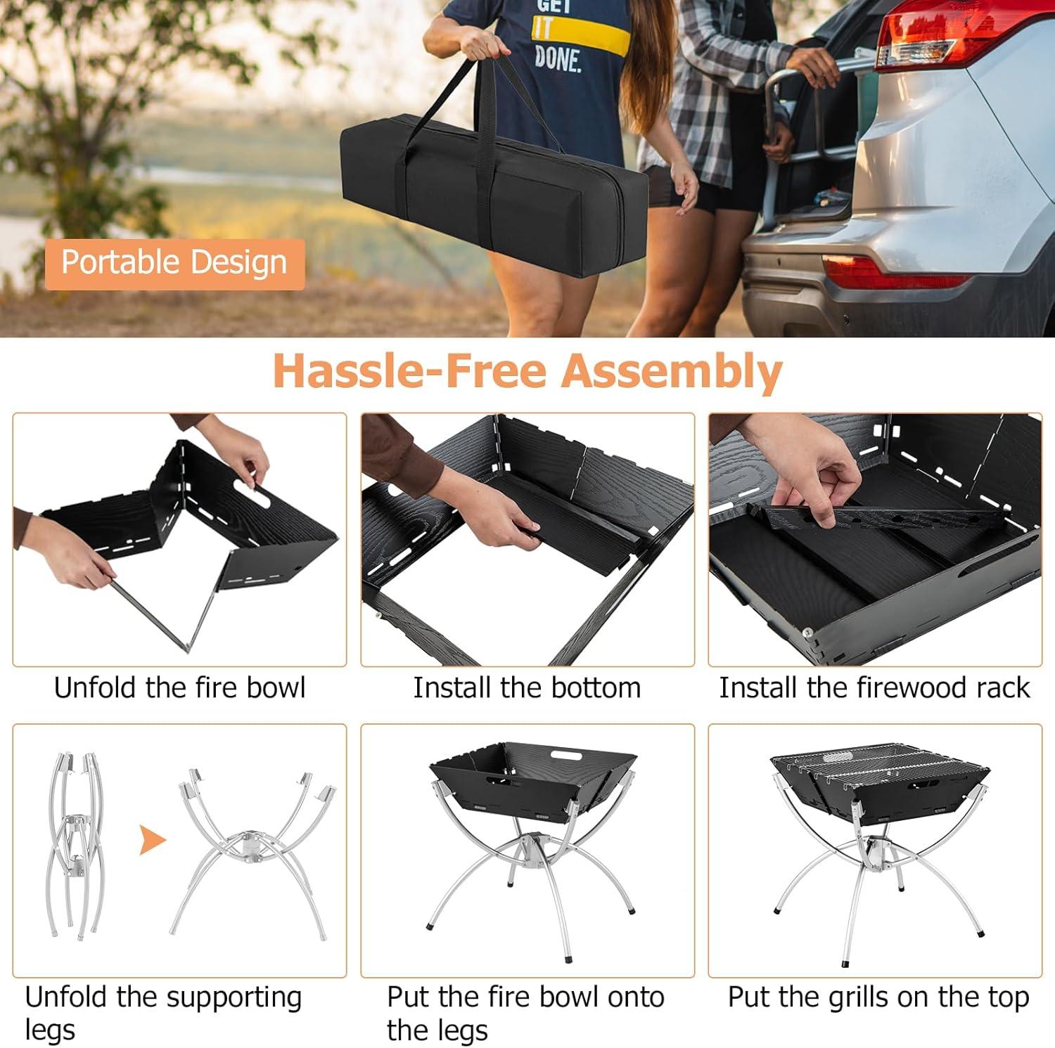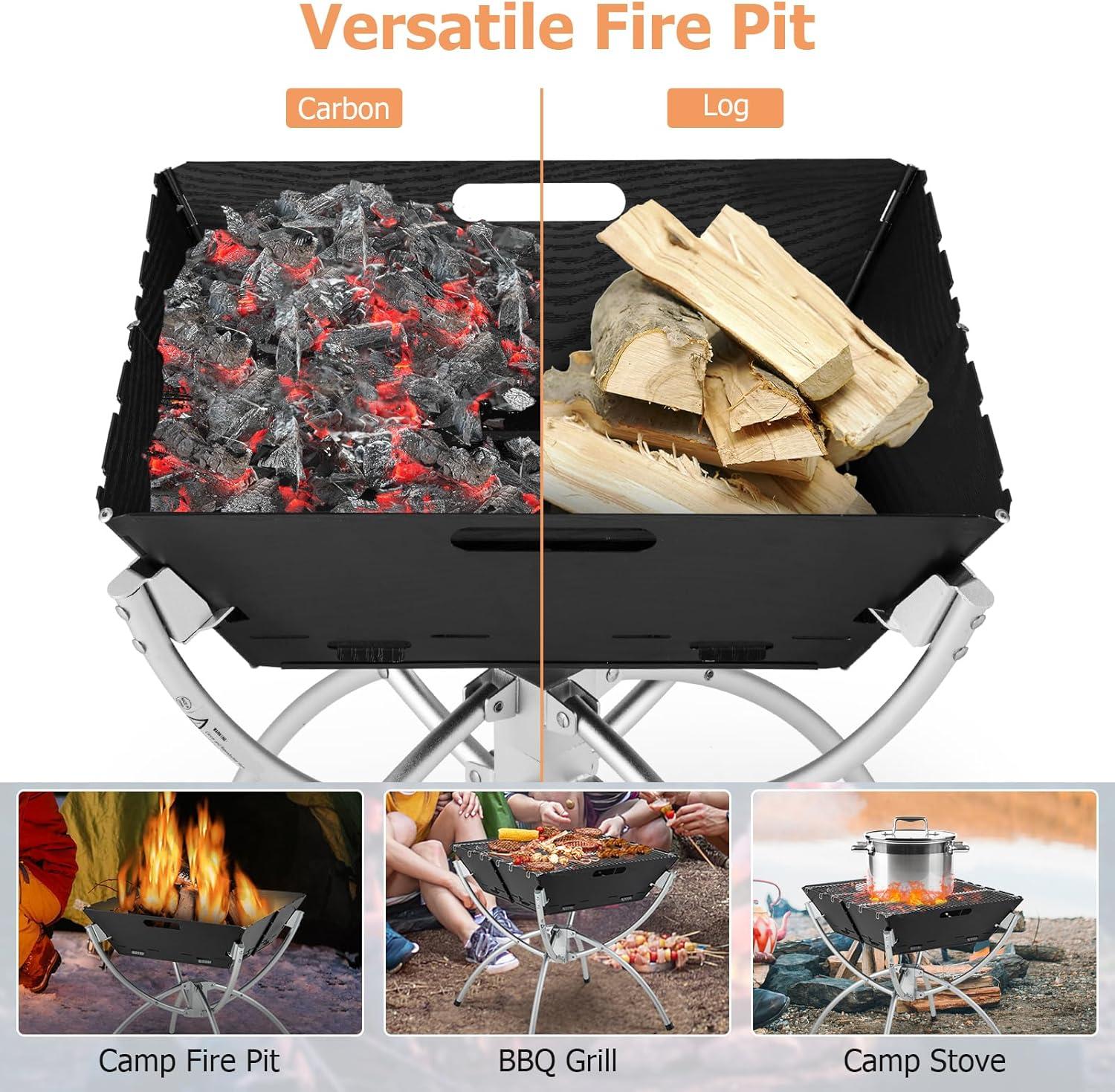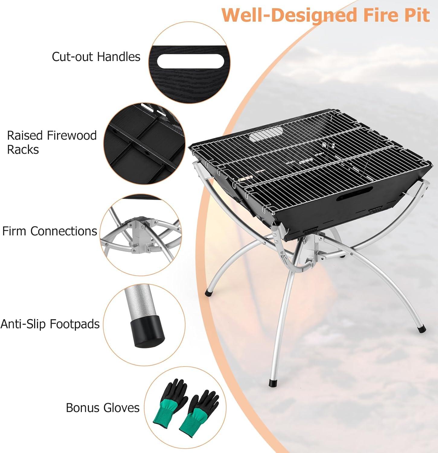 Enhance your camping experience with this campfire grill. It includes 3 grills and is compatible with various fuel options like carbon, logs, and bio-pellets. Whether you want a campfire, BBQ, or a heating source while camping, this fire pit has you covered. Its robust stainless steel grill and zinc iron alloy fire bowl are rustproof and heat-resistant for long-lasting use. The aluminum legs with anti-slip footpads provide sturdy support for a safe and stable experience. With a well-ventilated design, this fire pit allows for continuous burning thanks to its ventilating holes and raised firewood racks. Assembly is quick and hassle-free, and the included carrying bag and gloves offer added convenience. Elevate your outdoor activities with this versatile fire pit.