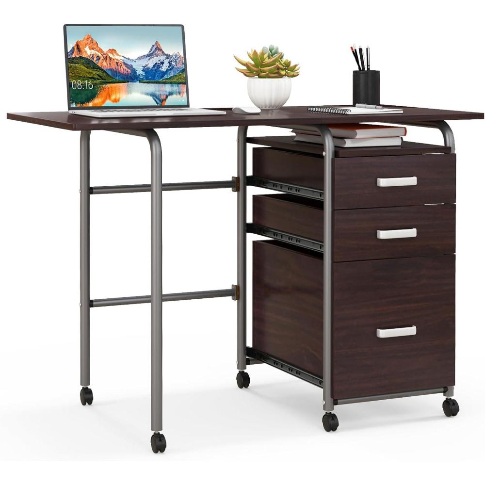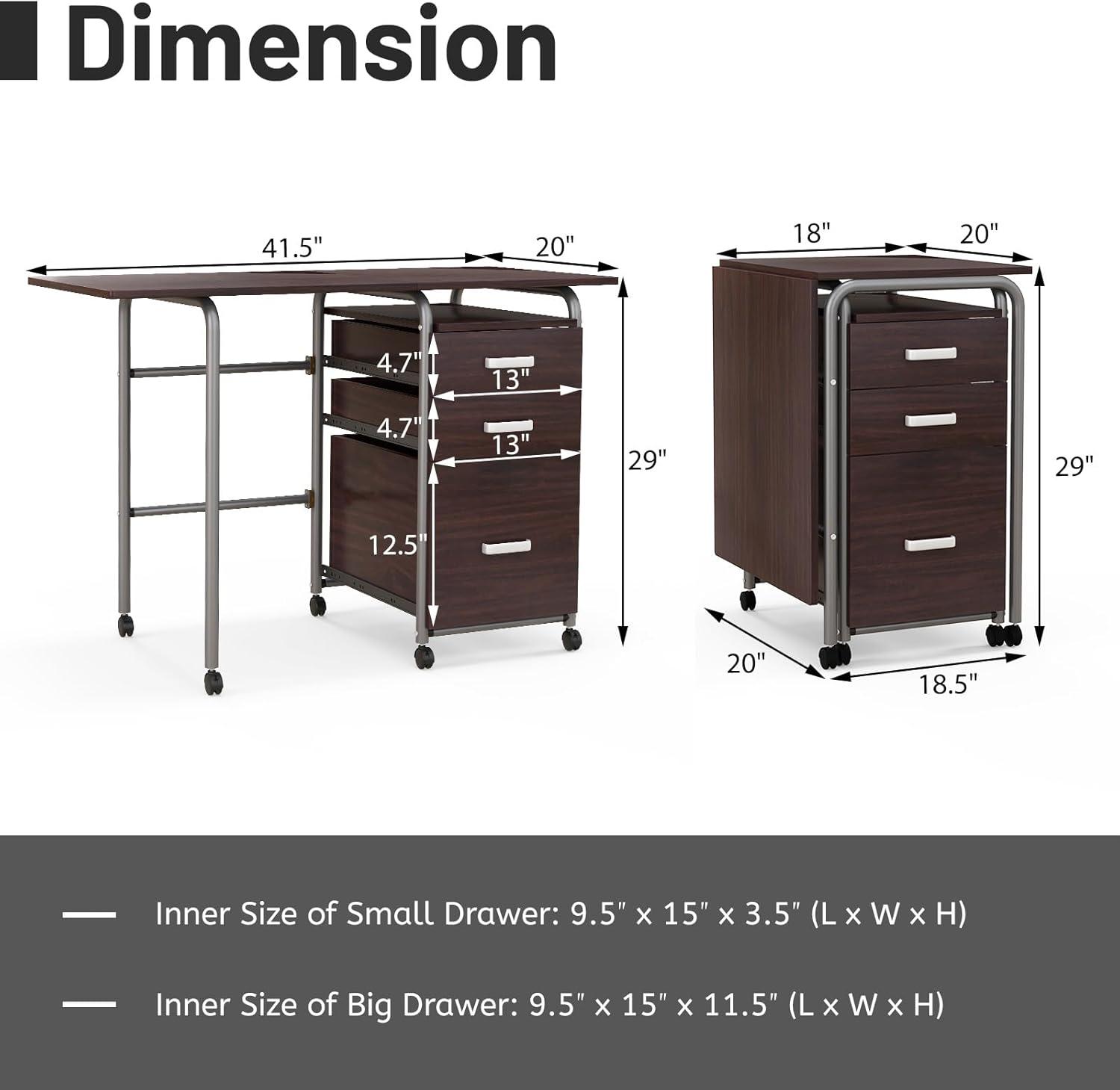 With a flexible design, its reliable & spacious desktop allows for an efficient setup that can be easily folded down to save space. Keep your workspace organized with roomy divided storage, featuring 3 drawers equipped with metal slides & convenient handles. Crafted with durable materials, this computer desk is built to withstand heavy items & maintain stability. Its smooth edge sealing ensures scratch-free surfaces. 6 universal wheels simplify the movement, while it includes 3 lockable wheels for stable stopping. Whether for computer work, writing, studying, or gaming, this study writing desk is a perfect addition to any setup. Enjoy a hassle-free installation process with the included clear manual & necessary hardware. Revitalize your workspace with this multifunctional rolling computer desk.