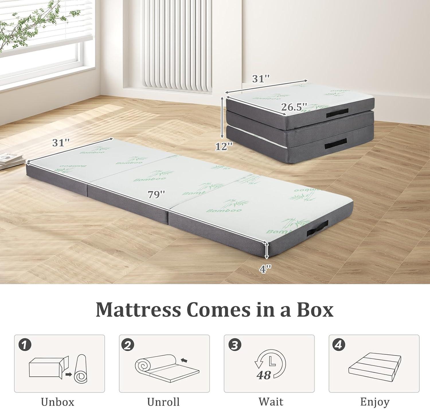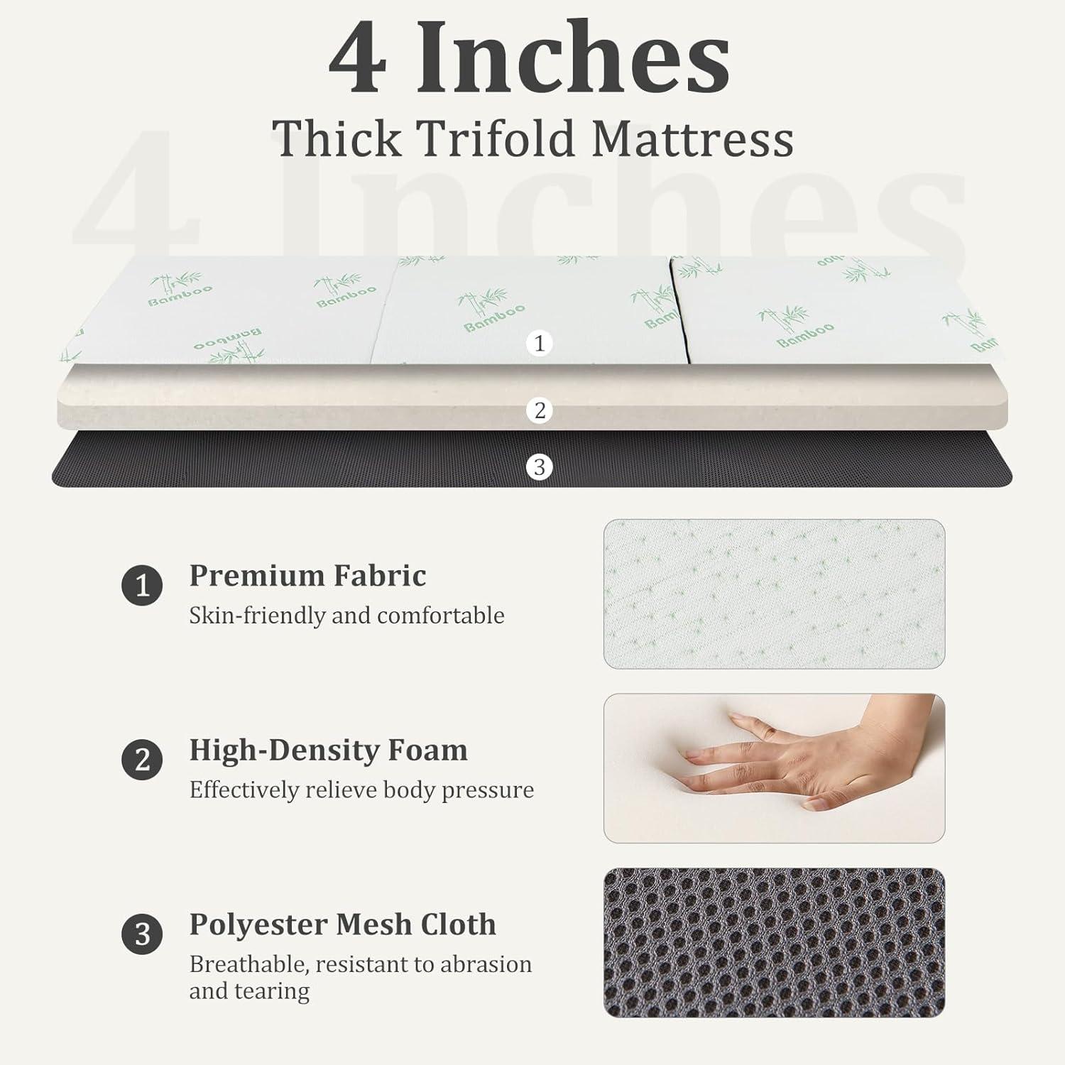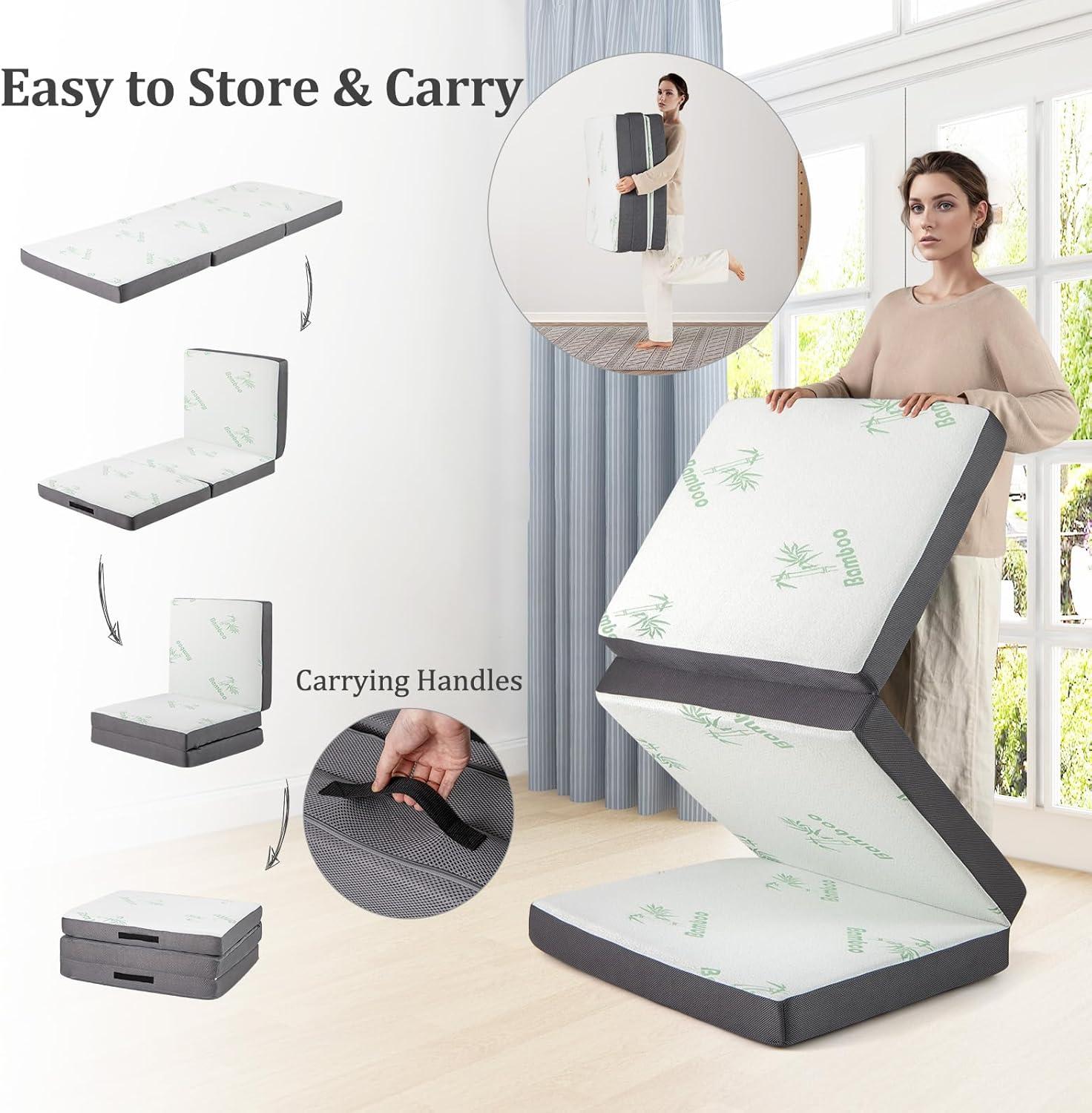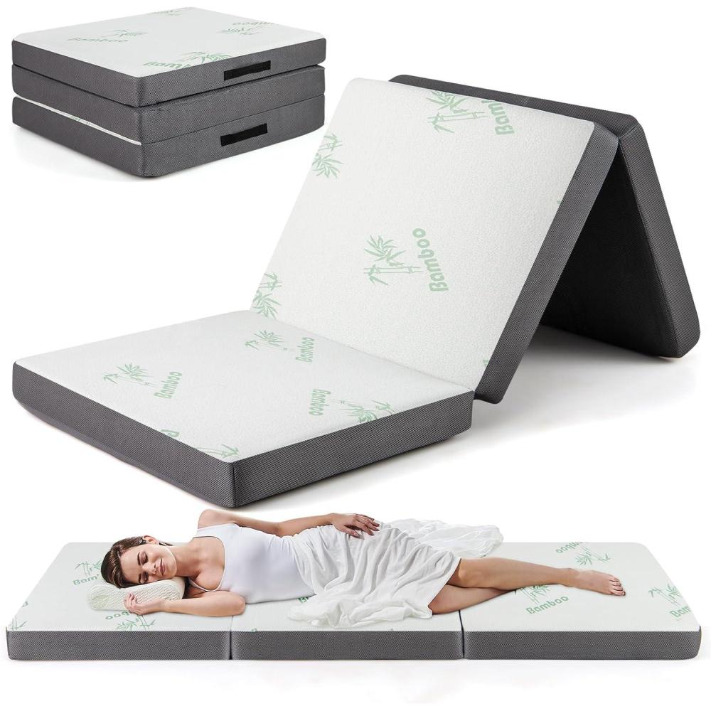 Giantex Folding Mattress, 4 Inch Gel-Infused Tri-fold Mattress with Bamboo Cover & Carry Bag, CertiPUR-US Certified, Foldable Cooling Mattress Topper for Guest Room Dorm RV Camp Floor, Queen(Grey)