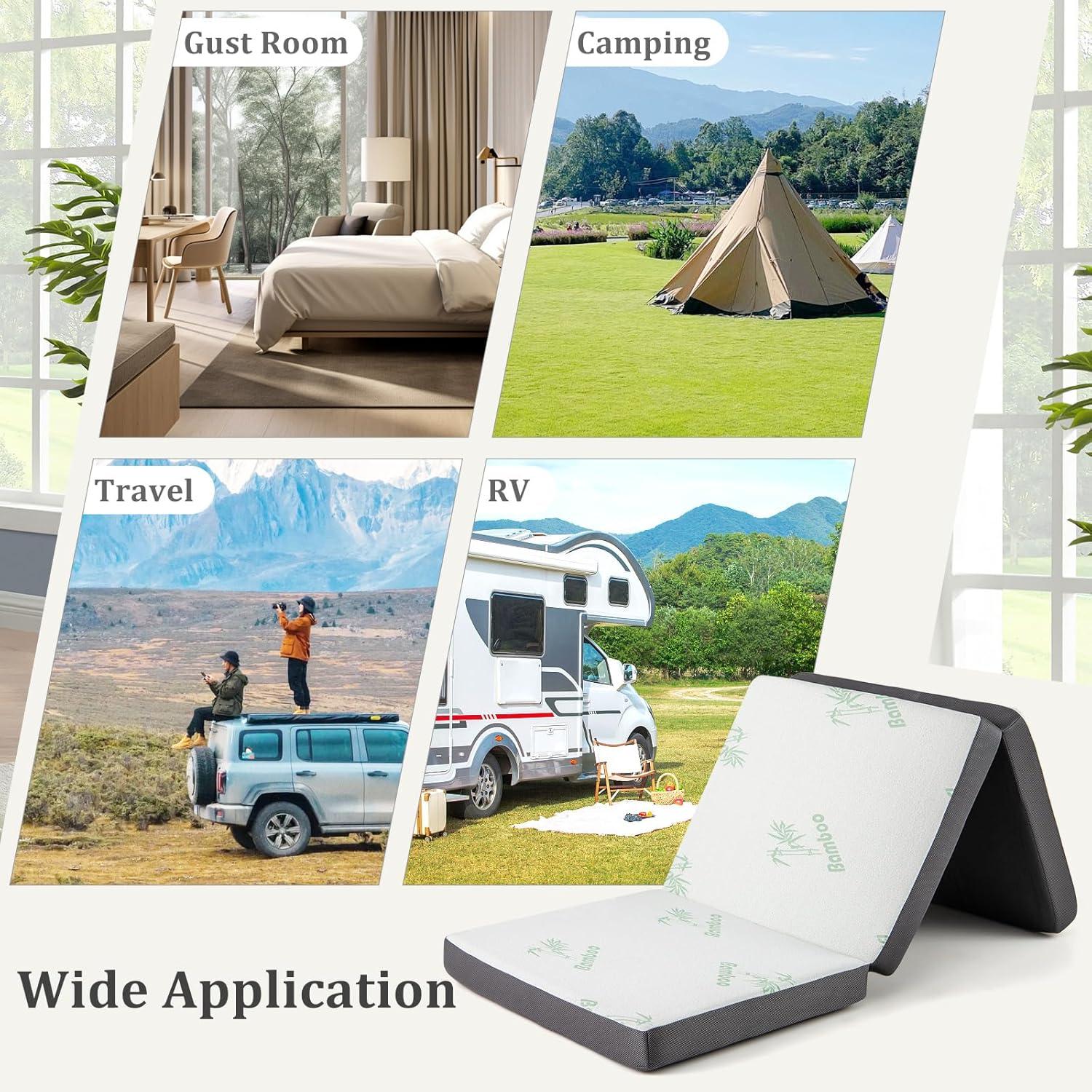 [3-Zone Ergonomic Support]: The trifold portable mattress provides 3 support zones to fit your body curve & relieve the pain points. With the scientific 2-tier foam structure, it is of the perfect firmness for all sleepers, neither too plush to suck your body or too firm to cause stiffness.