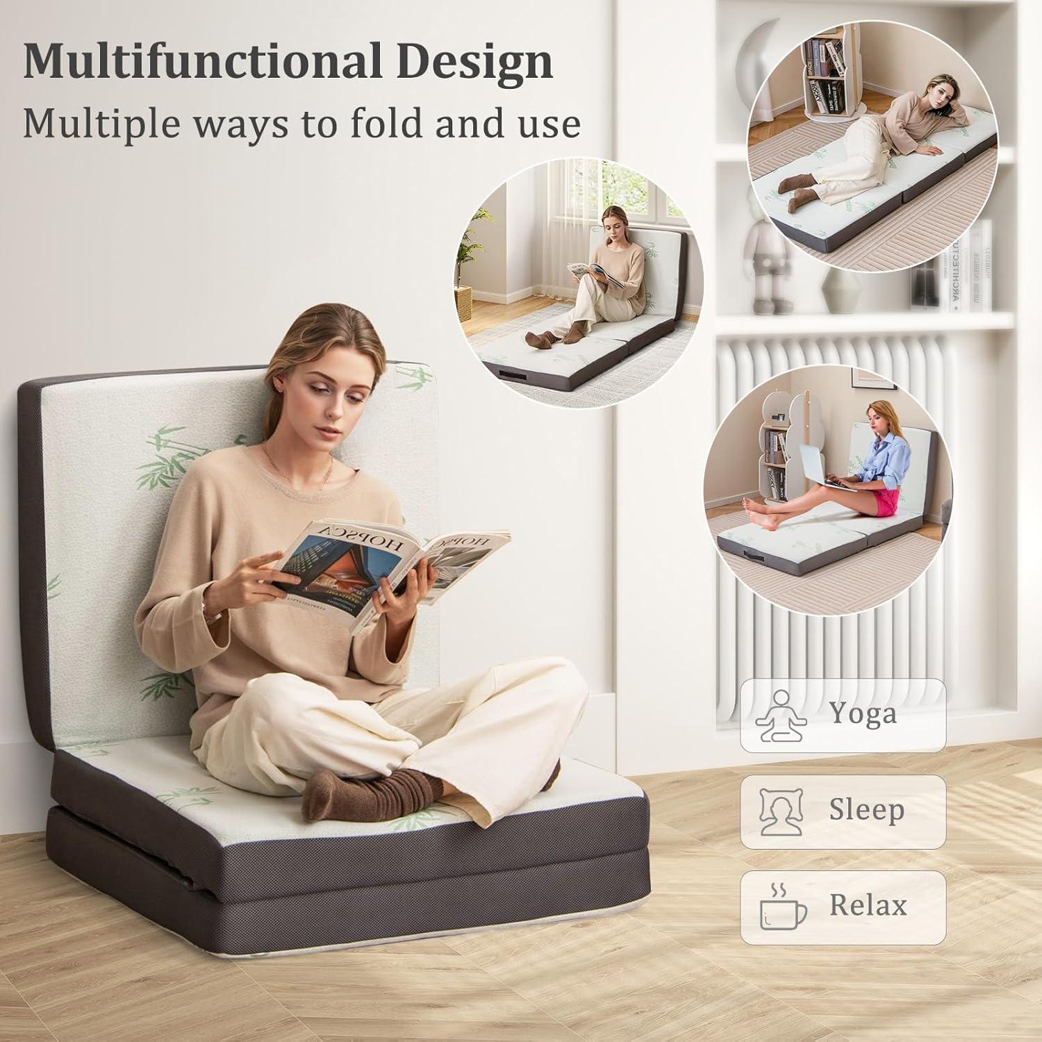 [Multifunctional Folding Mattress]: The floor mattress is perfect for all occasions, such as homes, dorms or RVs. It can be a floor mat for Yoga, or a bed mattress for guest’s sleepover. When it is not in use, the guest bed mattress can be folded up for compact storage , and then be tucked into the portable carrying bag for convenient transport.
