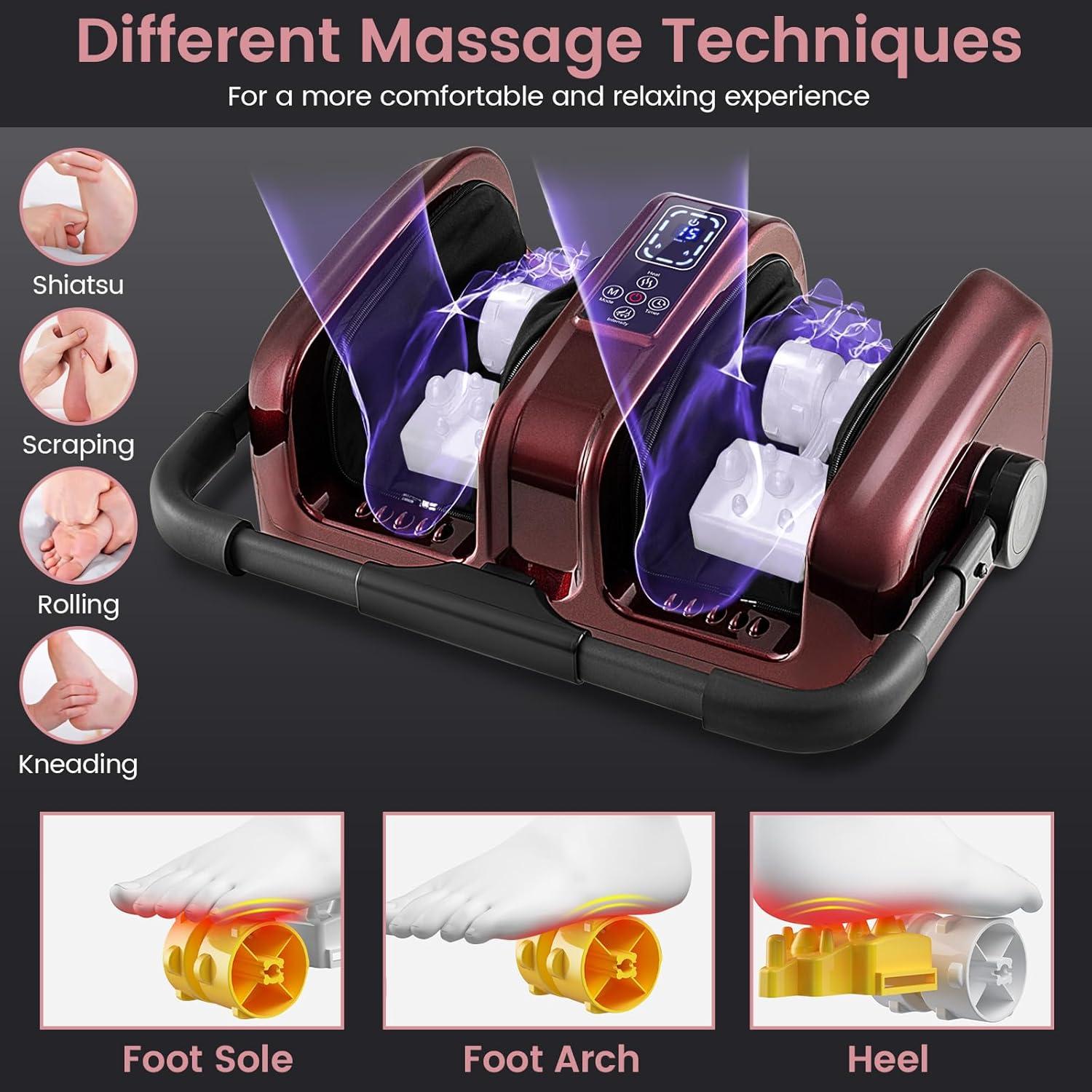 [Deep Massage Experience]: This feet massager uses professional massage heads that work together to deliver a comprehensive relaxation. Experience a unique wave-style kneading and squeezing massage on the sides for a realistic hand-like effect, combined with rolling, scraping, and shiatsu techniques that deeply target the soles, arches, and heels.