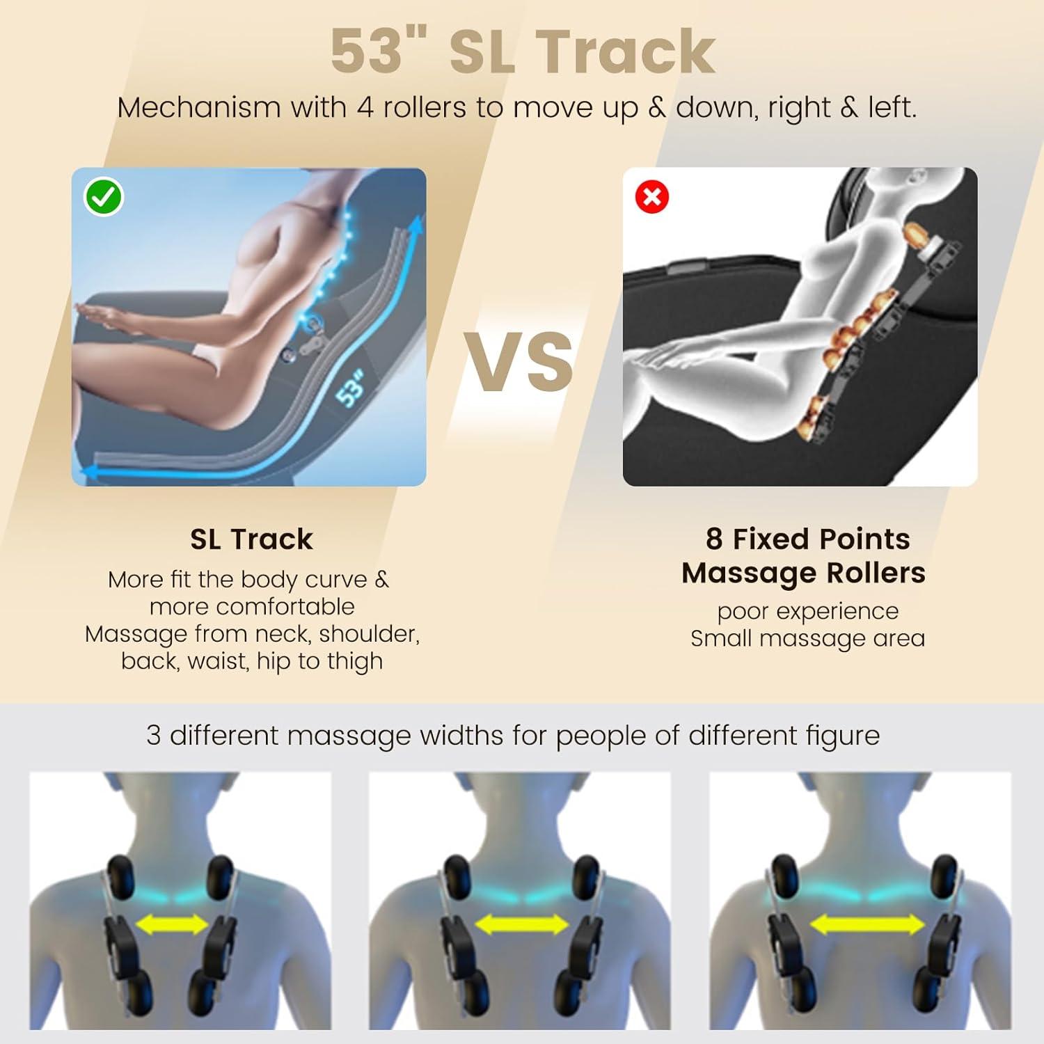 SL Track & Yoga Stretching: The 53 inch SL track is ergonomically designed to fit the body curve, and can trace your neck down to your thighs to provide a larger massage range. And it has yoga stretching function to relax the muscles of the whole body. And retractable calf frame is suitable for people of different heights.