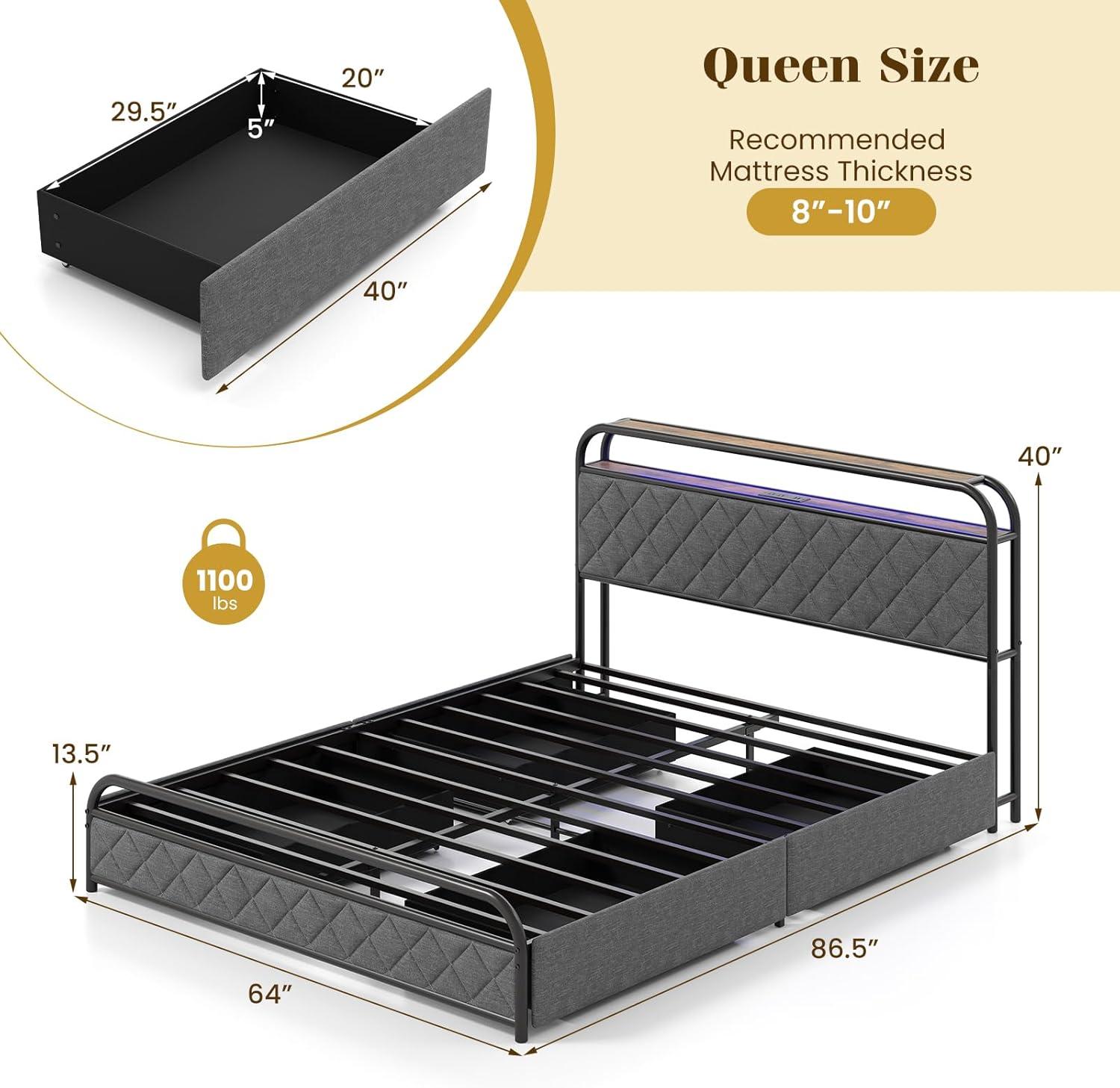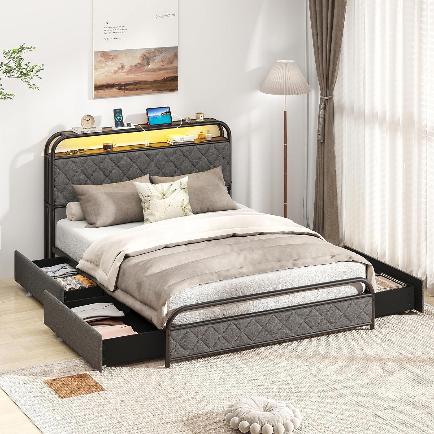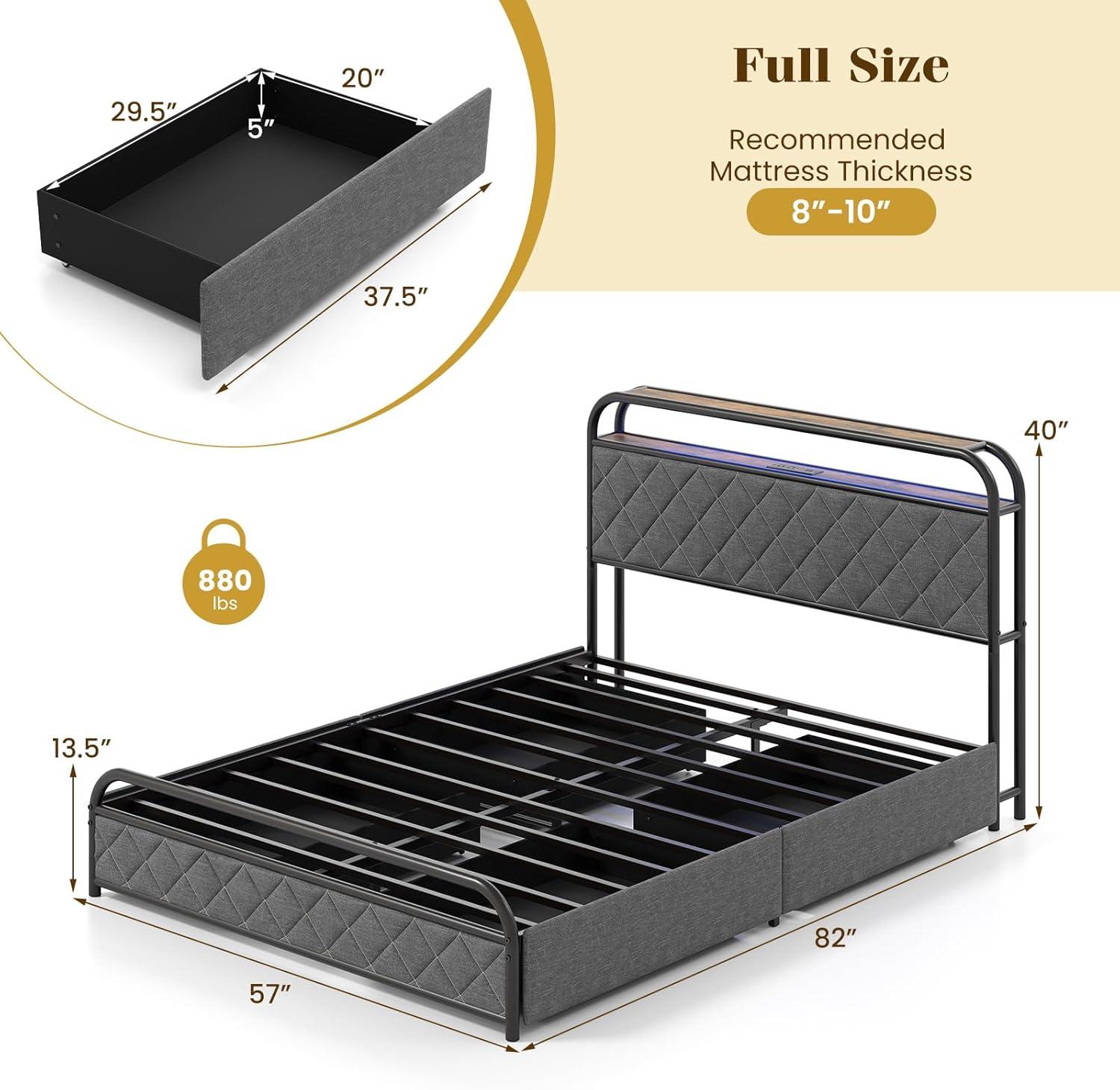 Giantex Full Size Bed Frame with 4 Storage Drawers and Charging Station, Metal Full Platform Bed w/LED Lights & Linen Upholstered Headboard, No Box Spring Needed, Full Storage Bed, Black & Grey(Black & Grey)