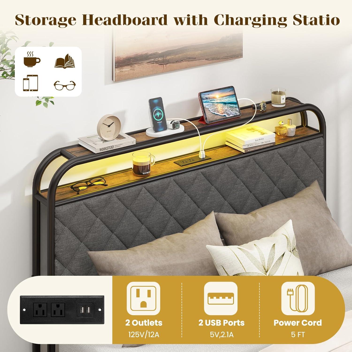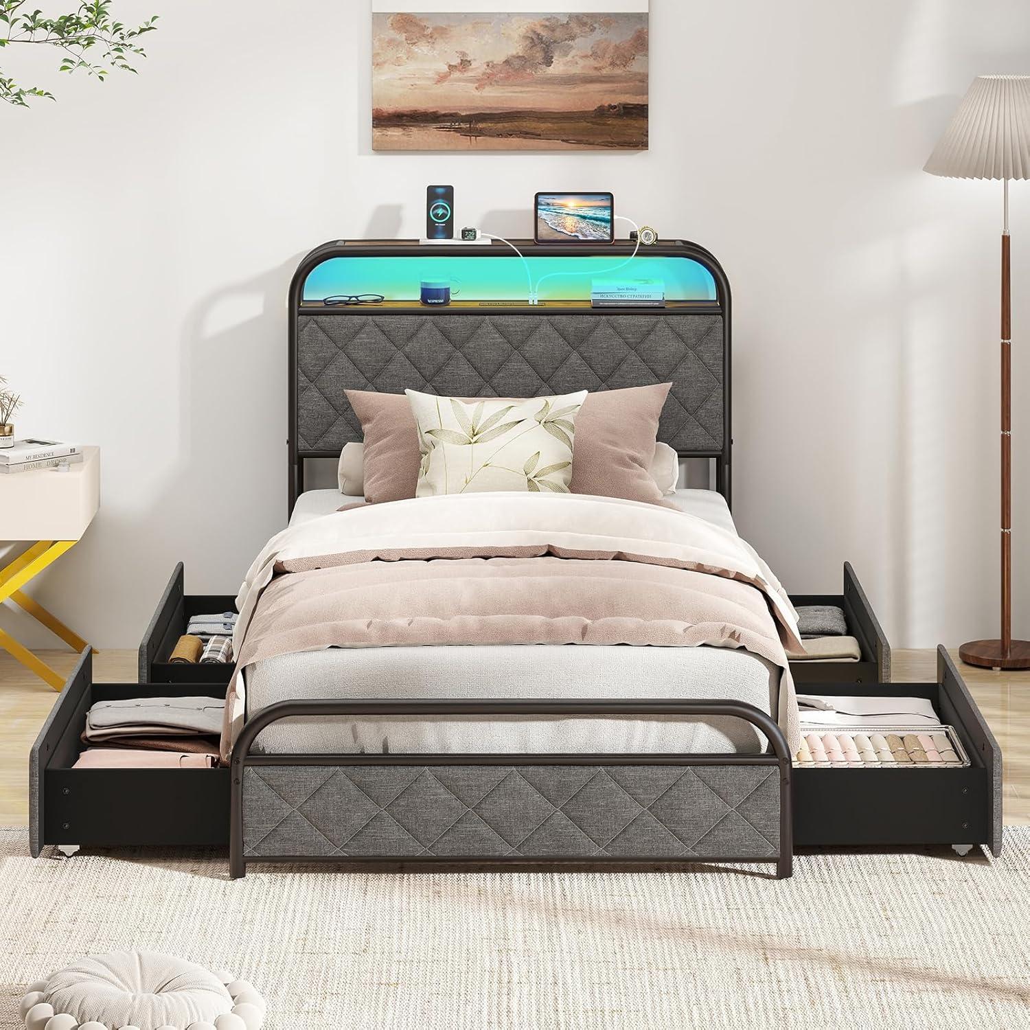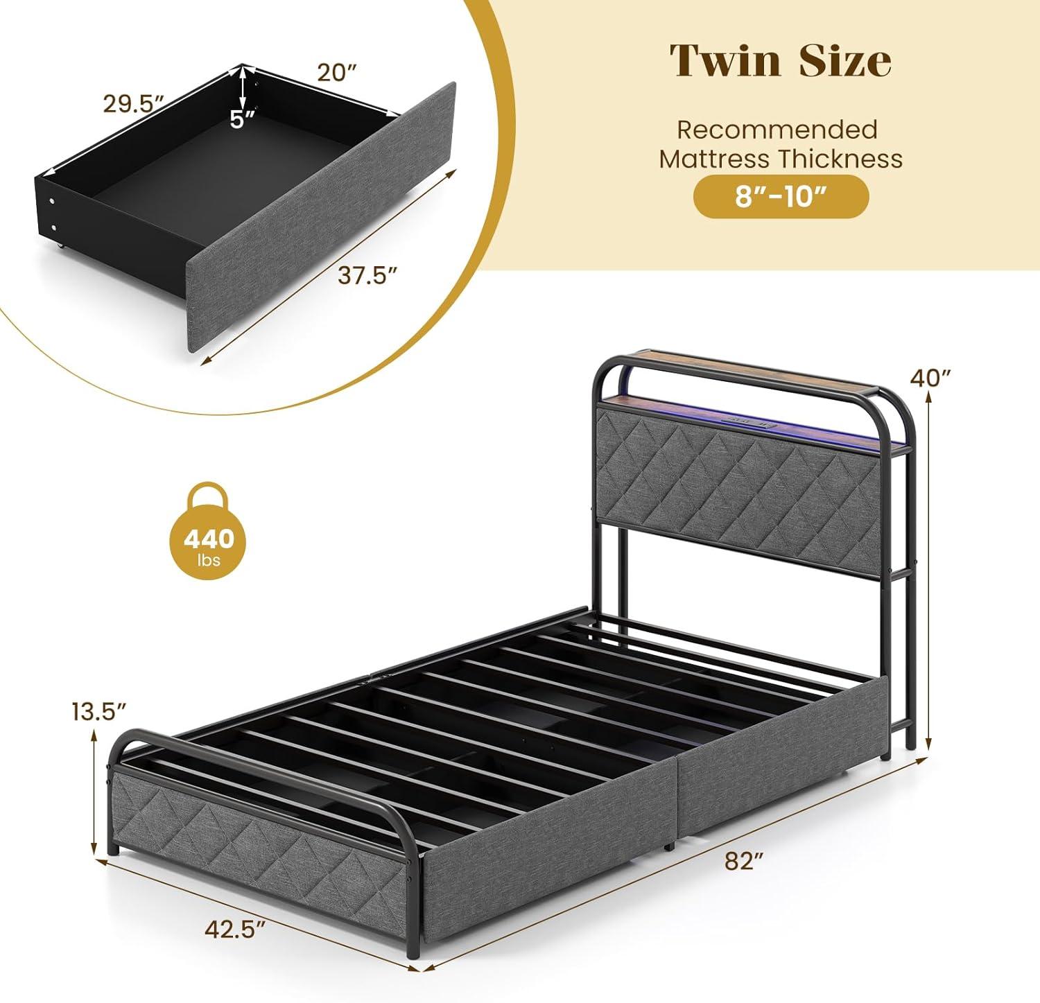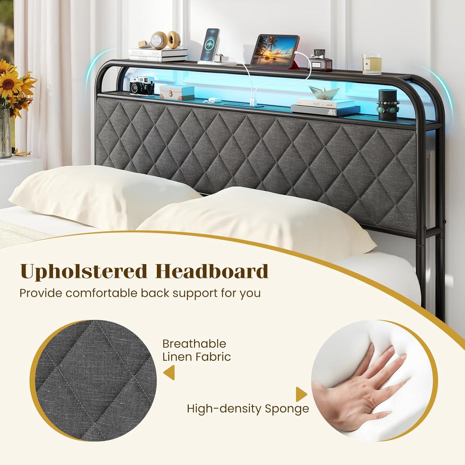 Giantex Full Size Bed Frame with 4 Storage Drawers and Charging Station, Metal Full Platform Bed w/LED Lights & Linen Upholstered Headboard, No Box Spring Needed, Full Storage Bed, Black & Grey(Black & Grey)