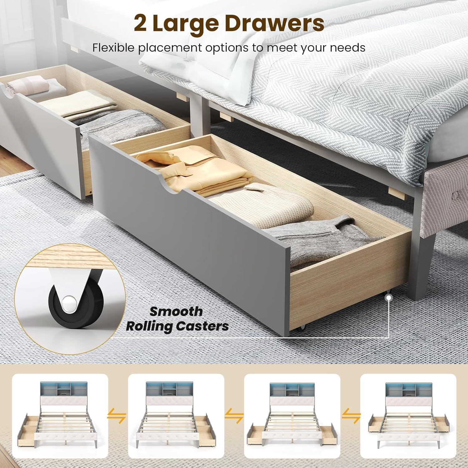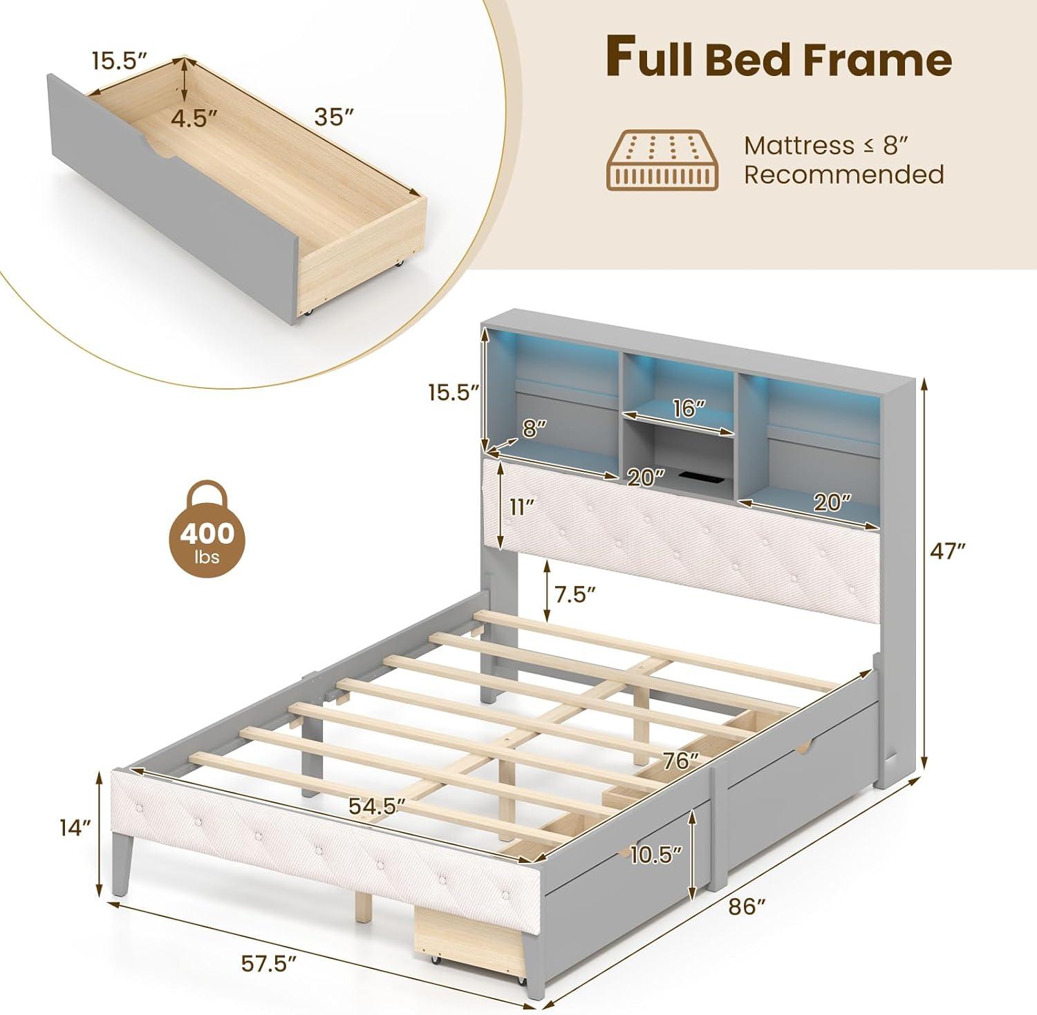 Our full size bed frame features a padded bookcase headboard, perfect for reading and lounging, and comes complete with 4 convenient storage cubes for your books, magazines and essentials. Plus, 2 drawers under the platform bed provide ample storage space for your clothes and blankets. Stay connected with the built-in charging station and set the mood with ambient LED lights with multiple modes and colors, all remotely controlled without the need of fumbling for the switch. Its sturdy design with 8 wide slats keeps your mattress perfectly in place for a sound night's sleep. Revamp your bedroom with our modern full bed frame today!