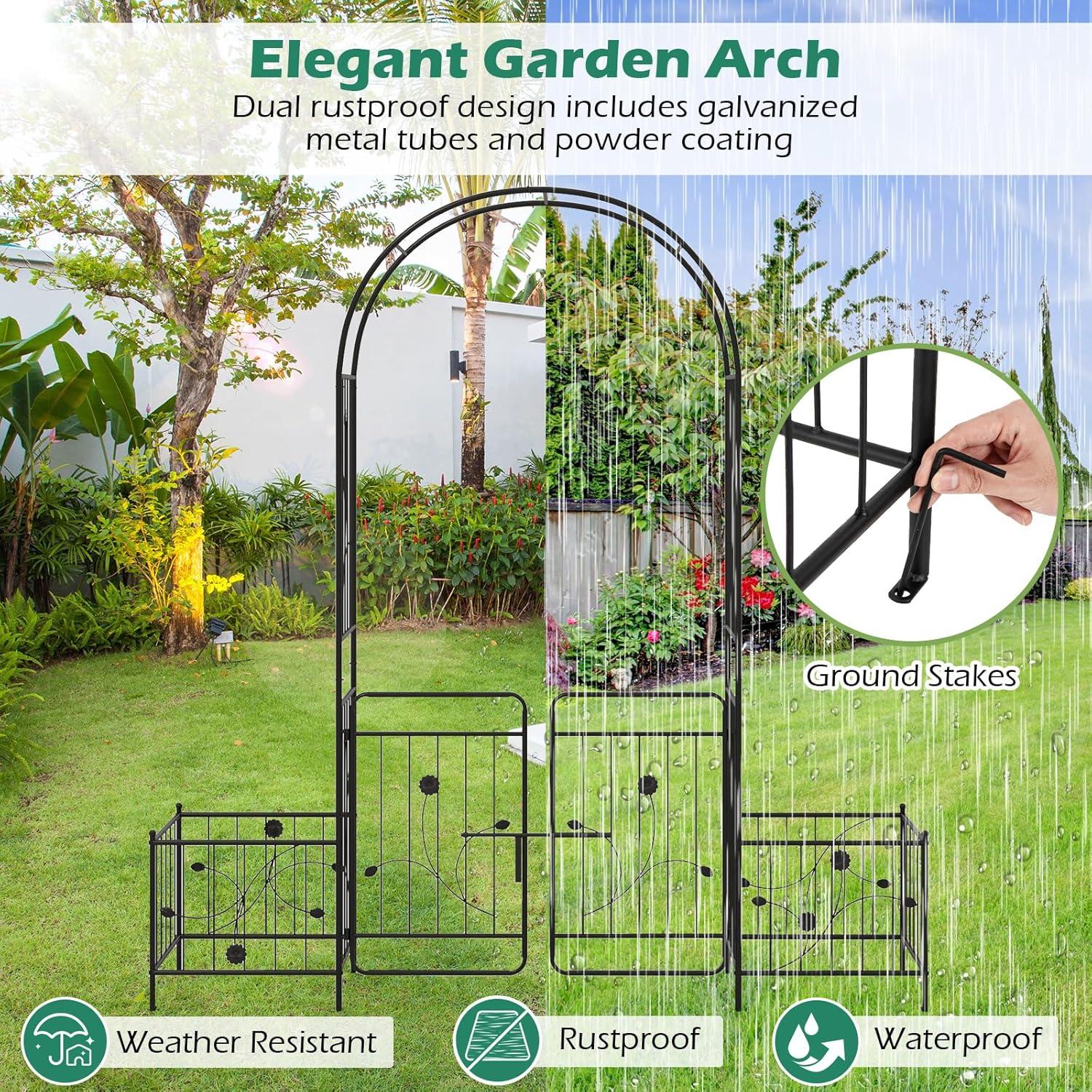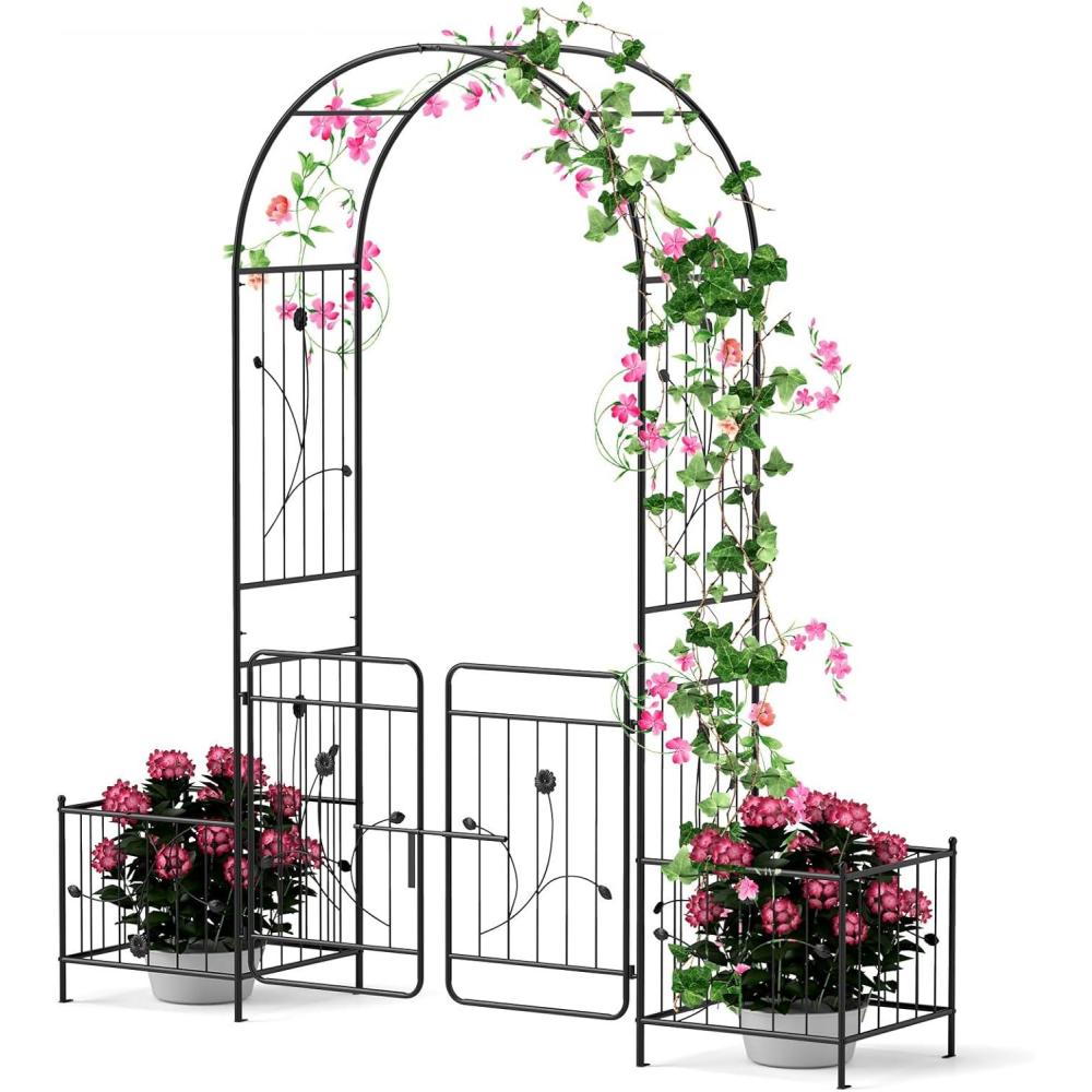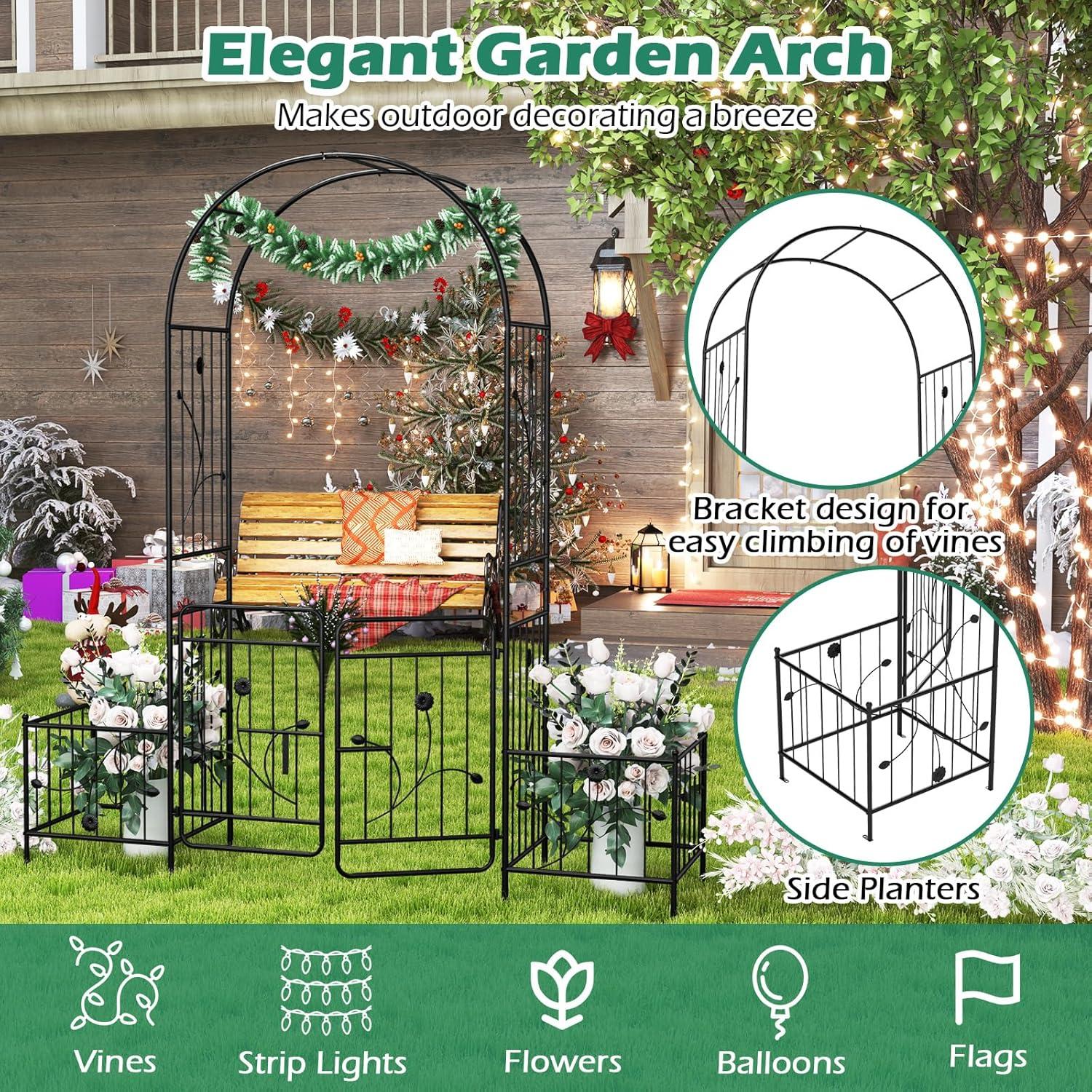 Giantex Garden Arbor with Gate, 7.5FT Metal Arch Trellis for Climbing Plants Rose Ivy, Archway Pergola with Flower Door, 4 Stakes, Garden Arch for Wedding Ceremony Bridal Party Decoration(Planters)