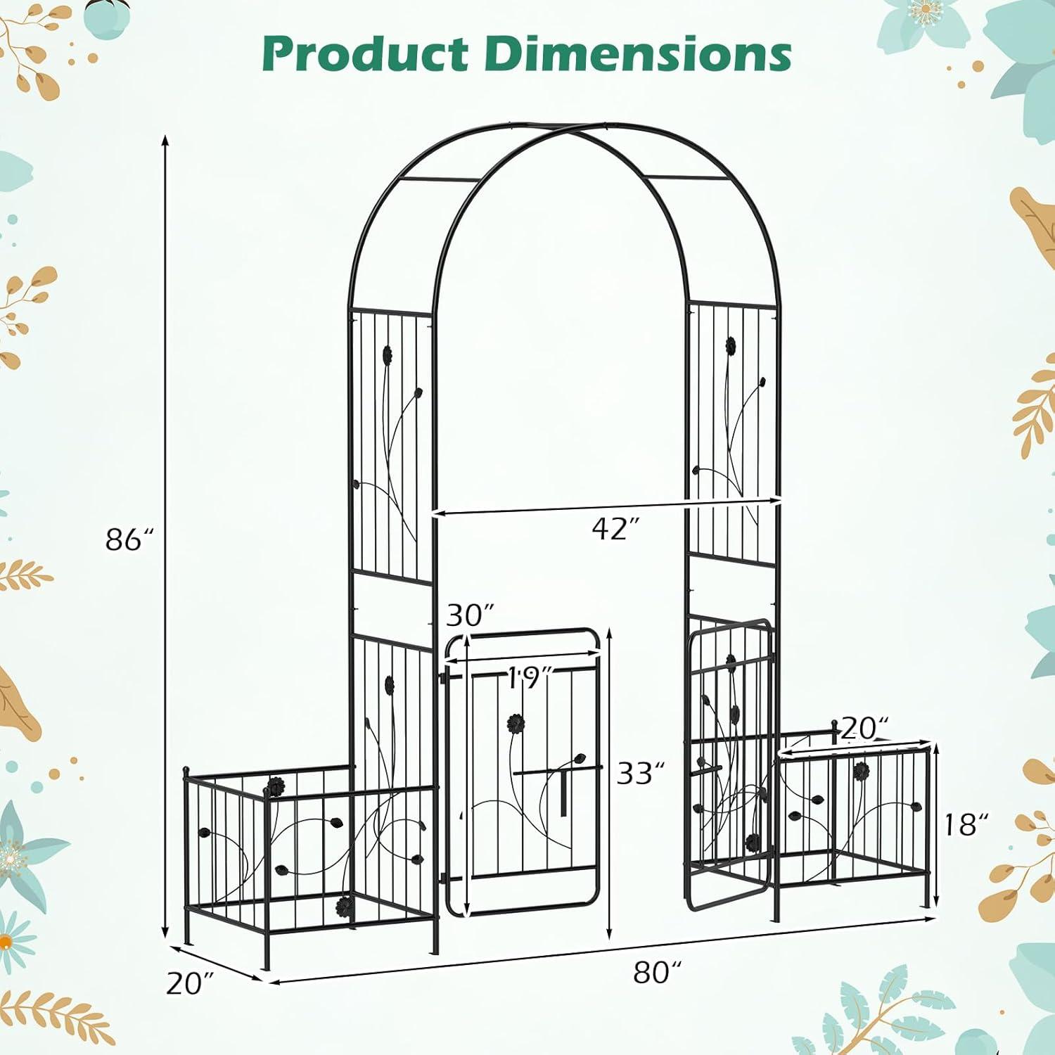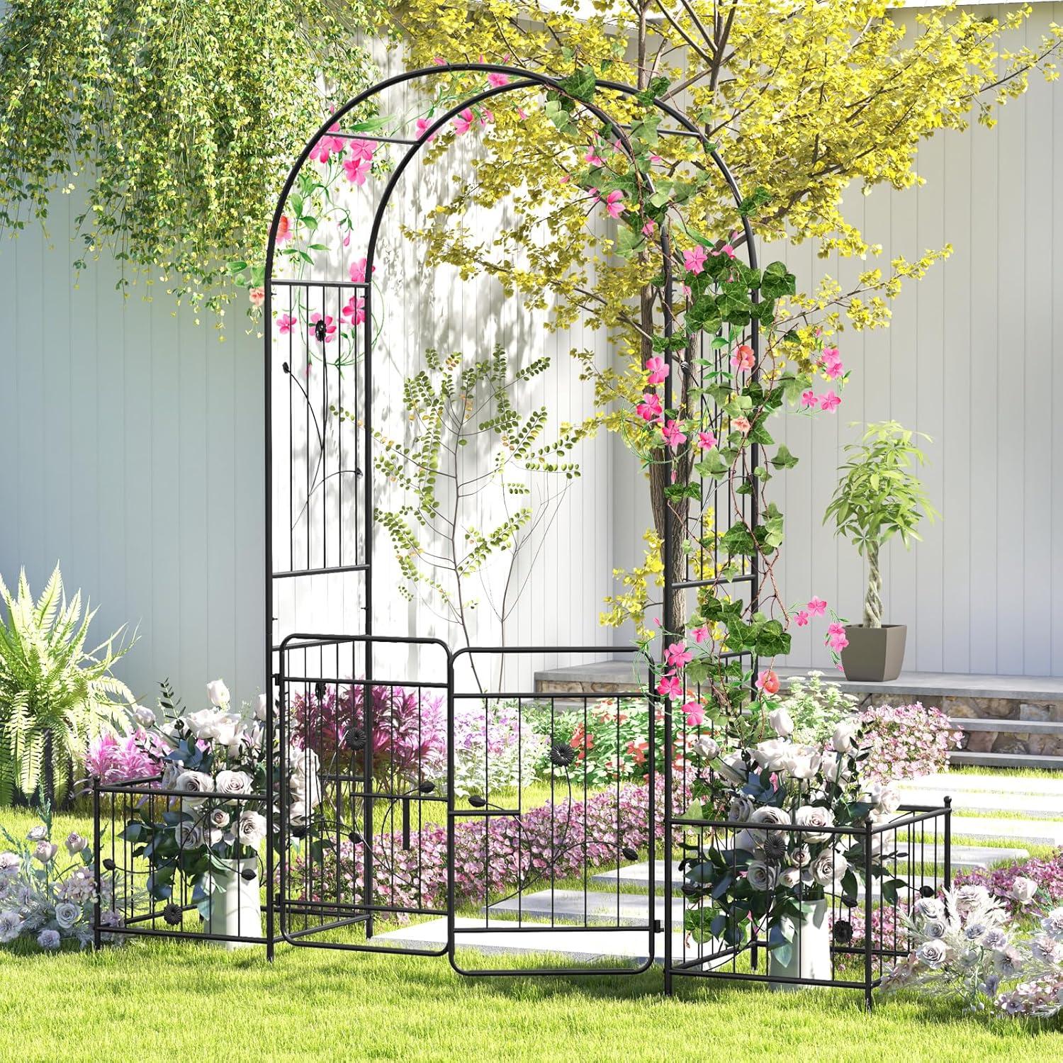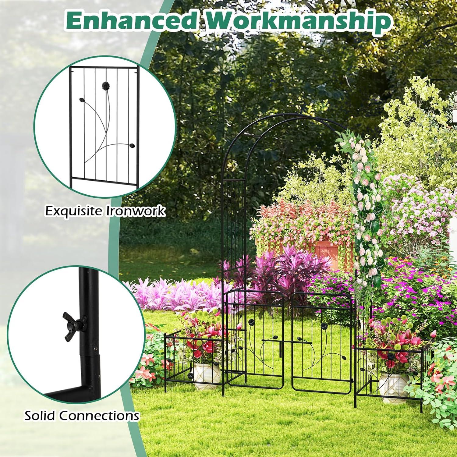 Giantex Garden Arbor with Gate, 7.5FT Metal Arch Trellis for Climbing Plants Rose Ivy, Archway Pergola with Flower Door, 4 Stakes, Garden Arch for Wedding Ceremony Bridal Party Decoration(Planters)