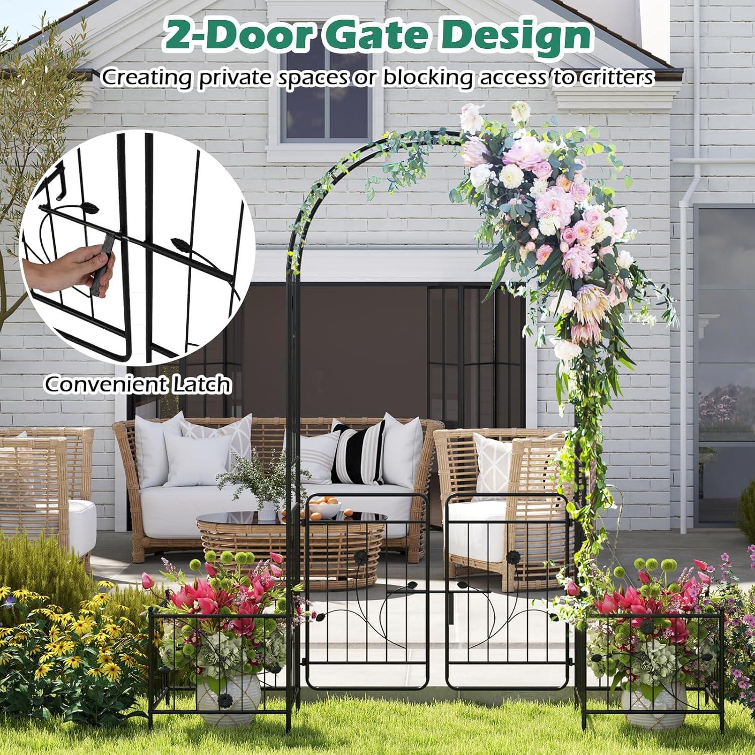 [Garden Arbor with Gate]: This versatile 2-in-1 garden arbor combines a decorative arch with a stylish gate, making it an ideal choice for creating an inviting entrance to your garden or courtyard. The latchable double-door gate allows you to secure sections of your yard when needed, adding both charm and functionality.