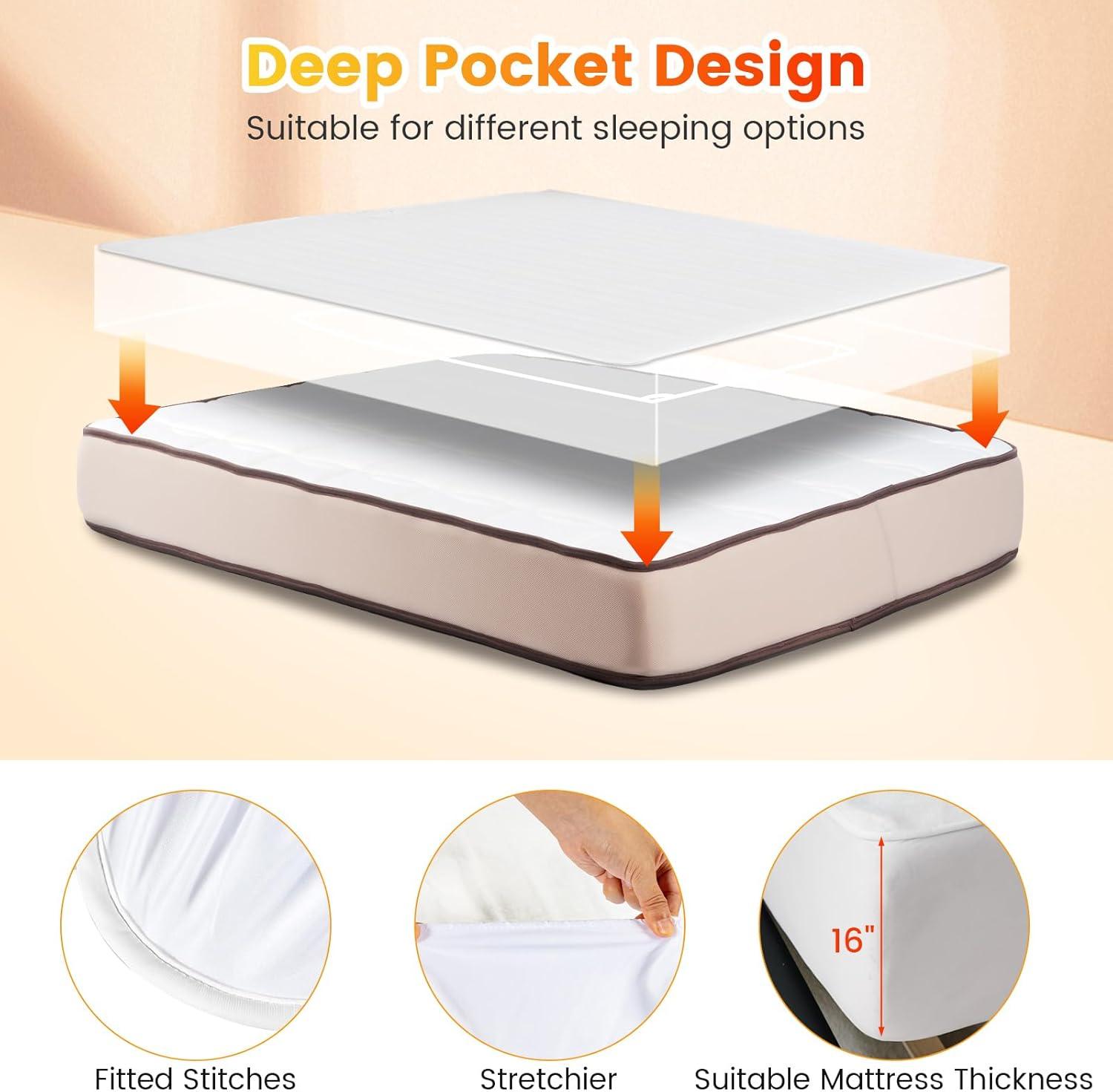Deep Pocket & Machine-washable Design: The bed warmer is designed with 16” deep pockets that fit most mattresses. The bed skirt will grab your mattress firmly with stretchable elastic band. The heating pad is machine washable, just unplug the power cord from the controller and throw it into the washing machine under 86℉ water temperature.