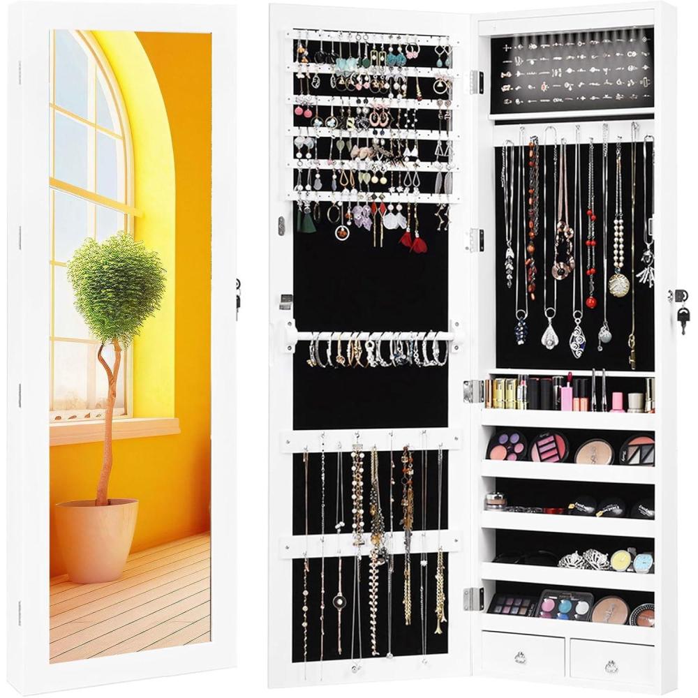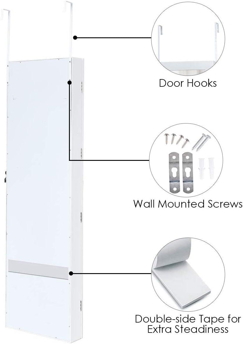 Giantex LED Jewelry Cabinet Wall Mounted Door Hanging, Lockable Jewelry Armoire with 47.2” Full Length Mirror, Foldable Makeup Tray, Lipstick Brush Holders, Jewelry Storage Organizer (White)(White)