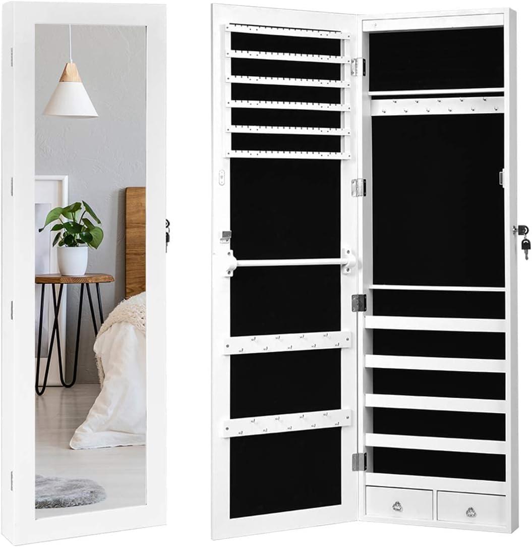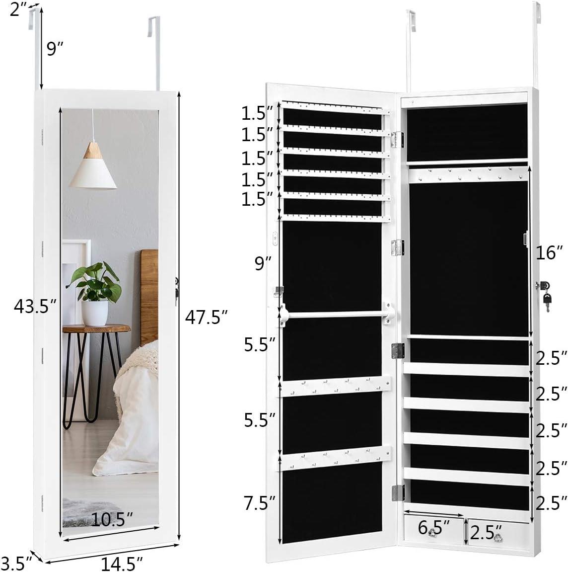Giantex Jewelry Armoire Cabinet Wall Mounted Door Hanging, Lockable Jewelry Cabinet with Full Length Mirror, 15 LED Lights, Large Storage Jewelry Box Organizers with 2 Drawers (14.5″W x 4″D x 47.5″H)(14.5″W x 3.5″D x 47.5″H)