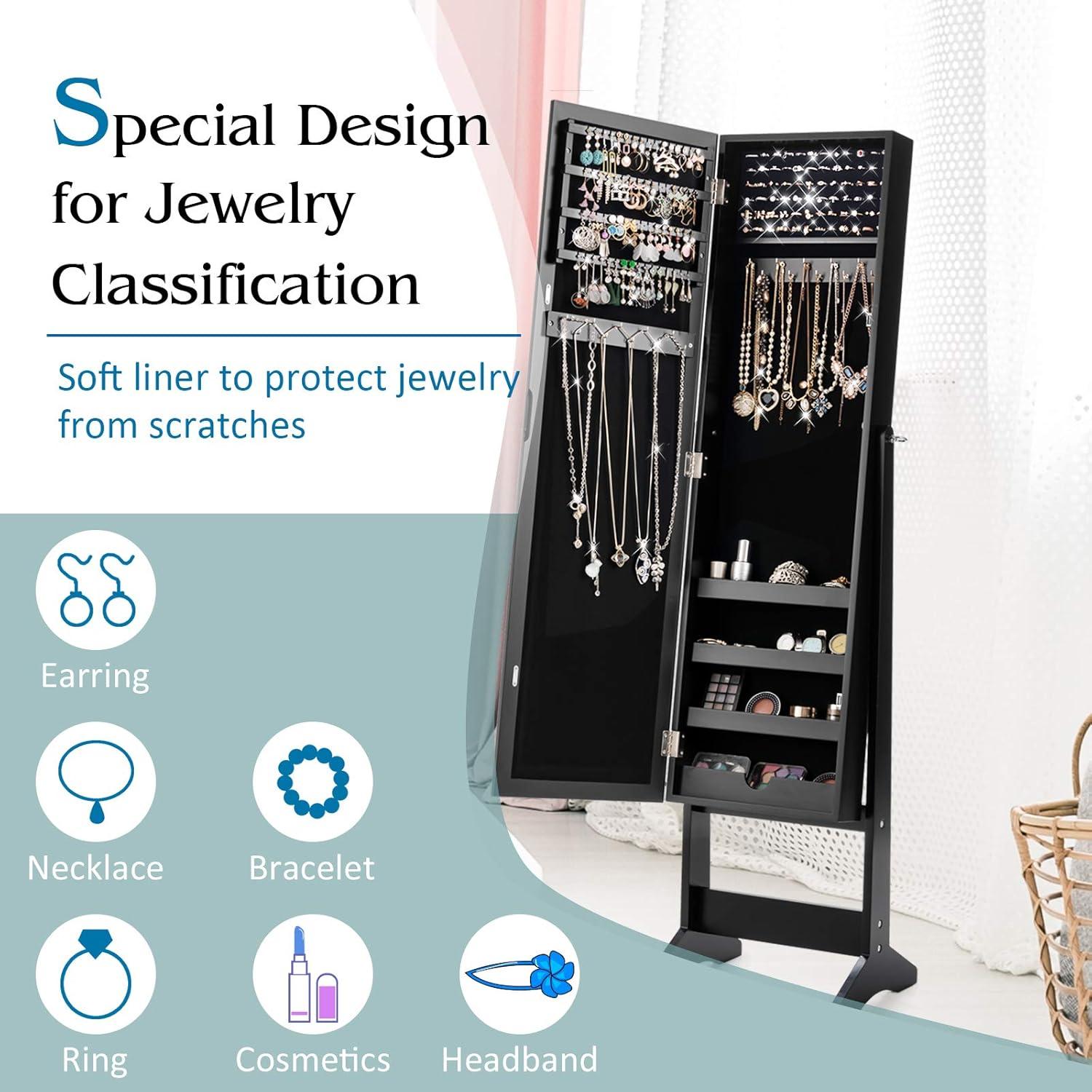 [Additional Protection]: The protective black fabric lining prevents your jewelries from being scuffed and scratched. And magnetic stopper keeps your treasures in an enclosed space for safety. With slim design and elegant style, the super functional jewelry armoire is perfect for bedroom, bathroom, cloakroom, etc.