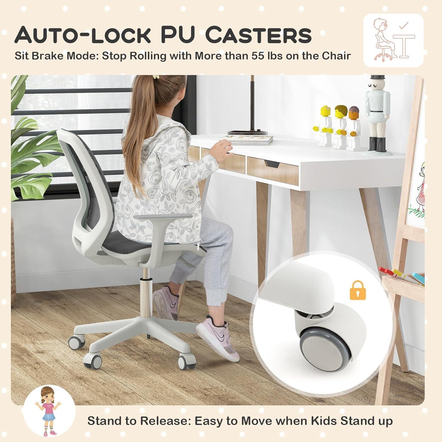 [360° Rolling with Sit-Brake Wheels] Equipped with a sturdy five-star base and 360-degree swivel wheels, this kids computer chair enables smooth and effortless movement. The innovative sit-brake mechanism locks the wheels when seated and unlocks them when standing. The wheels automatically lock when the weight exceeds 55 pounds, ensuring stability during use.