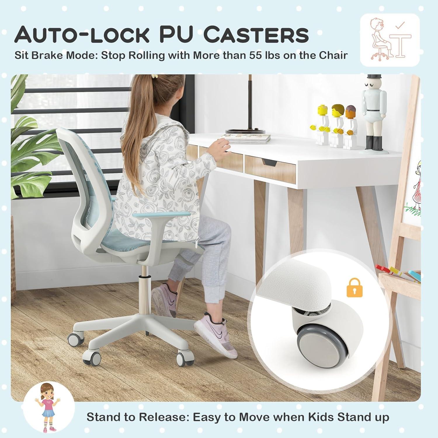 [360° Rolling with Sit-Brake Wheels] Equipped with a sturdy five-star base and 360-degree swivel wheels, this kids computer chair enables smooth and effortless movement. The innovative sit-brake mechanism locks the wheels when seated and unlocks them when standing. The wheels automatically lock when the weight exceeds 55 pounds, ensuring stability during use.