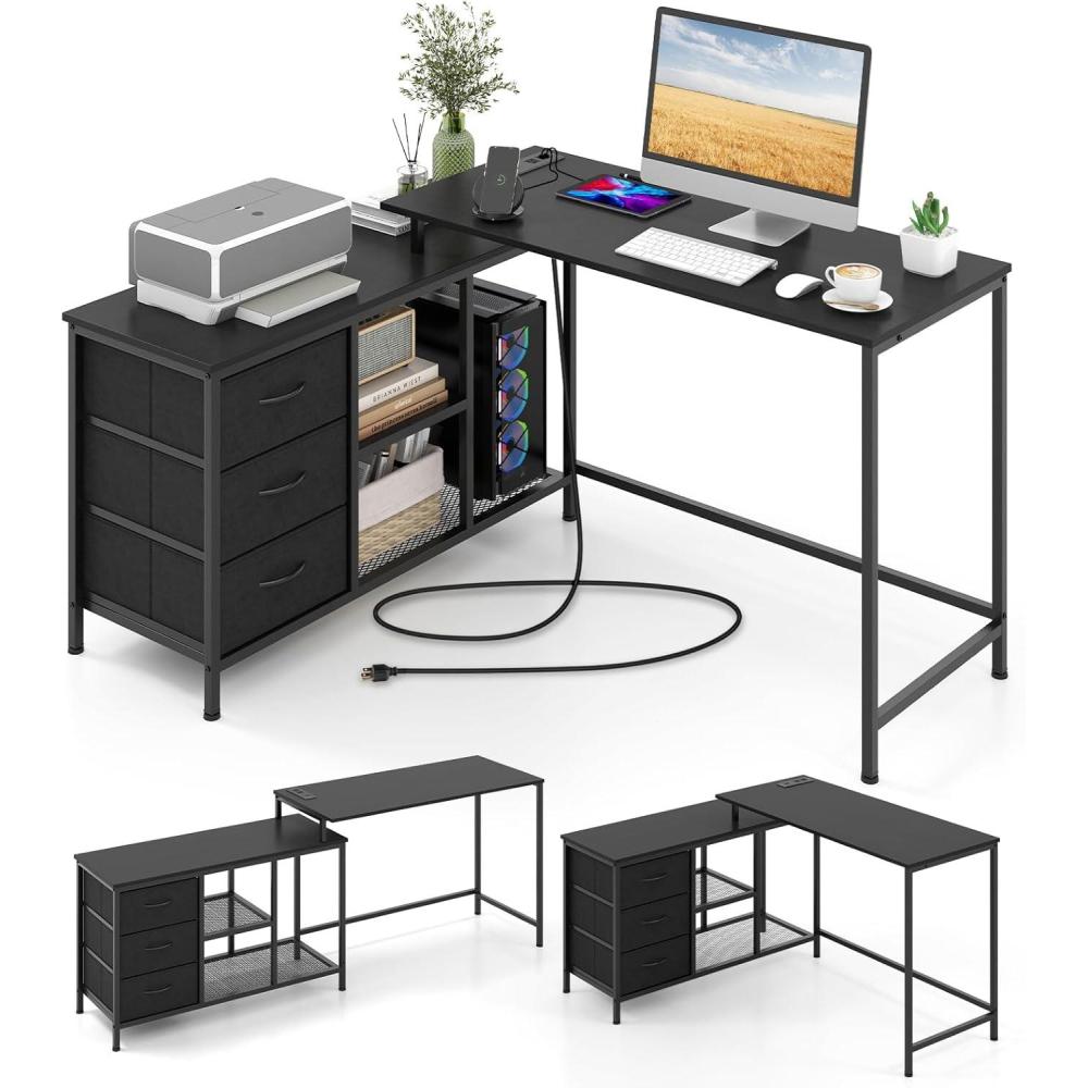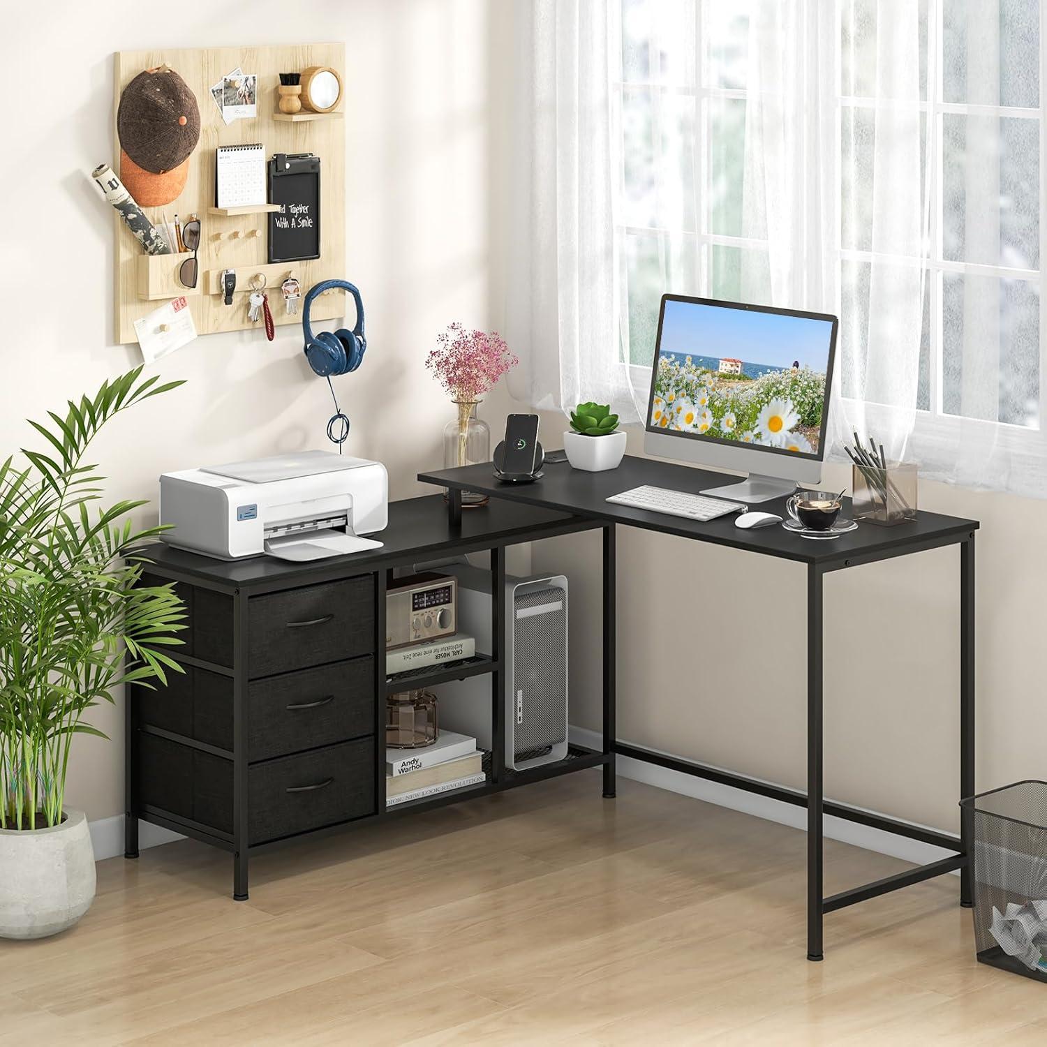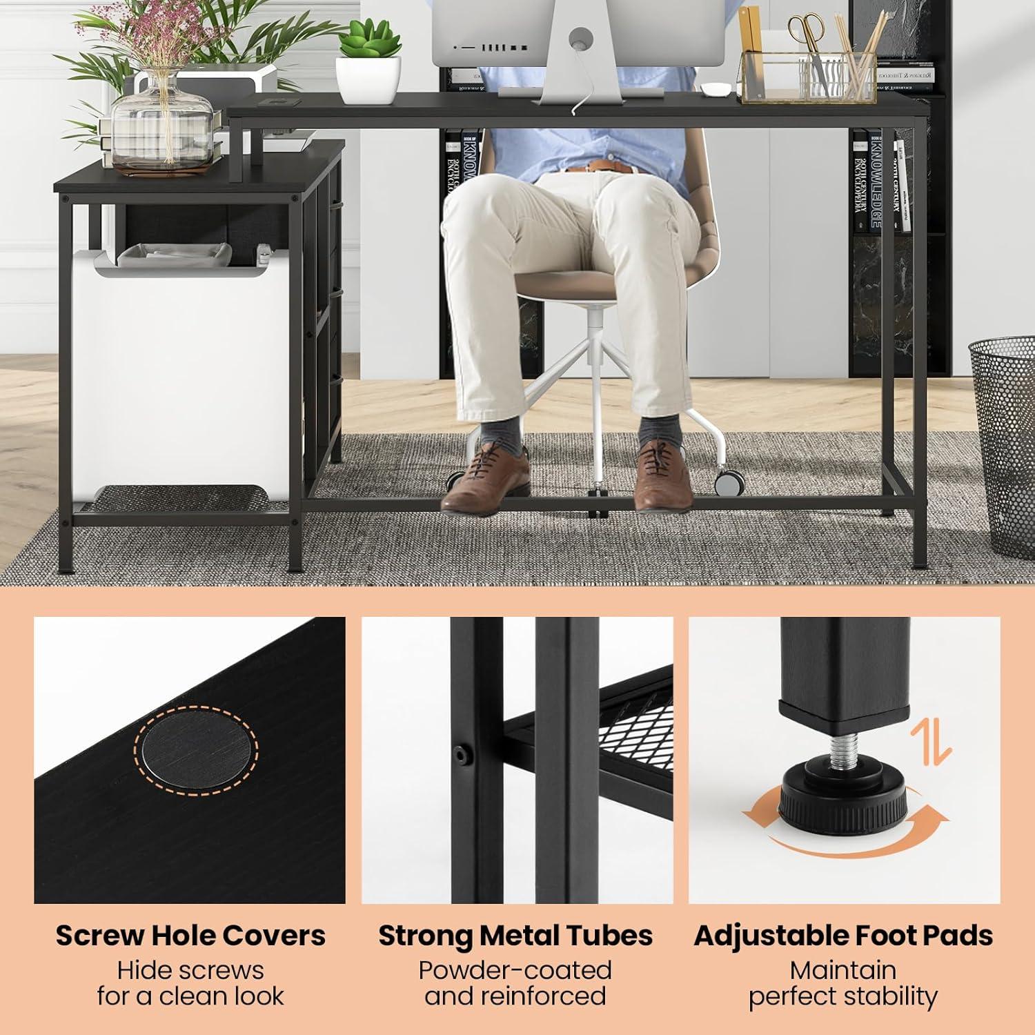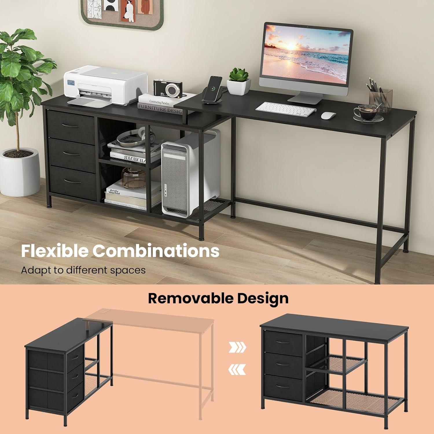 Step into your personal work paradise with the vibrant L-shaped computer desk. Whether you prefer a straight desk or an L-shaped office desk, it has got you covered. Also, with its detachable tall tabletop, you have the freedom to create a smaller study writing desk. It offers roomy space for working and large storage of printers and stationery. With 3 removable drawers, 2 shelves, and a multi-functional host stand, this workstation desk can keep everything within reach. Say goodbye to tangled cords and dead batteries, as this computer desk is equipped with 2 AC outlets and 2 USB ports for convenient charging. Built with a reliable metal frame and adjustable foot pads, it offers unparalleled stability. The L-shaped design allows for efficient multitasking, making it perfect for computer work, writing, reading, or engaging in creative pursuits.