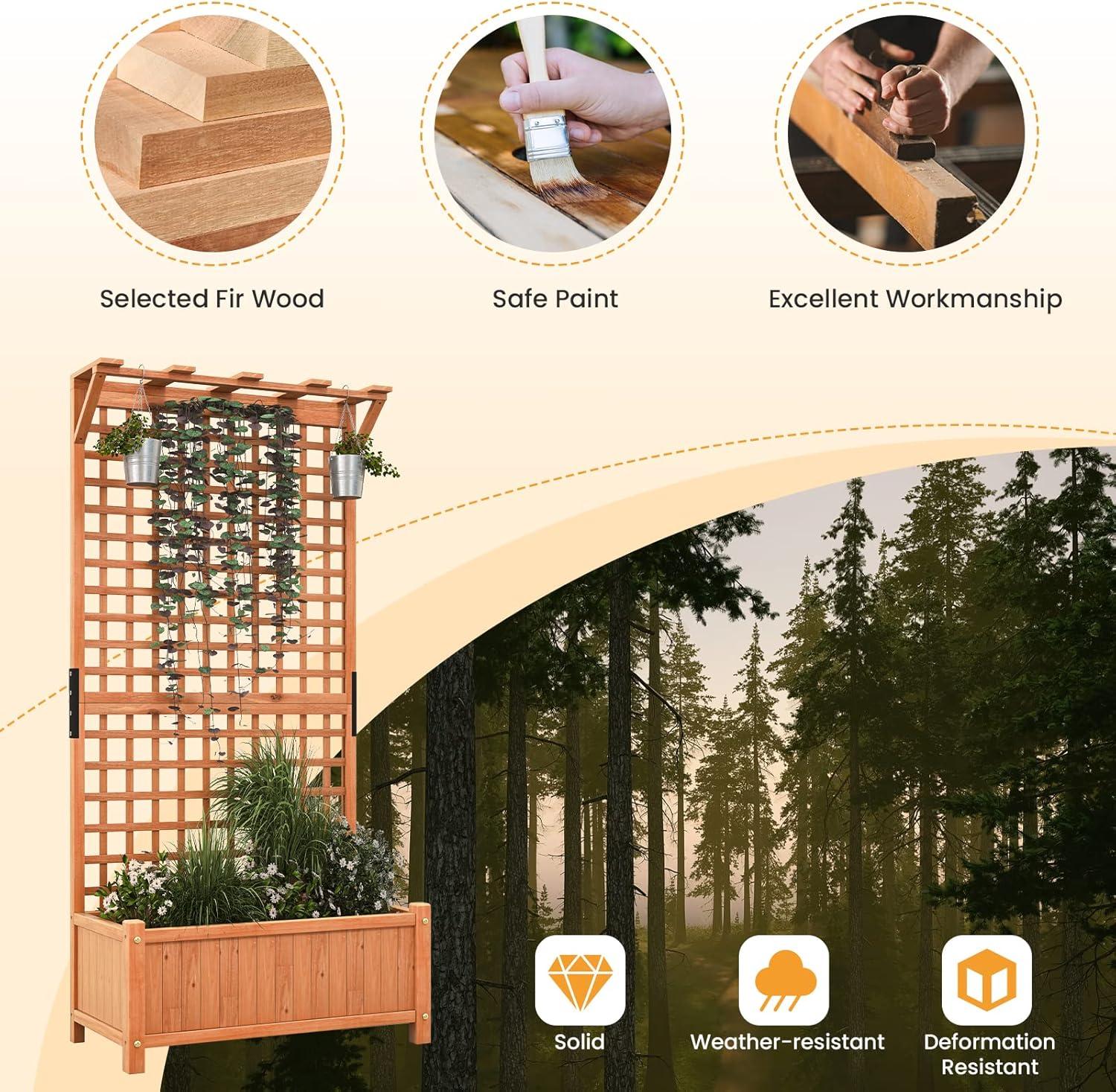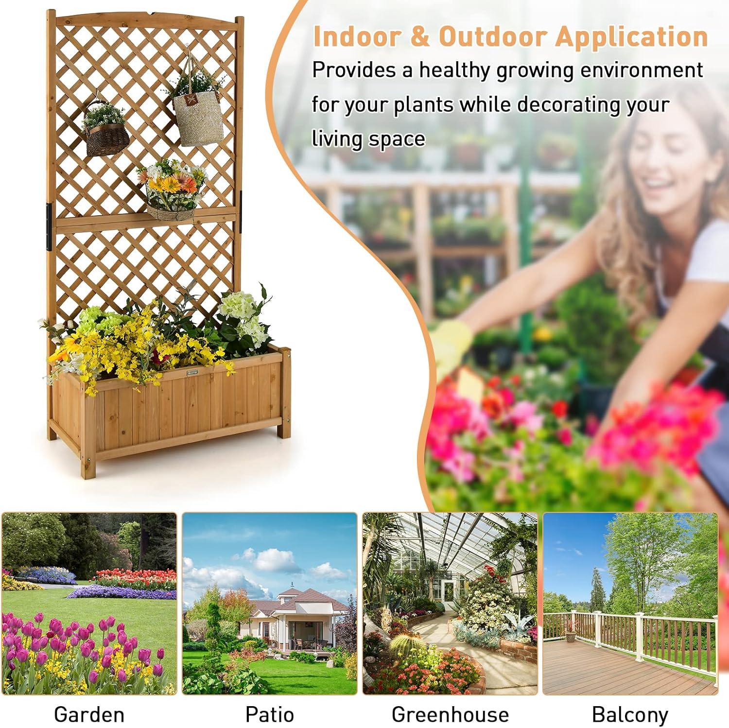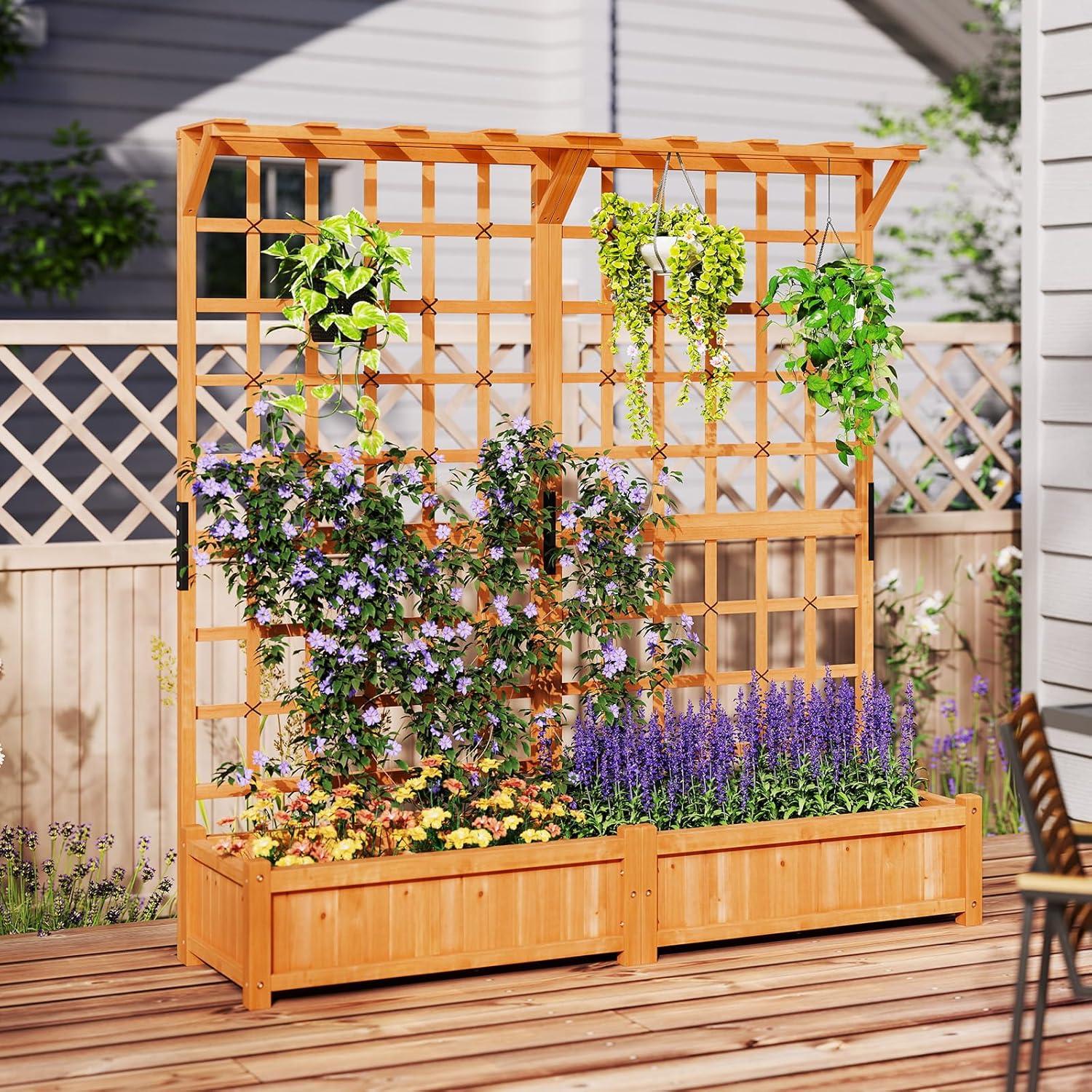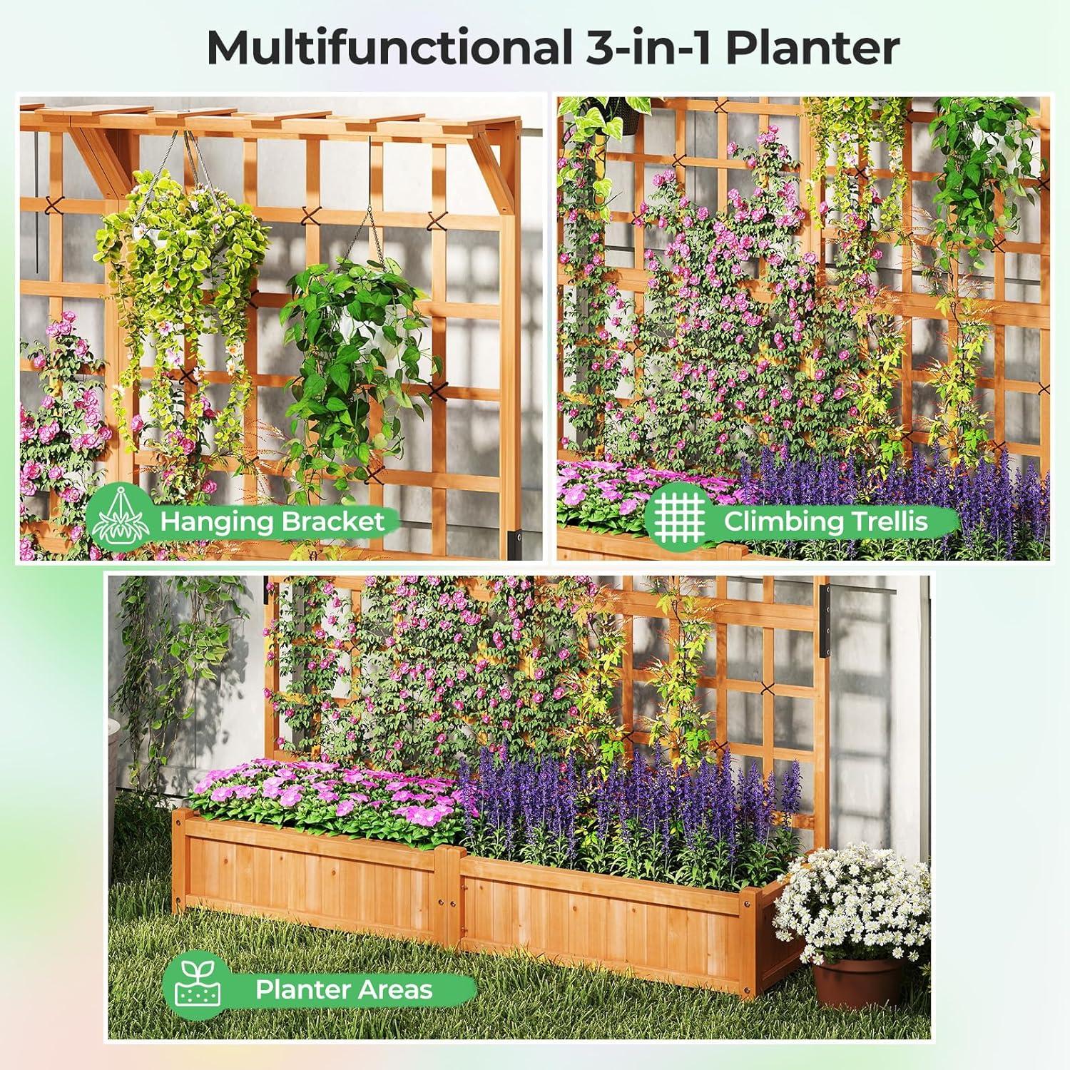 [Multifunctional 3-In-1 Planter]: Dive into versatile gardening with our raised garden bed featuring a lattice trellis, planter areas, and a handy hanging bracket. Grow climbing plants like tomatoes and jasmine, or hang your favorite potted flowers for a delightful display.