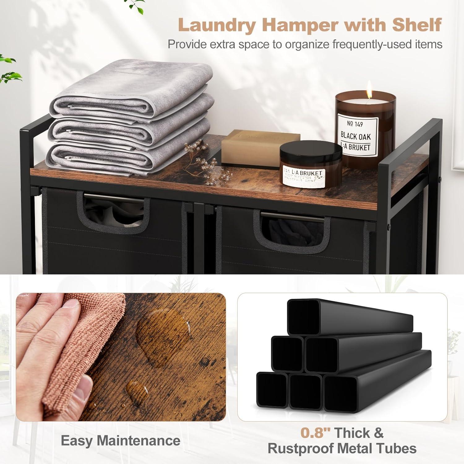 Giantex Laundry Hamper with Shelf, Laundry Basket Organizer with 3 Pull-Out Removable Bags, Top Storage Shelf, Metal Frame, Laundry Sorter 3 Section for Laundry Room Bathroom, Rustic Brown & Black