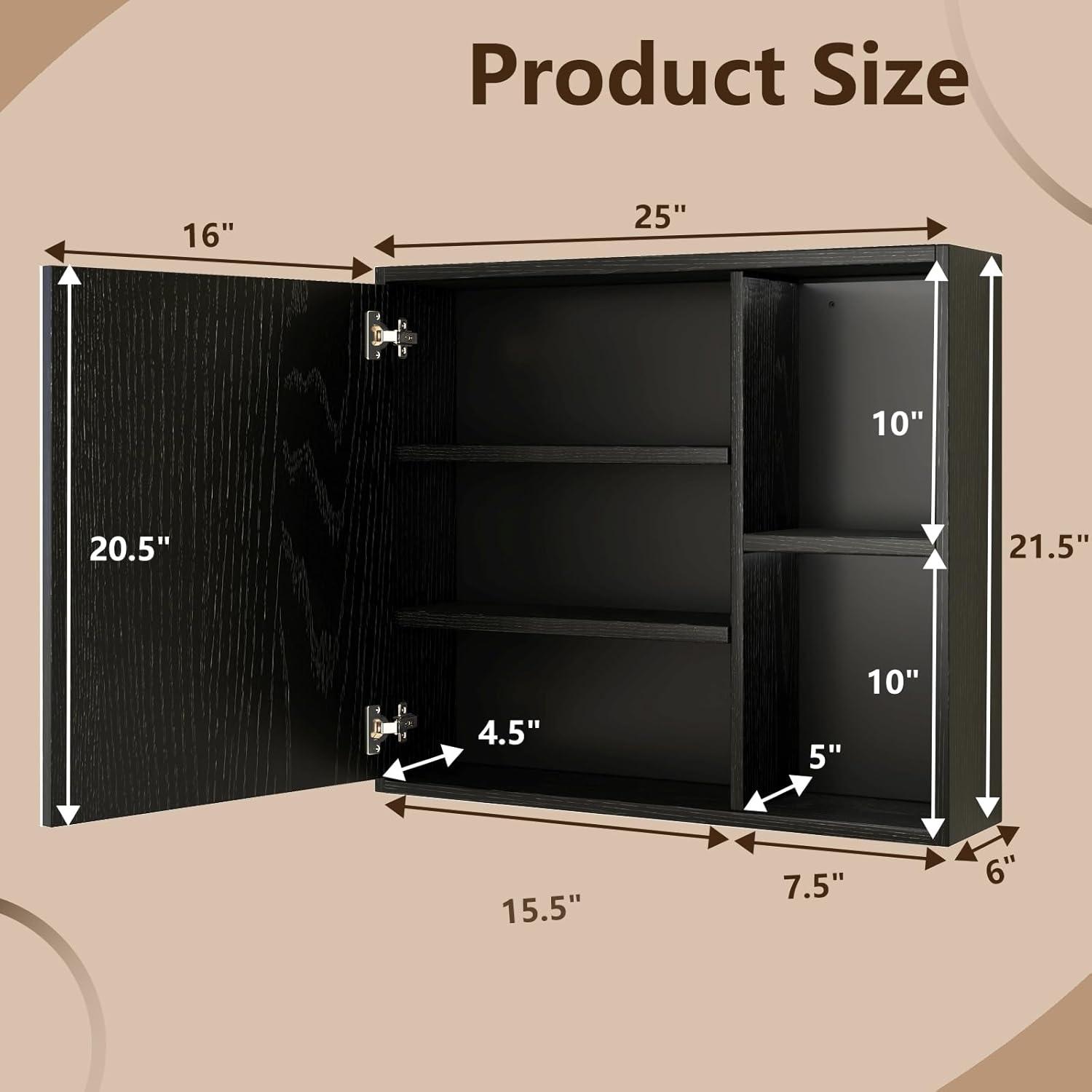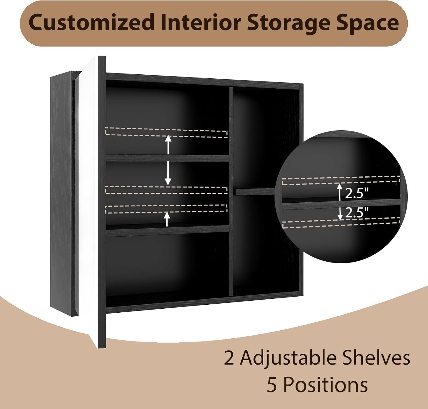 [5-Level Adjustable Shelves]: The wall mounted cabinet boasts 2 adjustable shelves behind the door, offering 5 height positions for personalized storage. The distance of each level is 2.5″. You can also remove the active shelf for more storage space.