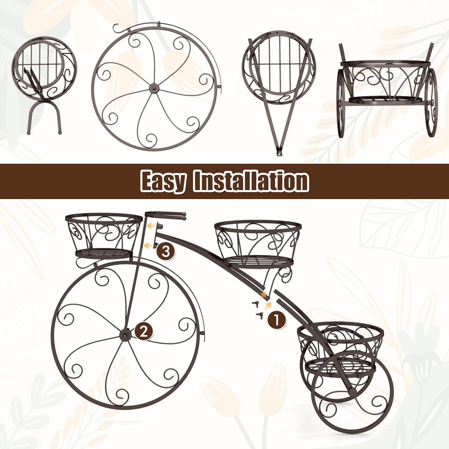 Giantex Metal Bicycle Planter, 3 Tier Tricycle Flower Plant Stand w/ 3 Decorative Wheels, Parisian Style Flower Display Stand Cart for Home Decor Patio Garden Flower Shop Indoor Outdoor(Bronze)