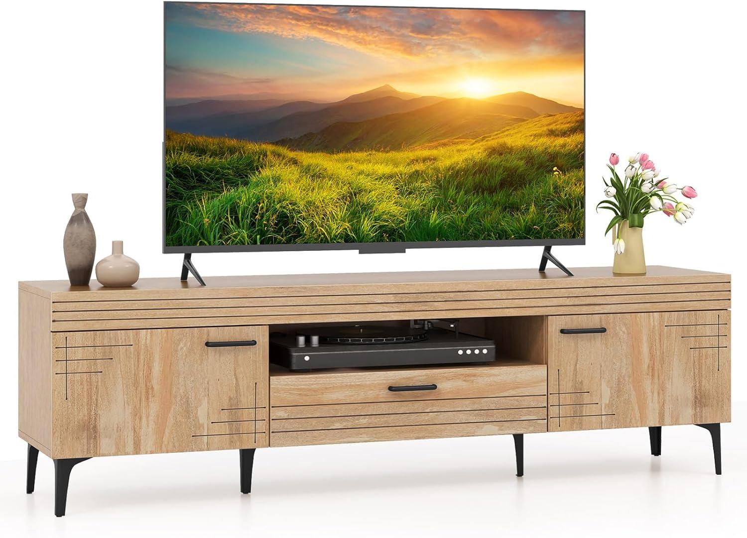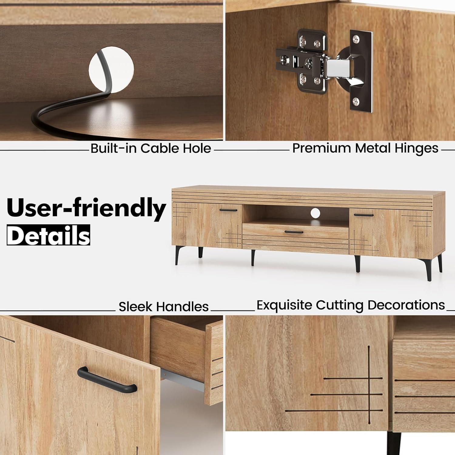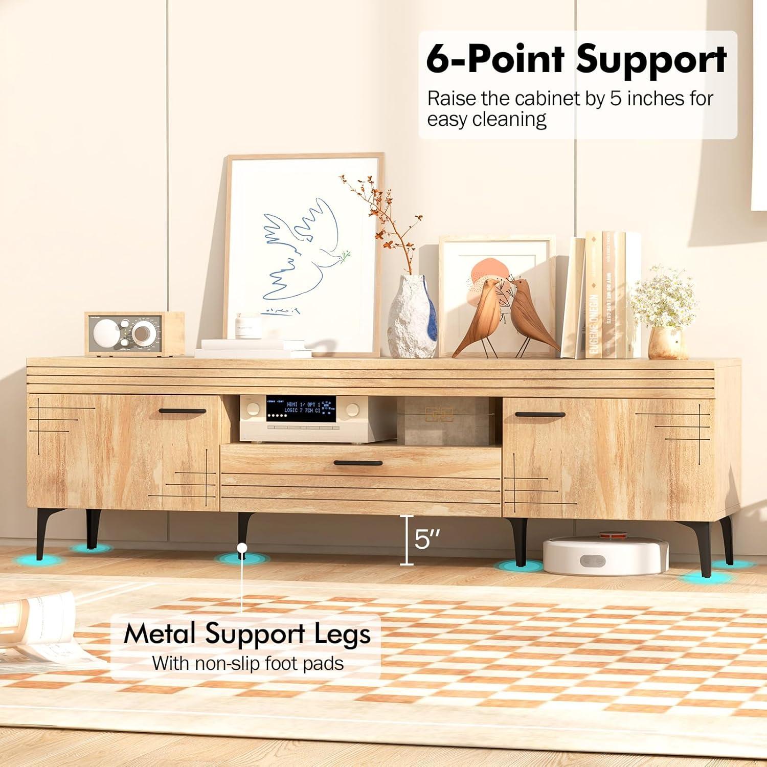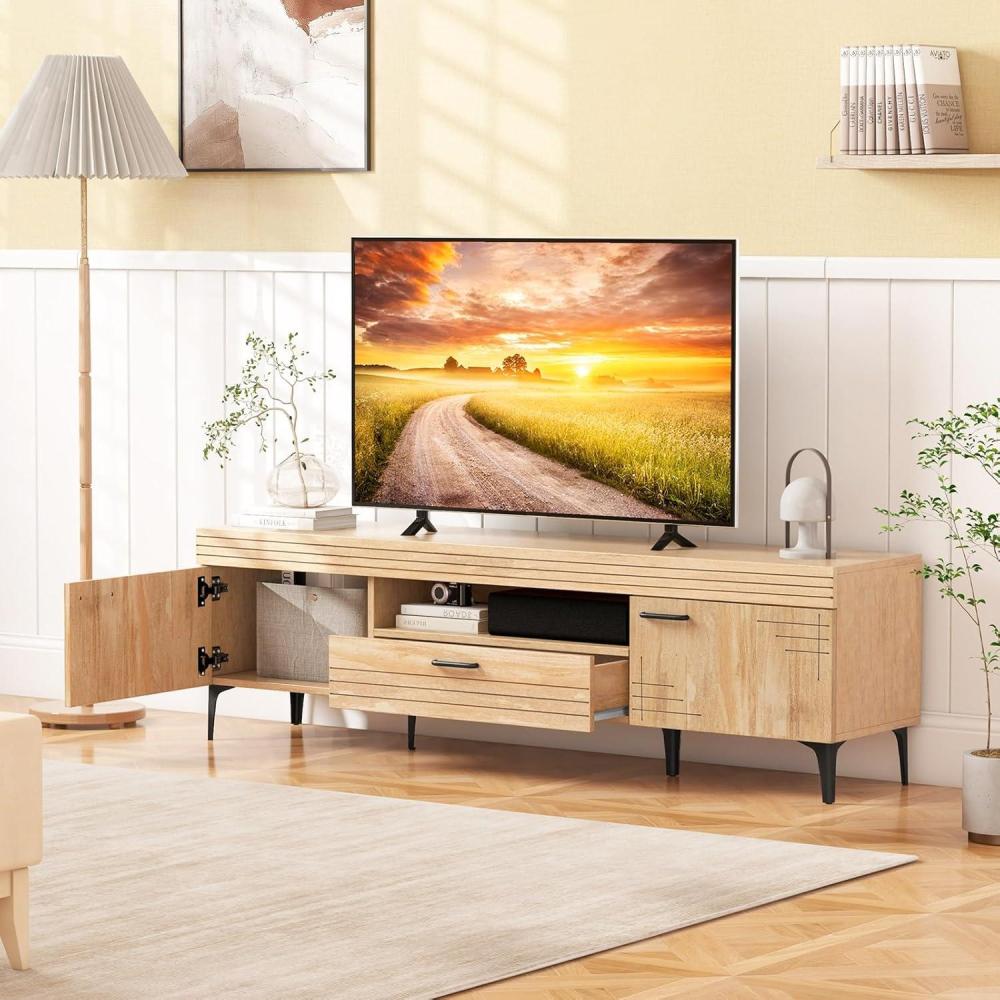Revitalize your living space with this stylish TV stand that seamlessly combines rustic charm with modern elegance! Designed to complement any decor style, this television stand accommodates TVs up to 65 inches and provides ample storage options with two side cabinets, a convenient drawer, and an open shelf. Enhance both the style and functionality of your room with 6 sturdy metal legs that ensure stability and provide a 5-inch clearance for easy cleaning underneath. Bid farewell to cable clutter with the handy cable management system. More than just a media console table, this TV cabinet acts as a stunning focal point in any room, making it perfect for your living space. Make this piece yours and give your entertainment area a chic and contemporary upgrade today!