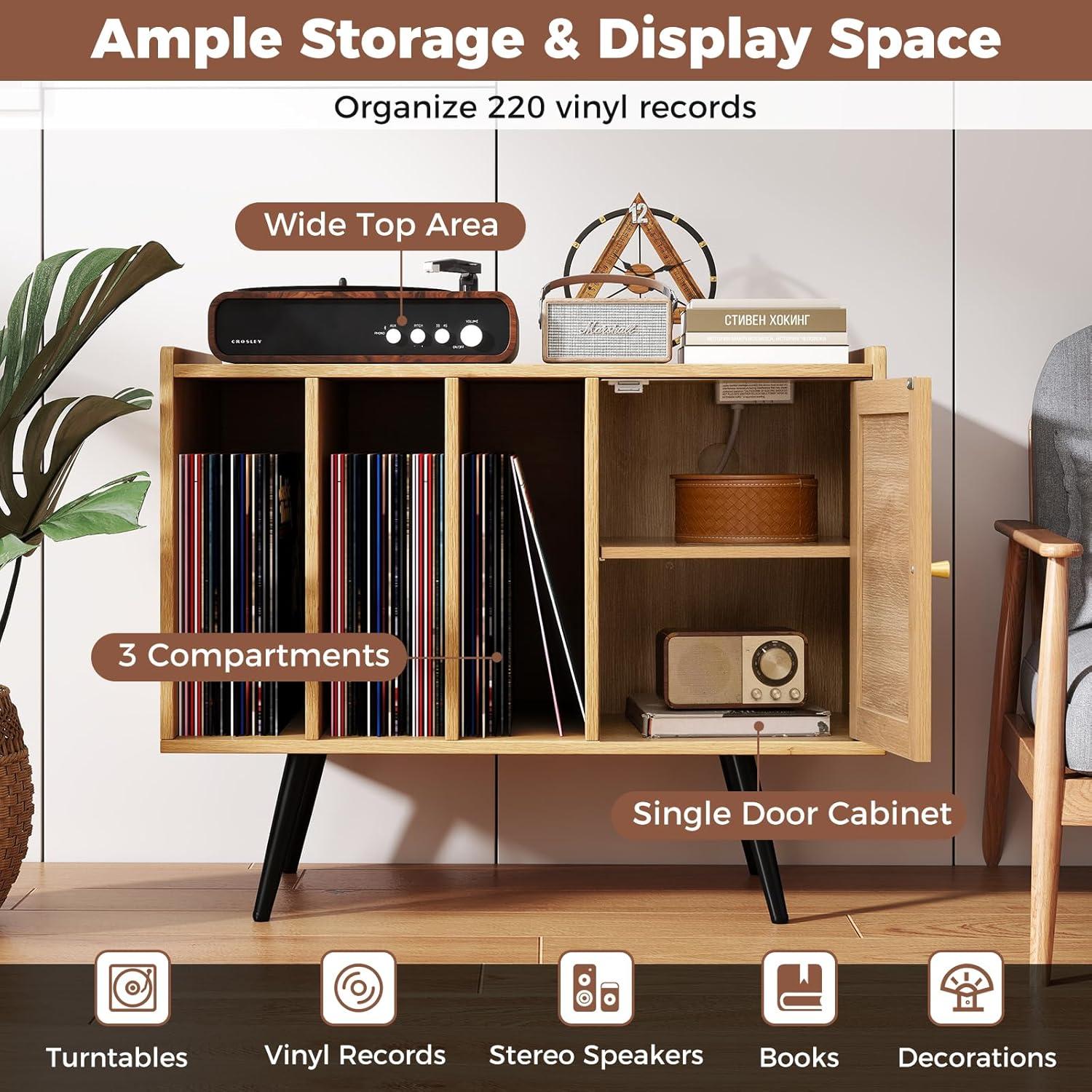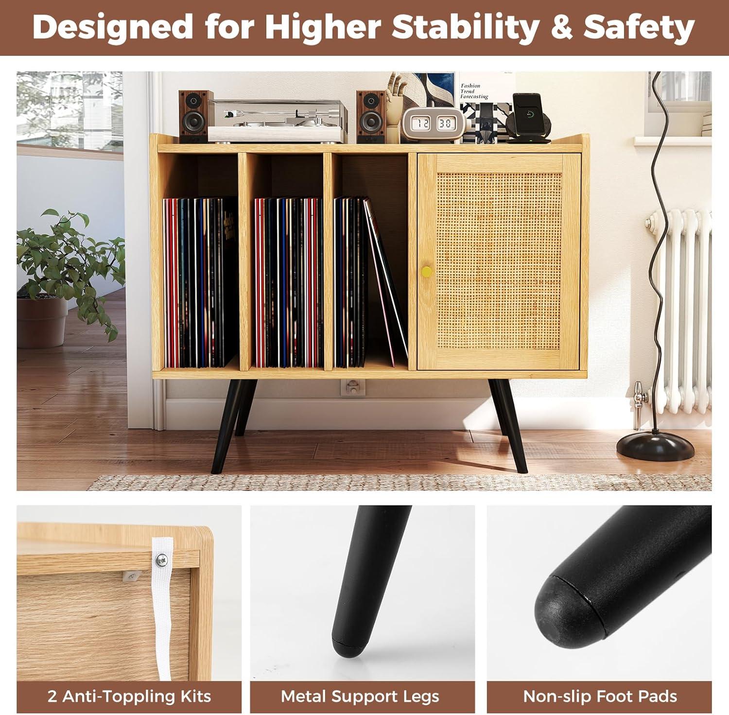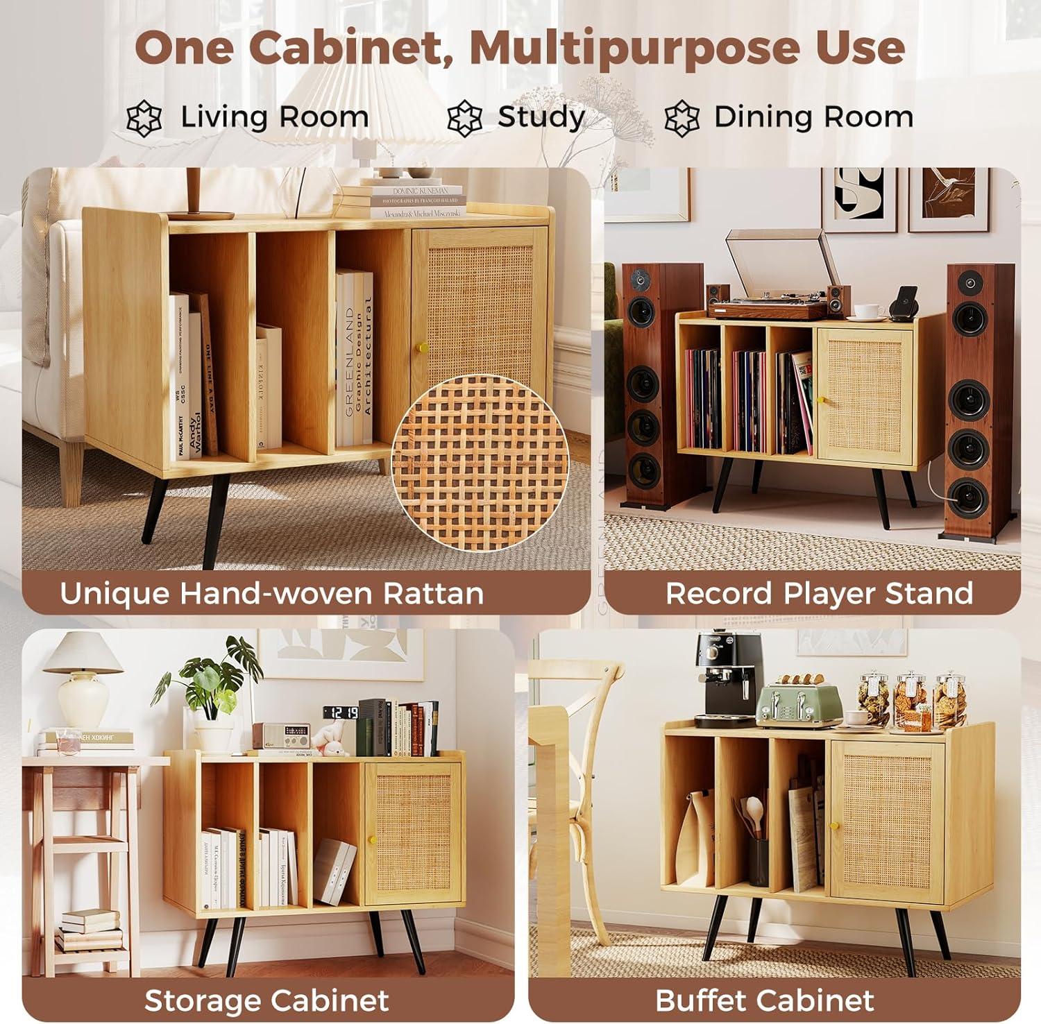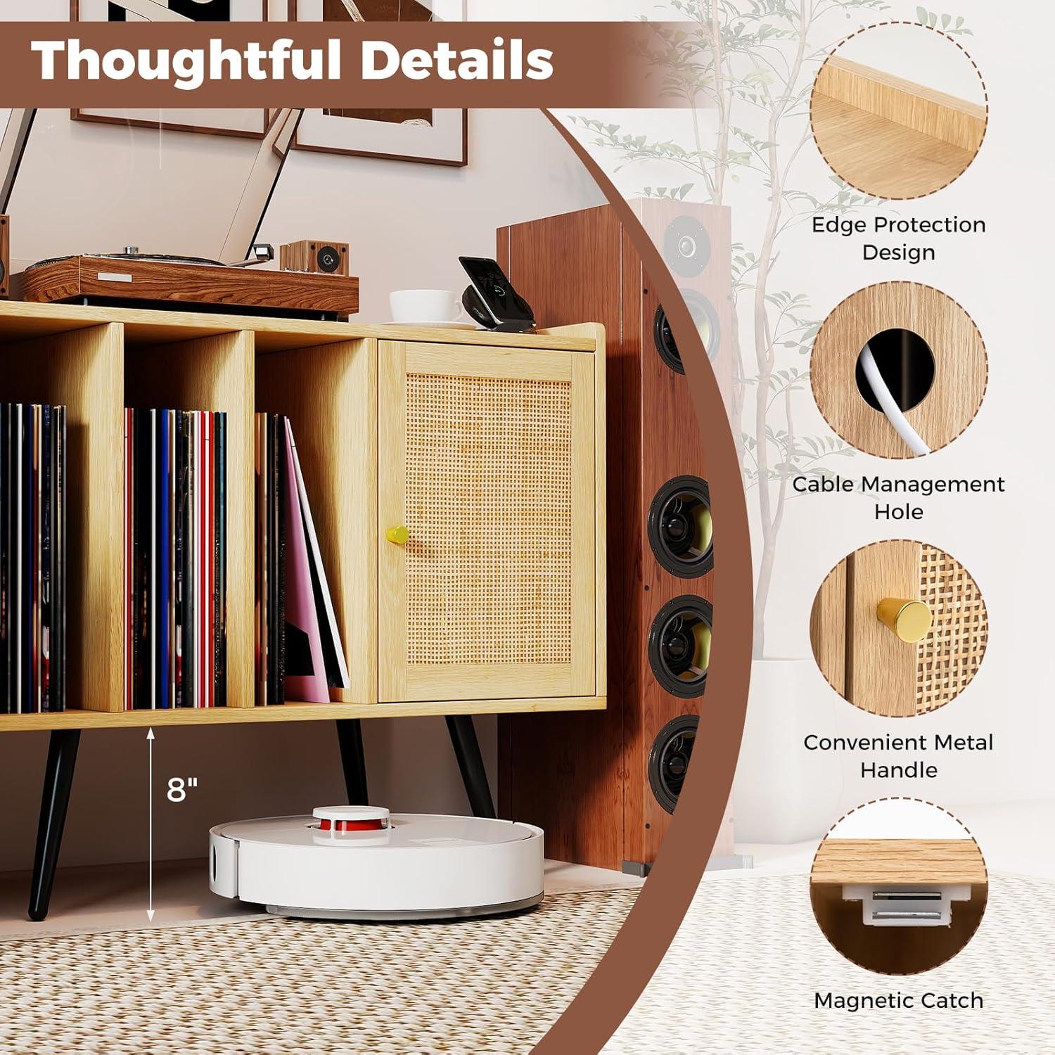 [Rattan Cabinet with Adjustable Shelf]: The cabinet features a 3-position adjustable shelf to easily fit items of different sizes. With a rattan-front design, the record storage table adds a natural and bohemian touch that complements any home style.