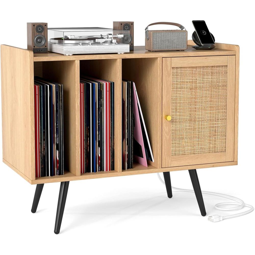 imageGiantex Mid Century Record Player Stand with Charging Station Rattan Turntable Stand with Storage Cabinet ampamp Adjustable Shelf Boho Record Player Table Vinyl Record Storage for Living Room BedroomNatural