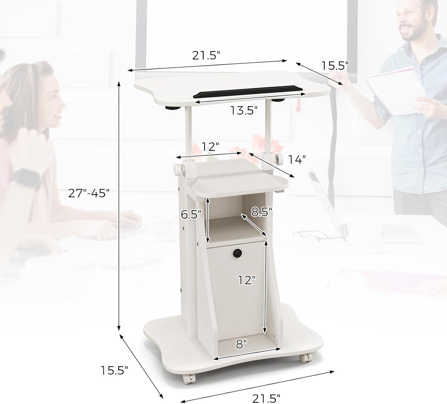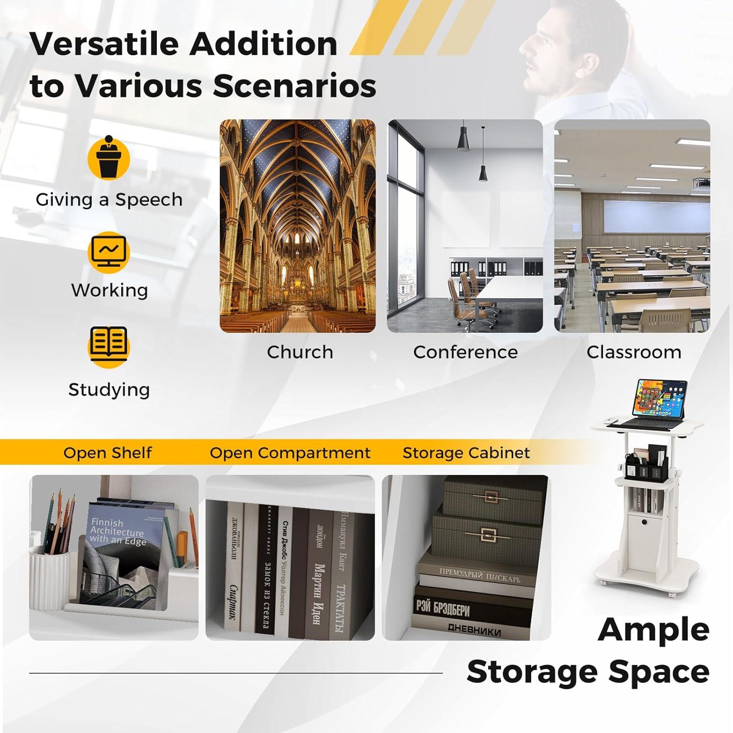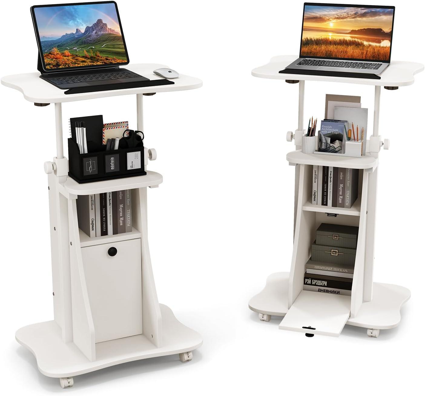Giantex Mobile Podium Stand, Sit-to-Stand Laptop Cart with Tilting Tabletop & Storage Cabinet, Lockable Casters, Height-Adjustable Rolling Lectern for Classroom, Church, Home Office (Black, 2 Pack)(White)