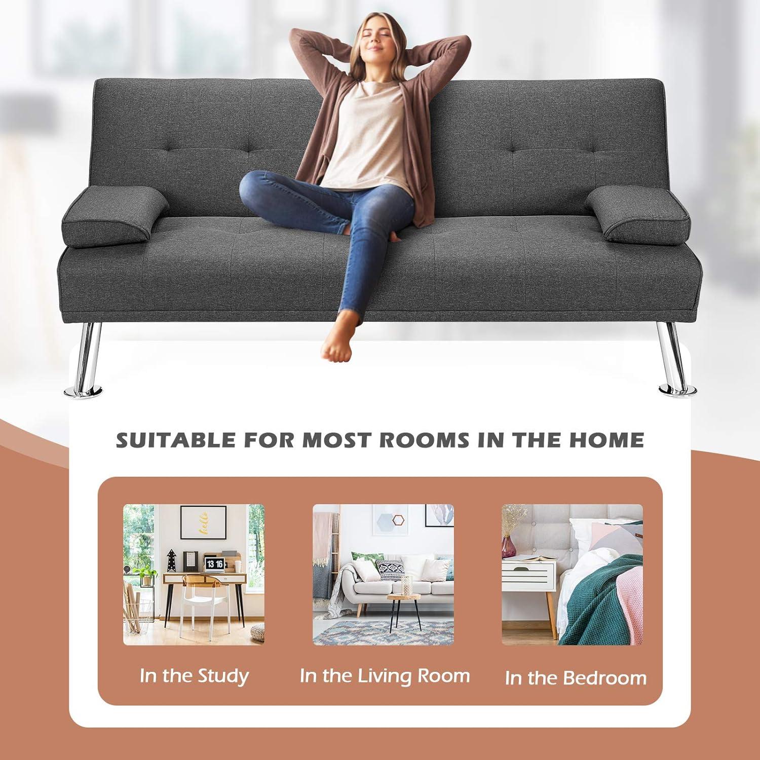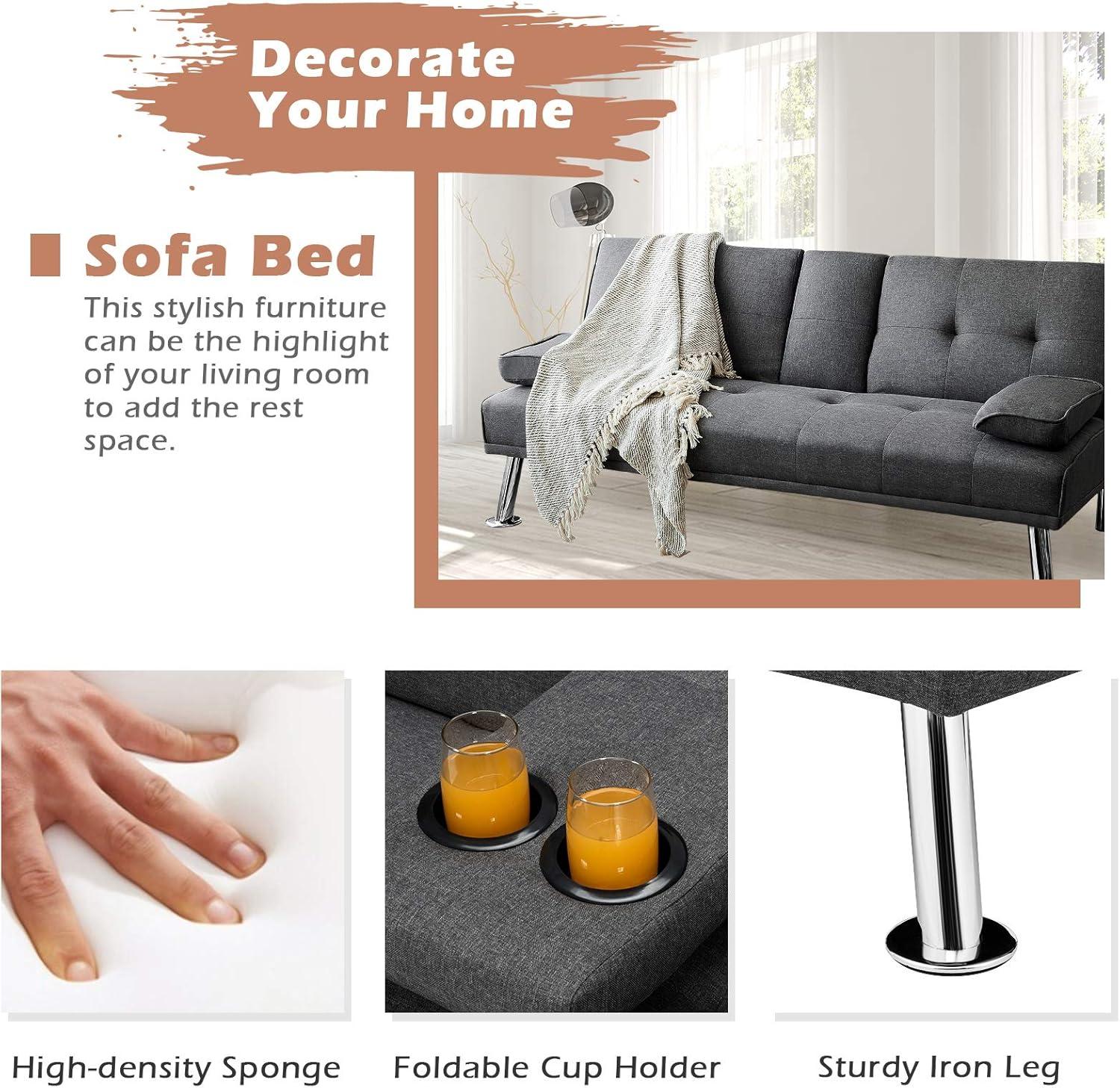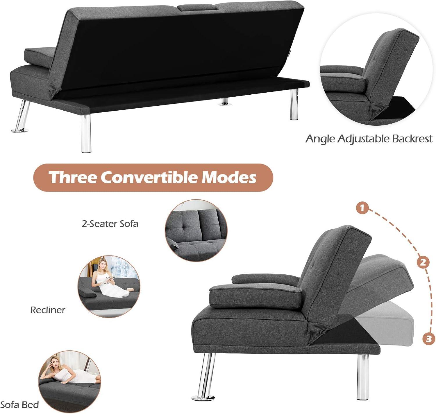 Giantex Modern Convertible Futon Sofa Bed, Linen Upholstered Futon Sofa Sleeper w/Metal Leg, Removable Armrests, 2 Cup Holders, Backrest Adjustable, Folding Futon Sofa Bed for Apartment (Dark Gray)